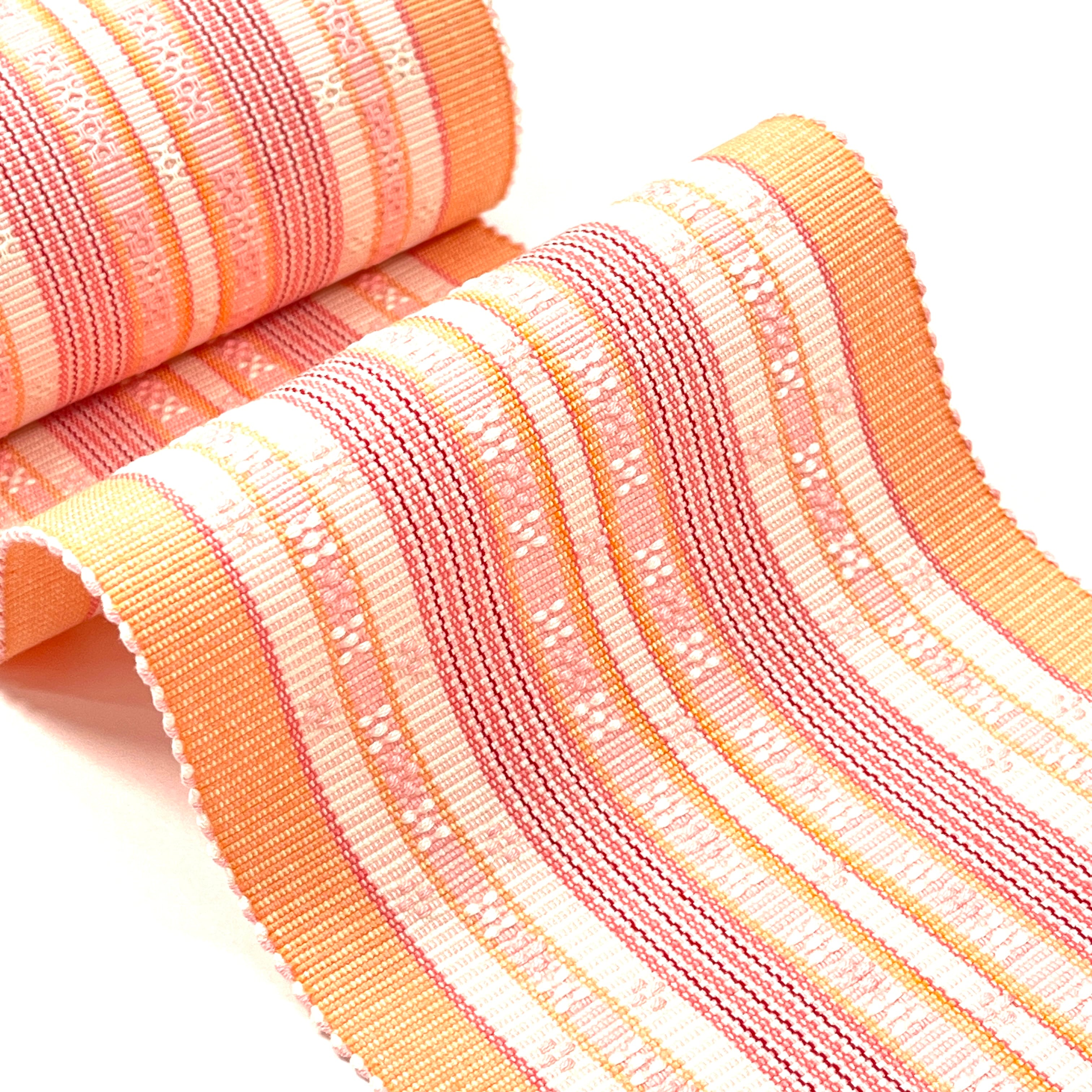 薄いオレンジ色、薄ピンクの糸で織られた地色の部分がピーチカラーに。赤と白と桃色の細縞の中並んだ小さい花織がまるで花畑のように可愛らしい『首里花織の半幅帯』です。