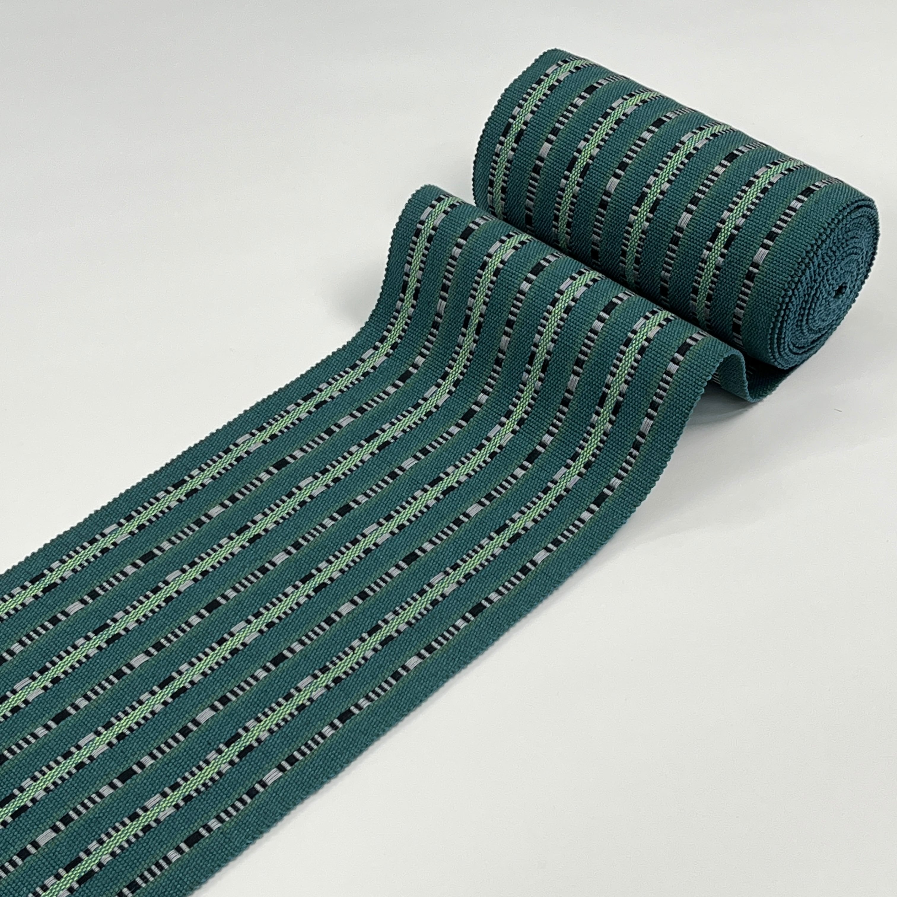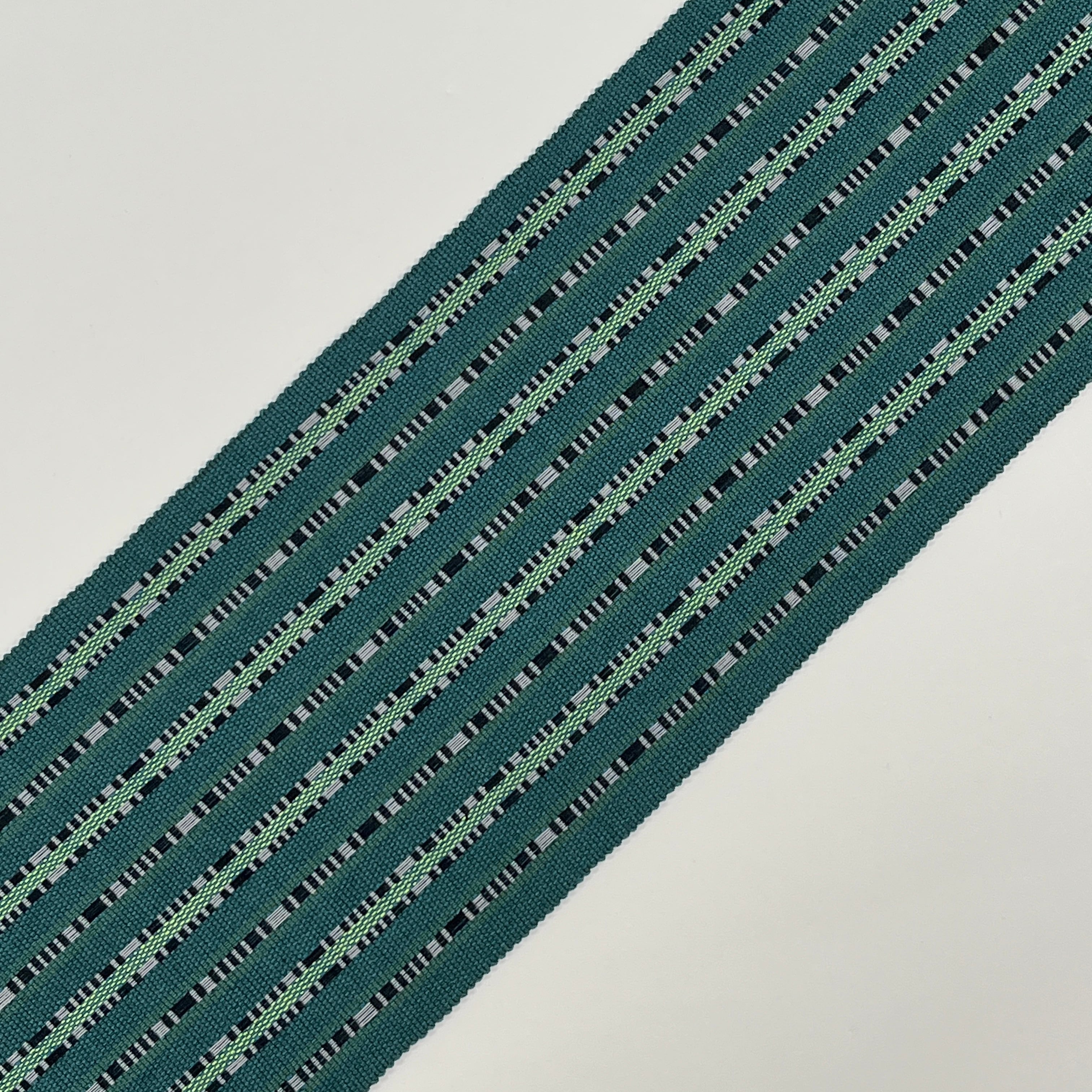 深緑をベースに、グレー、黒、黄緑といった糸で細く道屯織が表された『首里道屯織の半幅帯』です。年間通して活躍してくれる大人な雰囲気です。