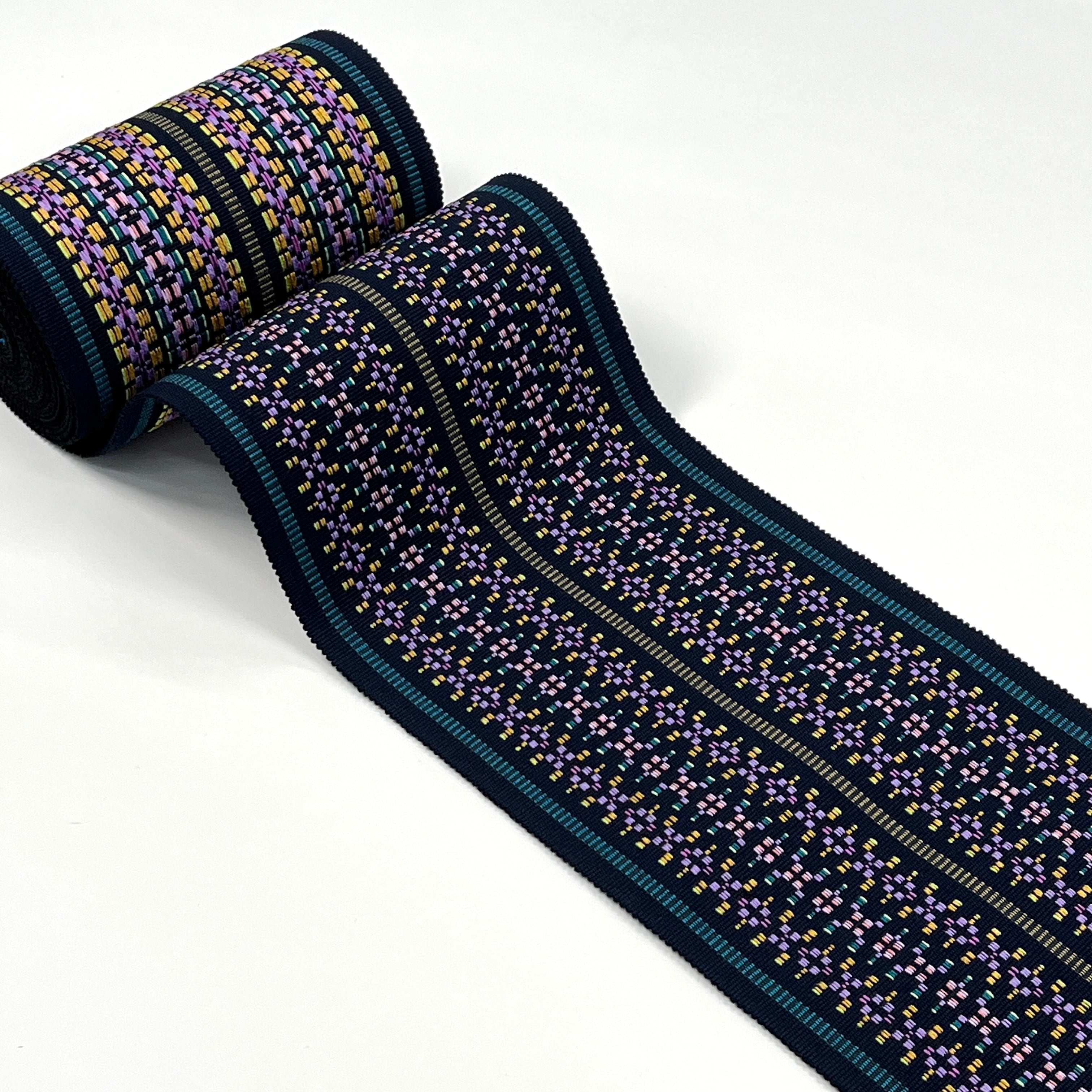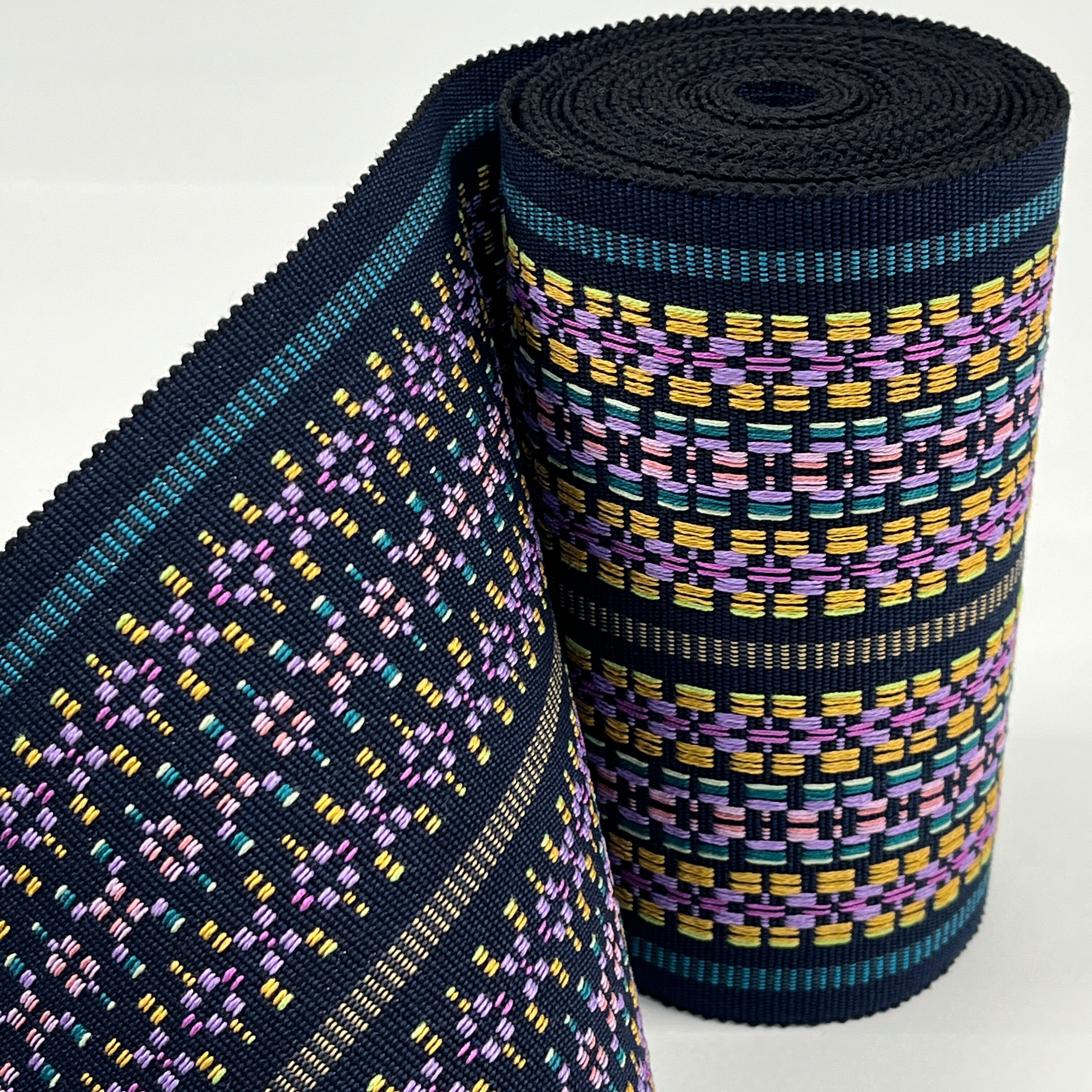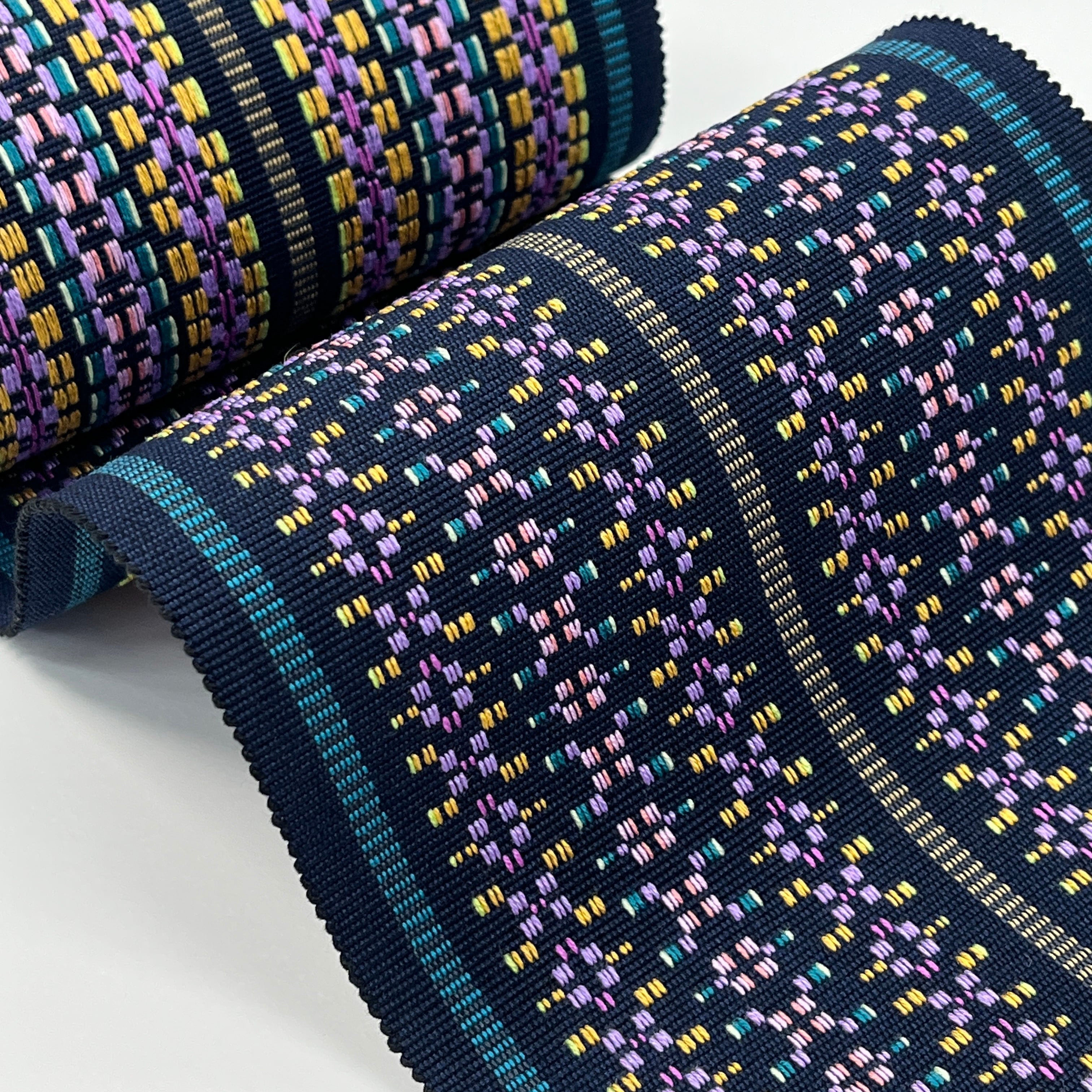 黒色をベースに、真ん中に淡い黄色系のライン、端に青緑系のラインが走り、藤紫、ピンク、黄色、檸檬色、白などカラフルな花織が全体にふんだんに浮き織りされた『知花花織の半幅帯』です。