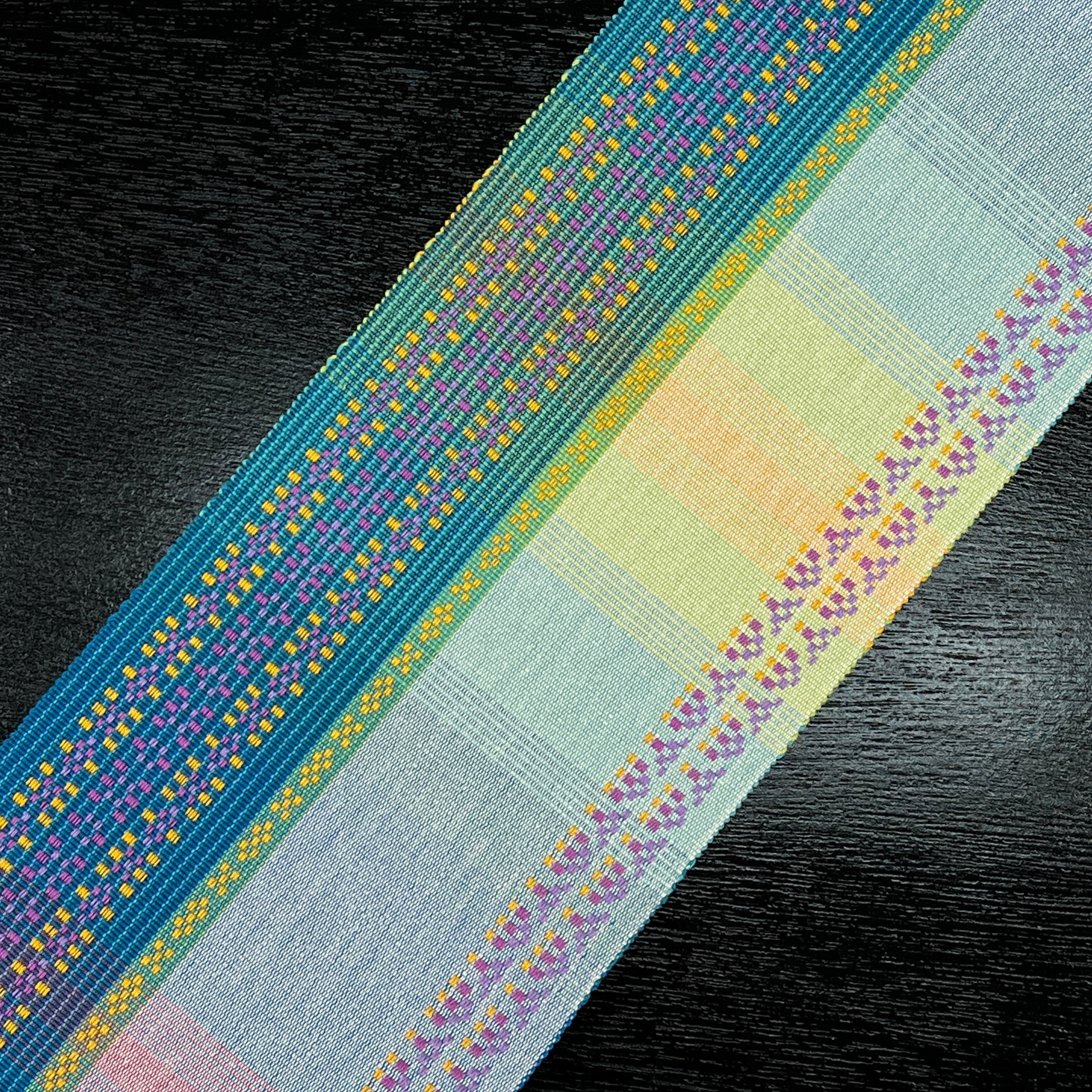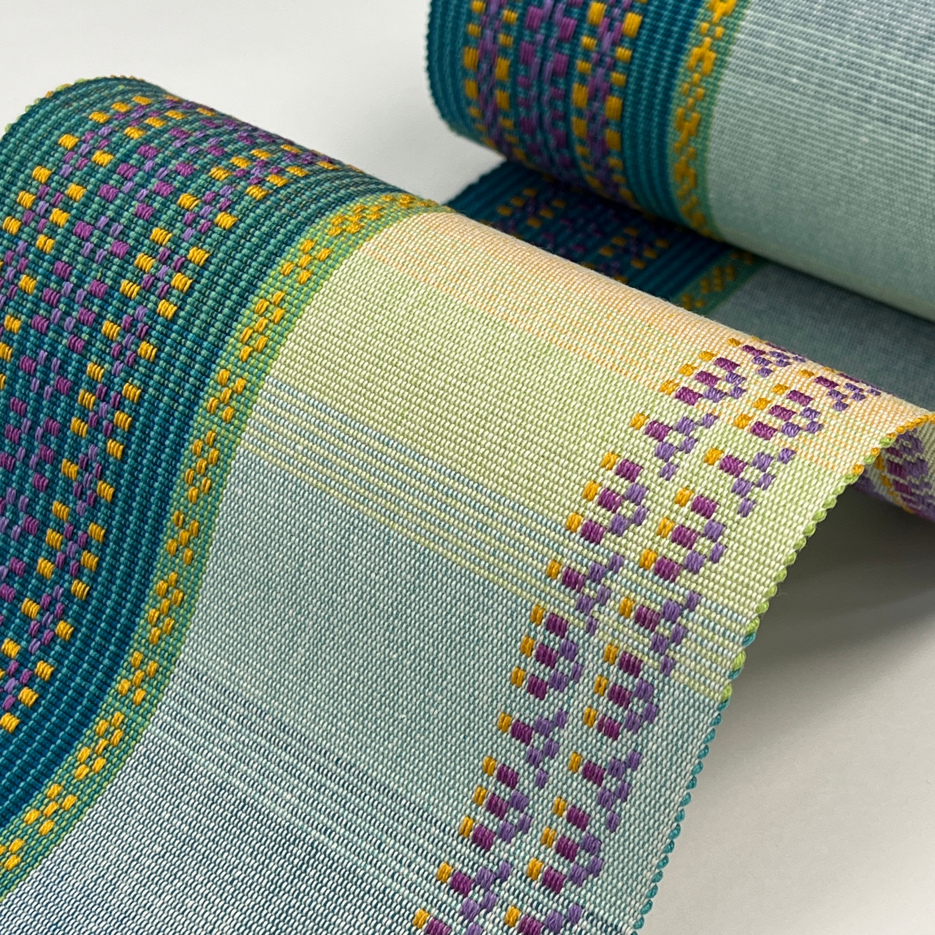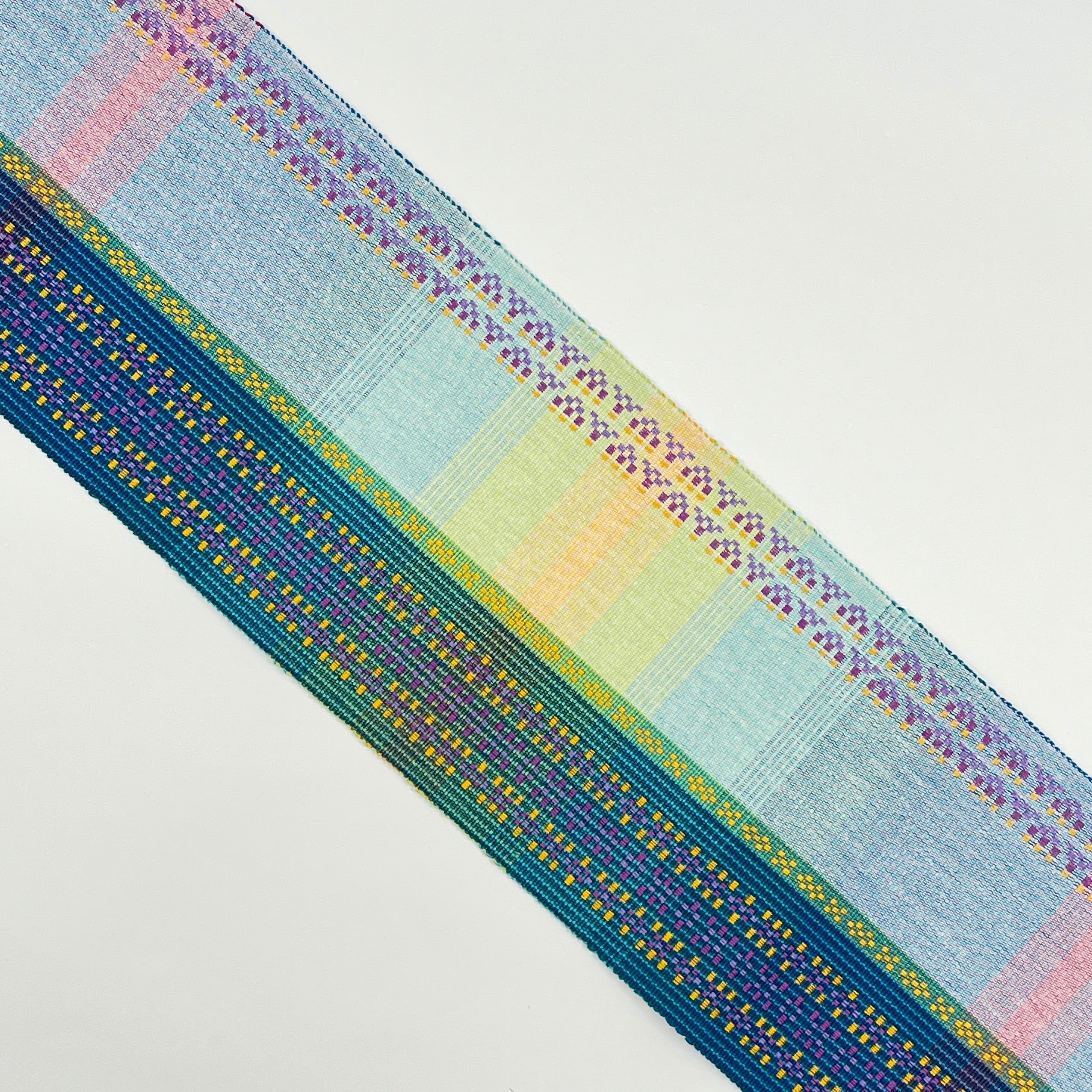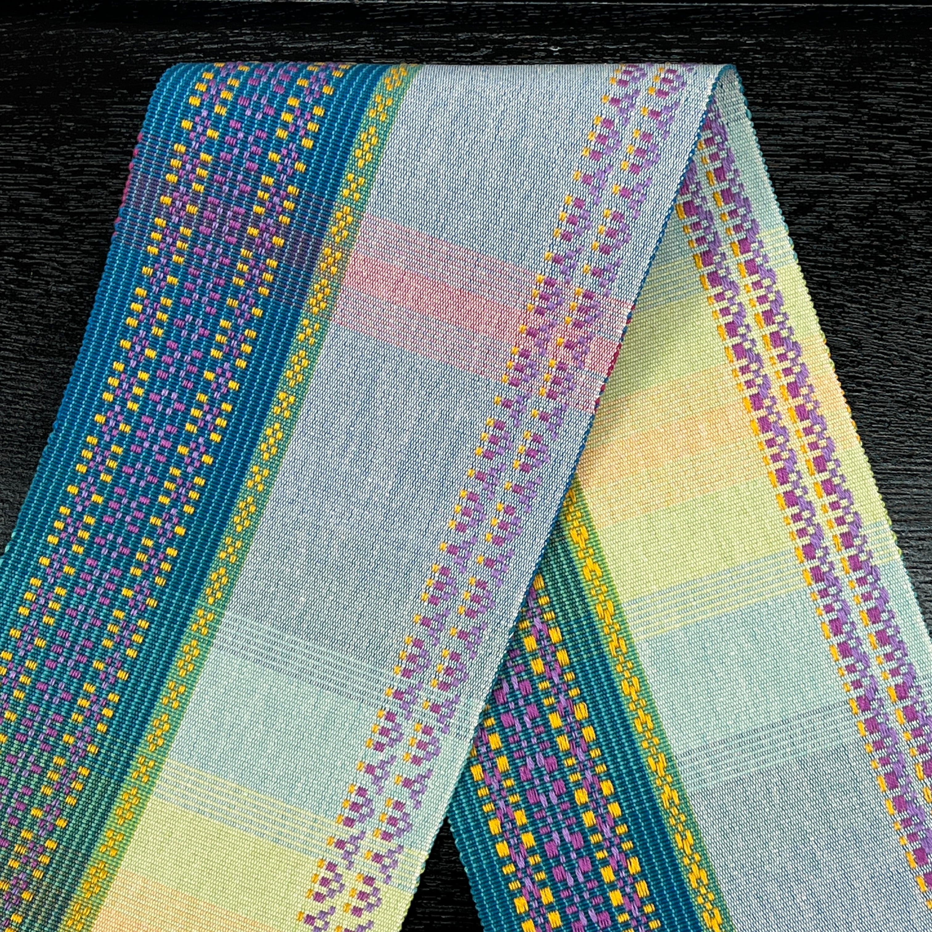 濃い青緑系の部分と薄い水色、黄緑、薄い黄色のグラデーションの中に藤紫、紫、山吹色の細く並んだ花織が浮き織りされた『知花花織の半幅帯』です。