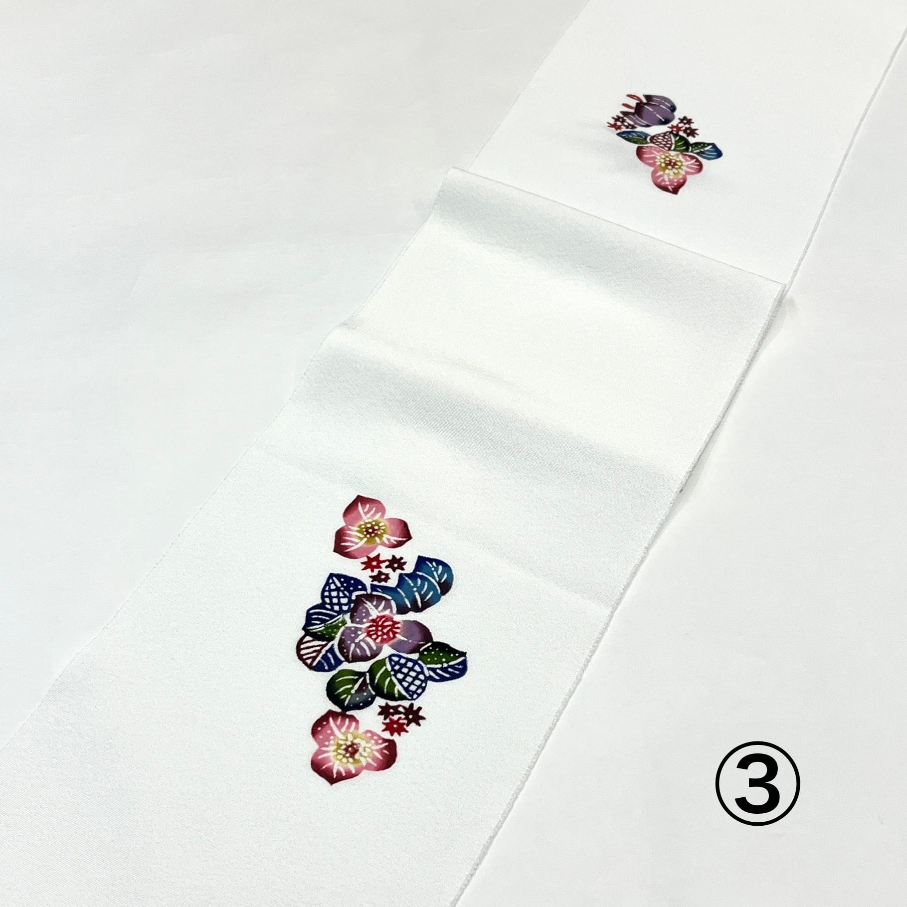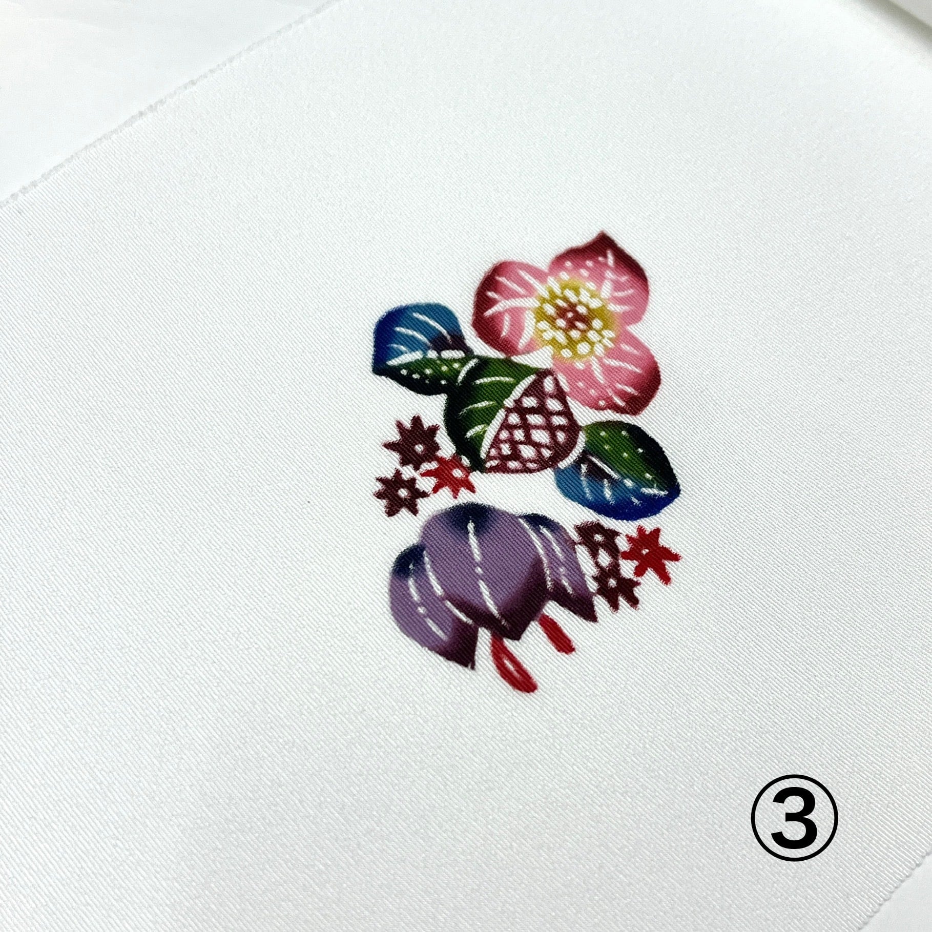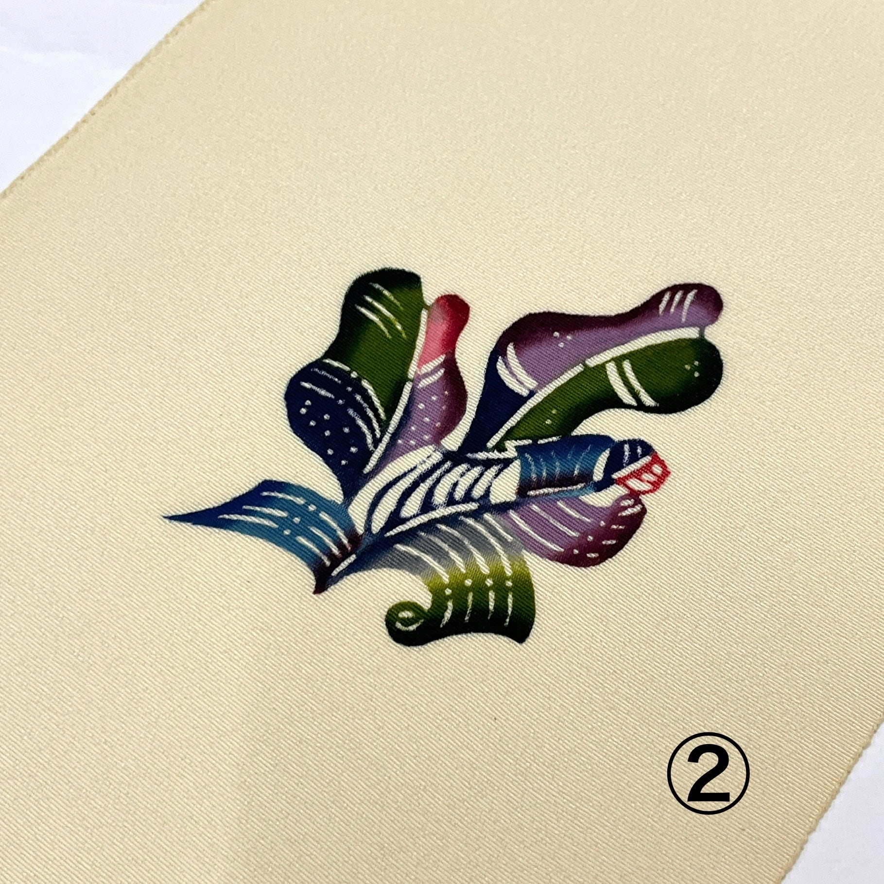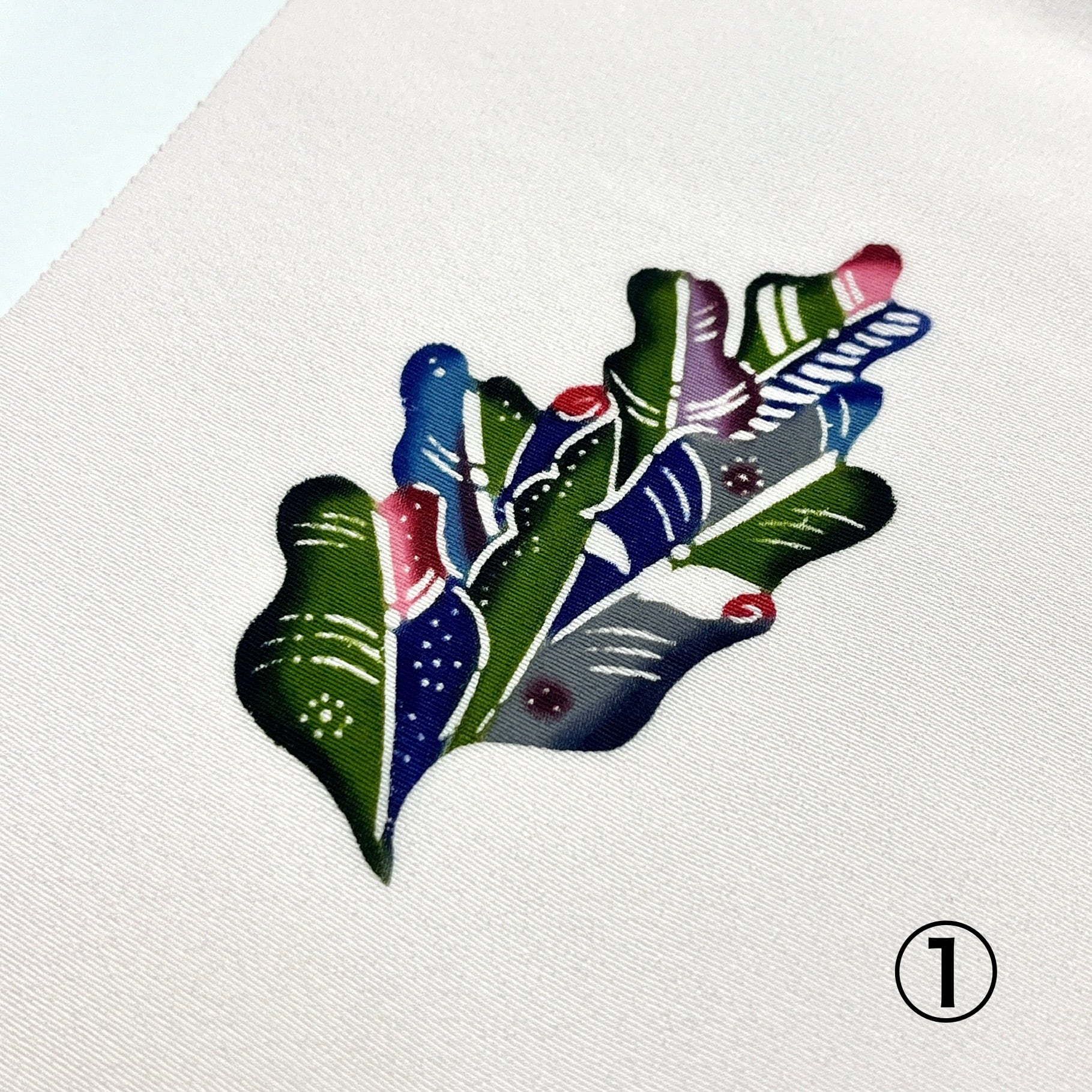 芭蕉の葉が破れている様子や、これから育っていく、くるっと巻いた若い葉を生き生きと描いています。また、ブーゲンビリア柄は、花の色もピンクや紫、葉の色や葉脈も多彩に表現しています。どちらもお着物姿のお顔周りを華やかに飾ります(^^)