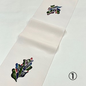 やんばるを描くびんがた作家・宮城友紀さん(天底びんがた工房)が描き、丁寧に染めました芭蕉とブーゲンビリアの「琉球本紅型半衿」です。