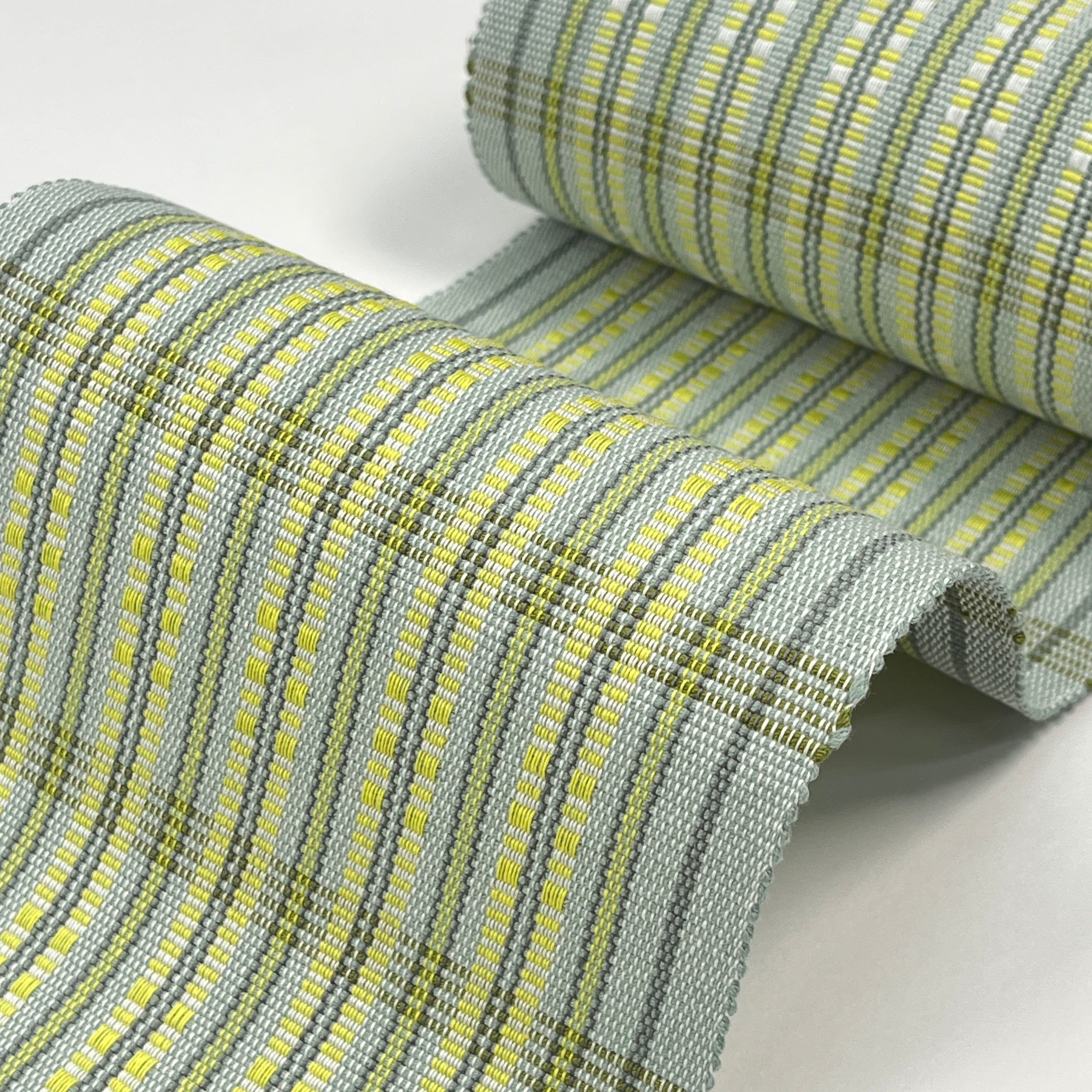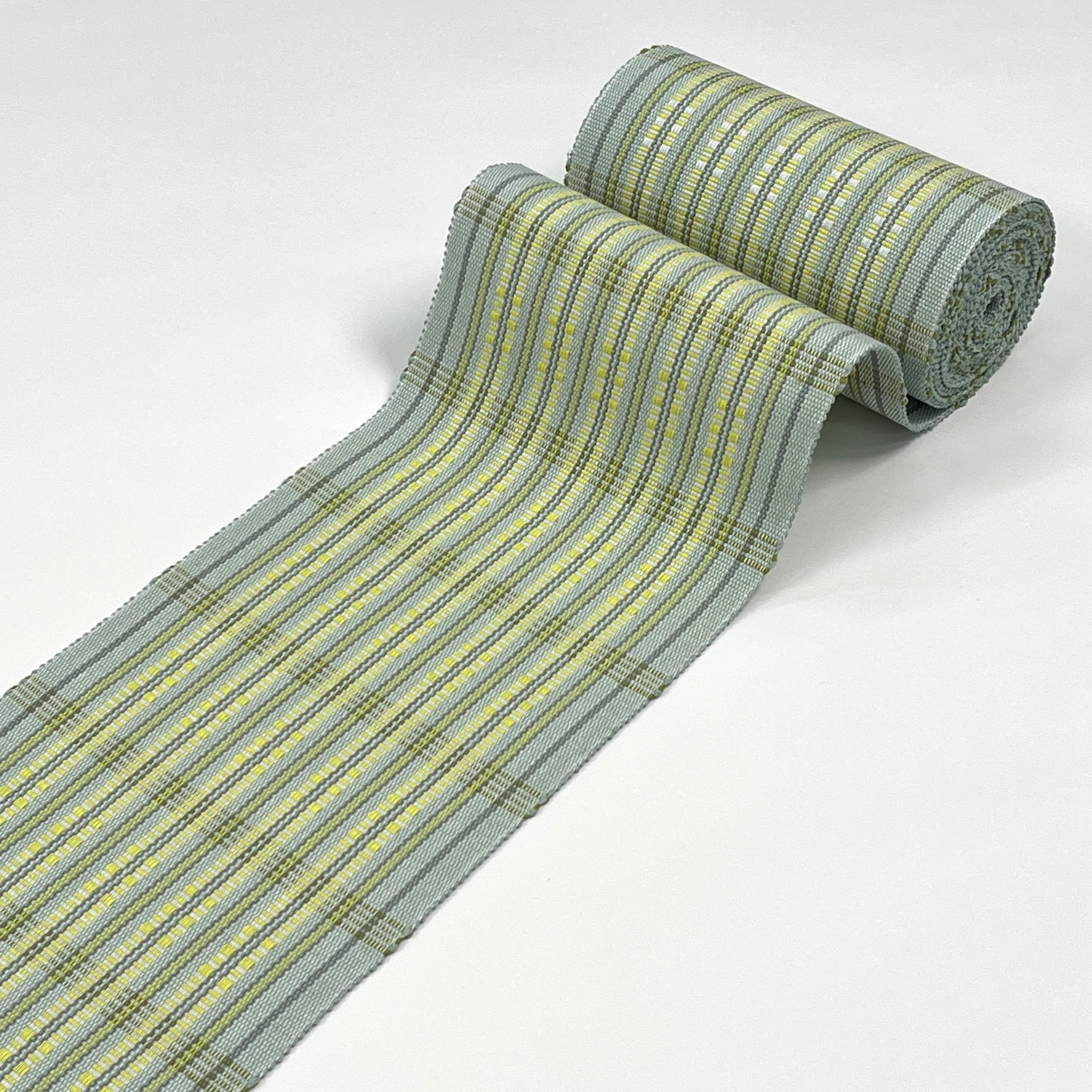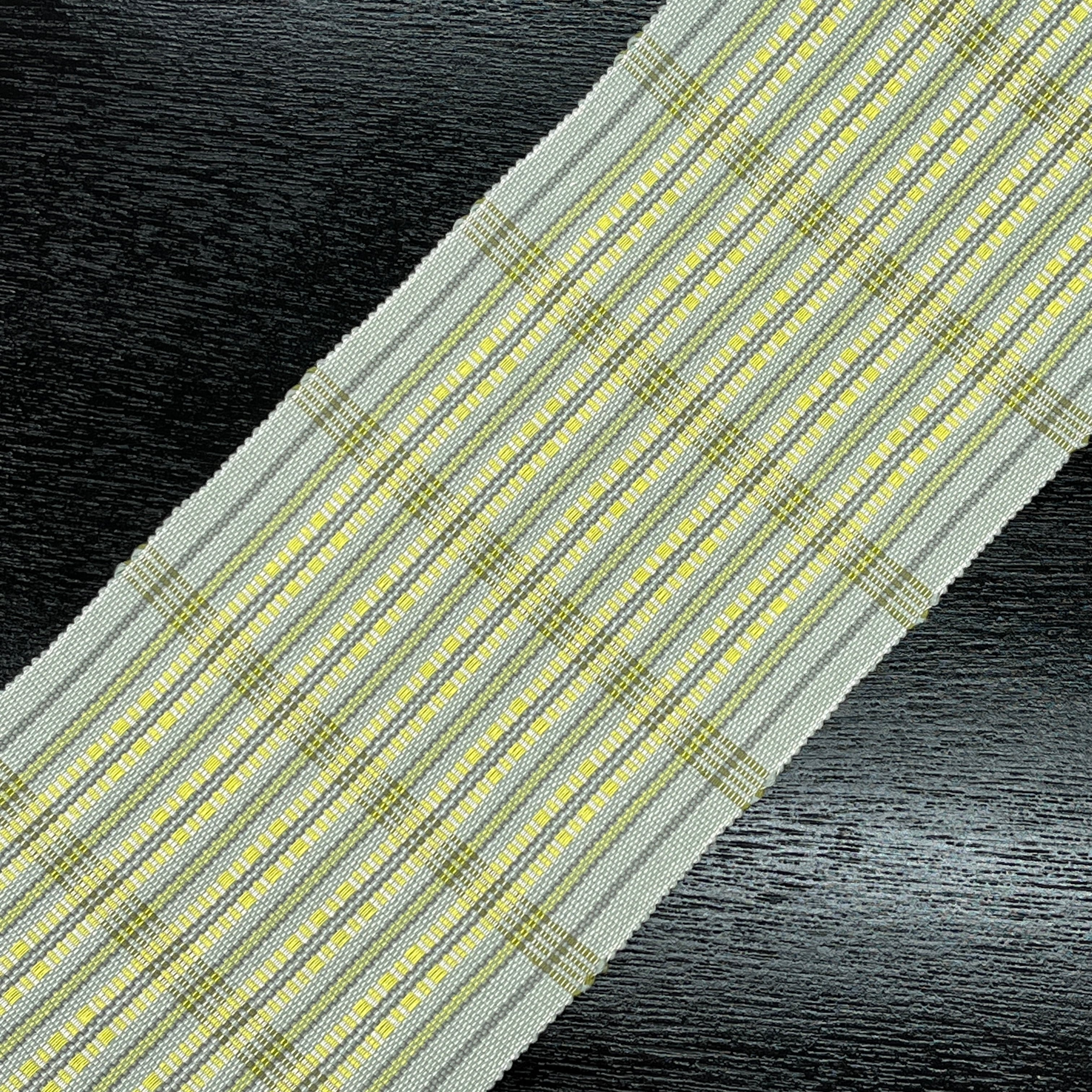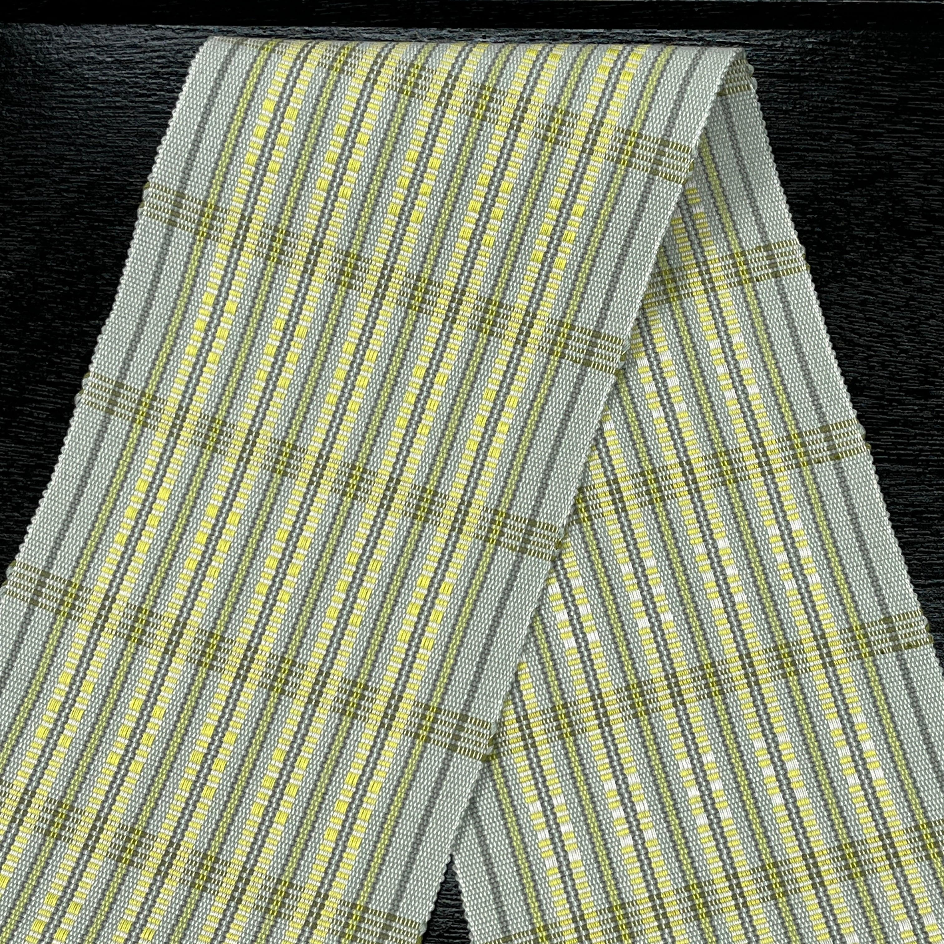 柳茶の色目を基調にし、黄緑と海松色(みるいろ・暗い黄緑系)で格子が入ったすっきりとかっこいいテイストの『首里道屯織の半幅帯』です。年間通して活躍してくれる大人な雰囲気です。
