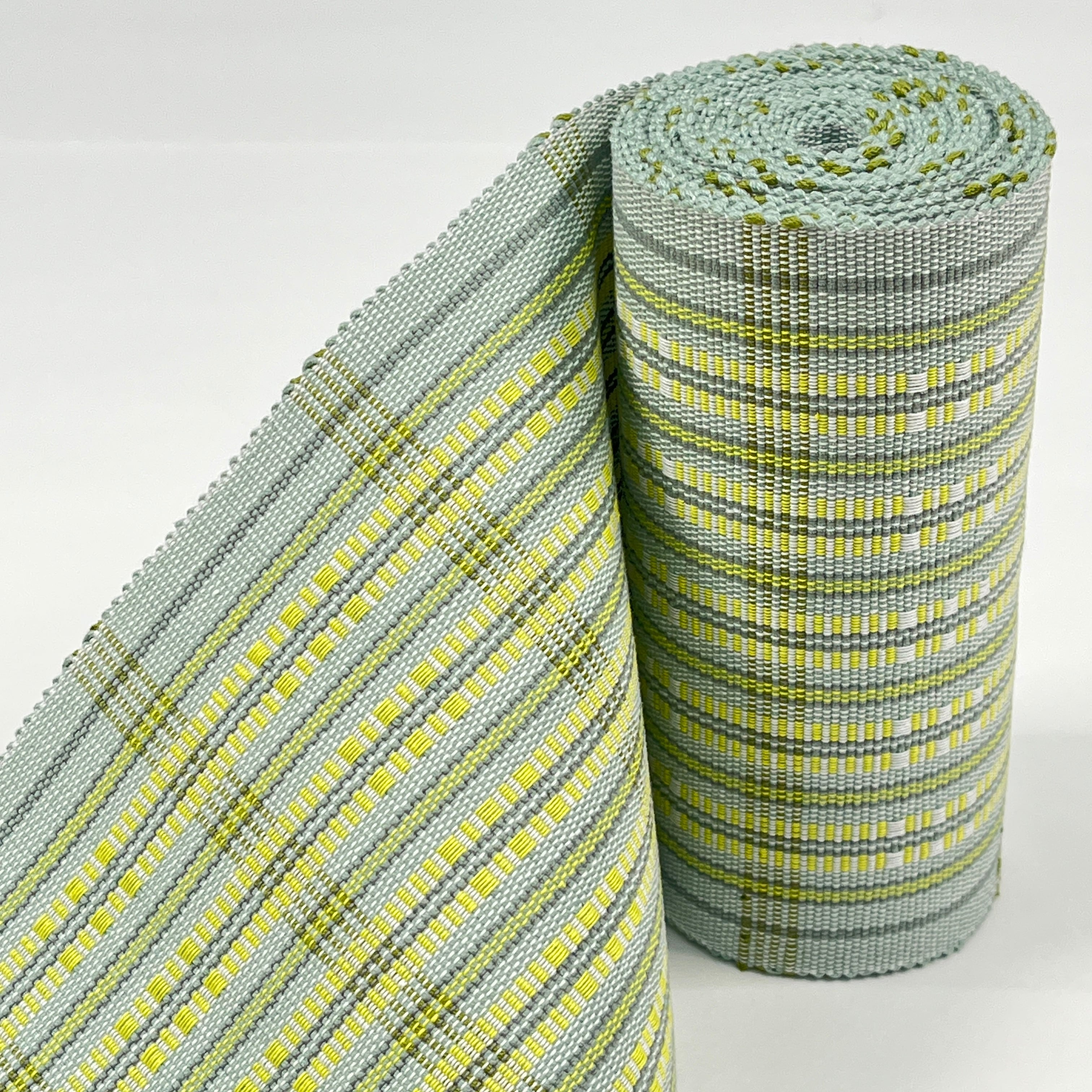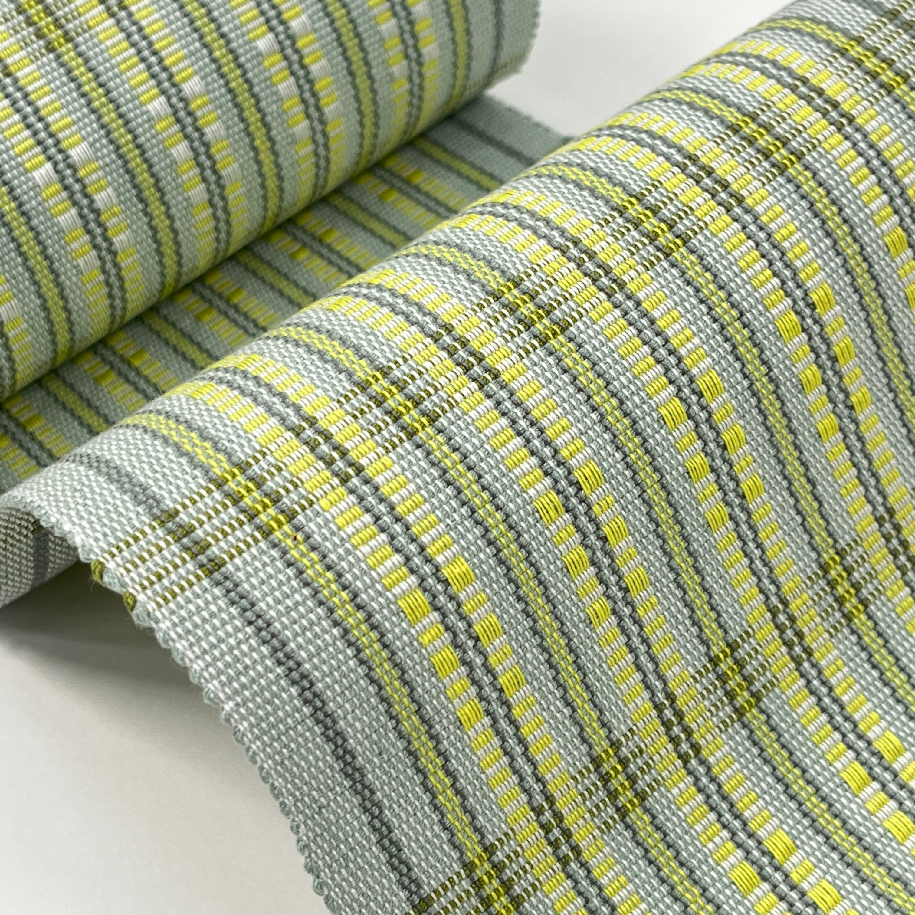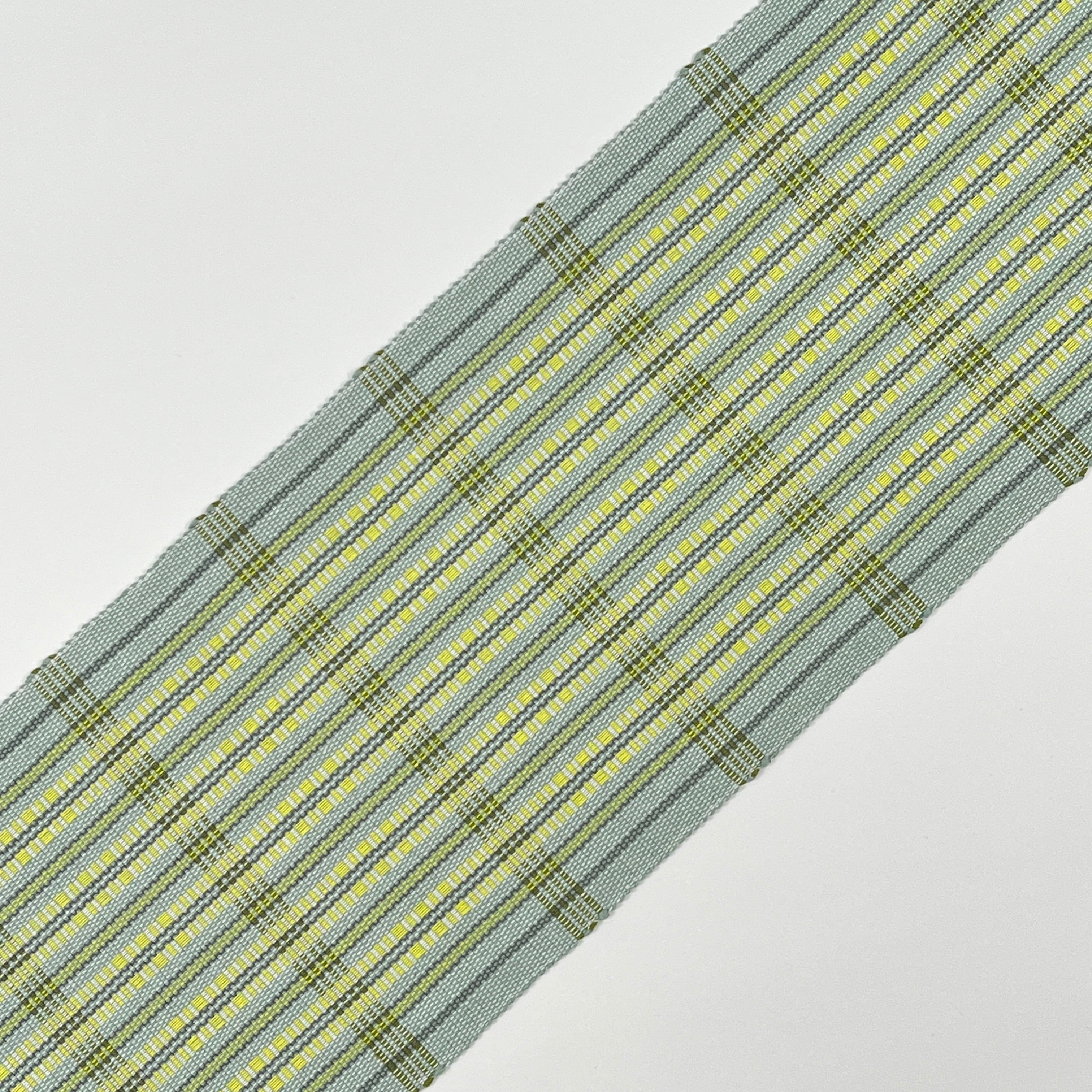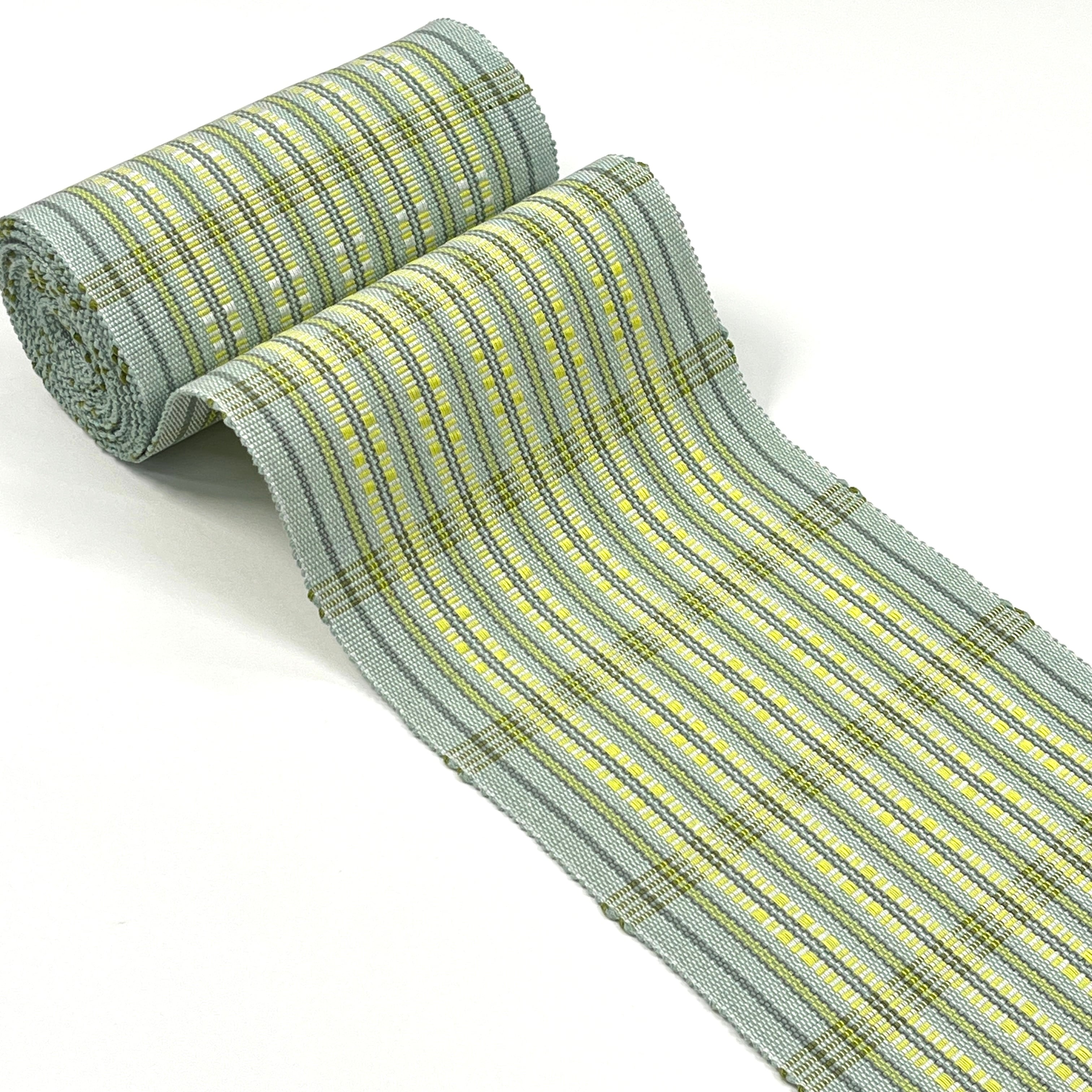 柳茶の色目を基調にし、黄緑と海松色(みるいろ・暗い黄緑系)で格子が入ったすっきりとかっこいいテイストの『首里道屯織の半幅帯』です。年間通して活躍してくれる大人な雰囲気です。