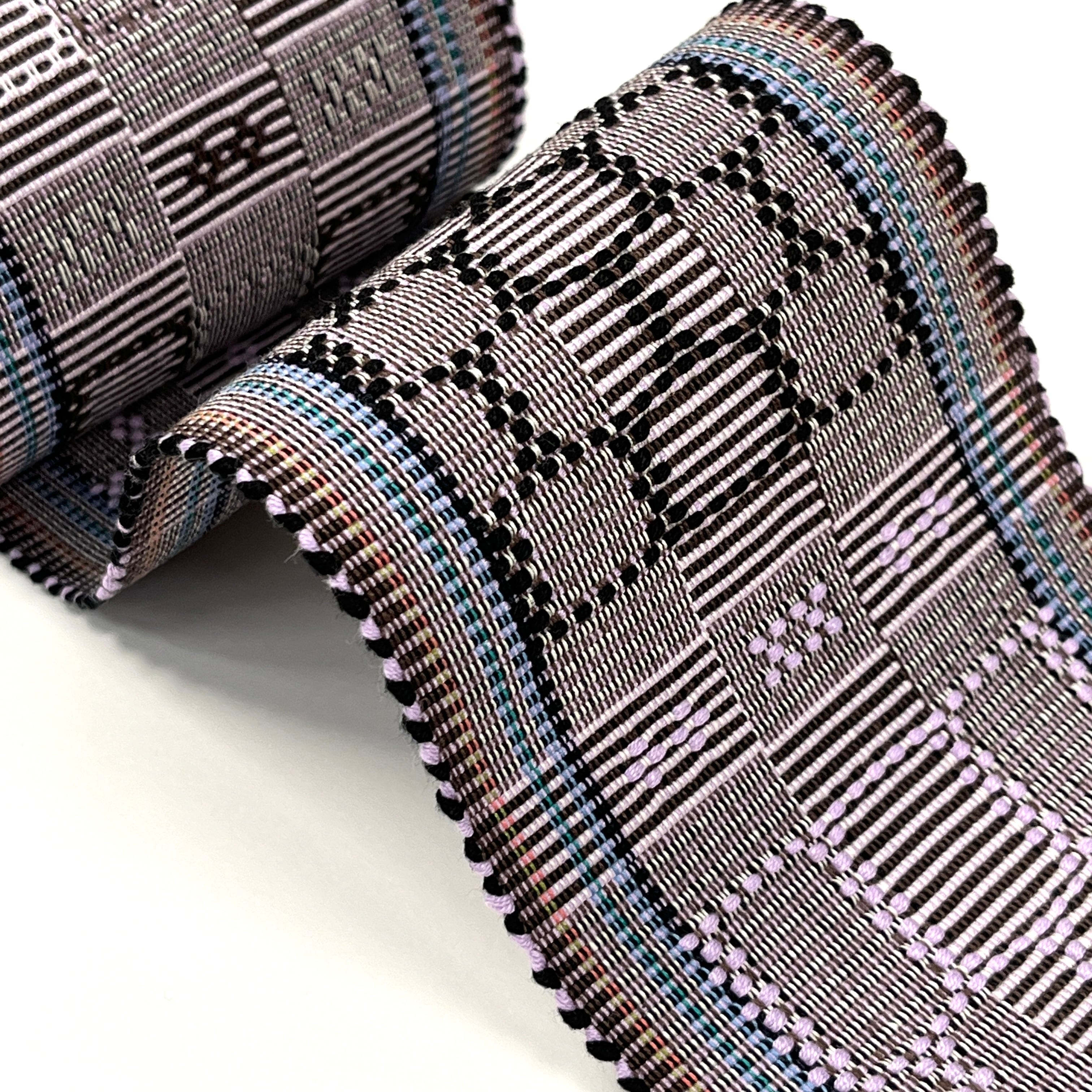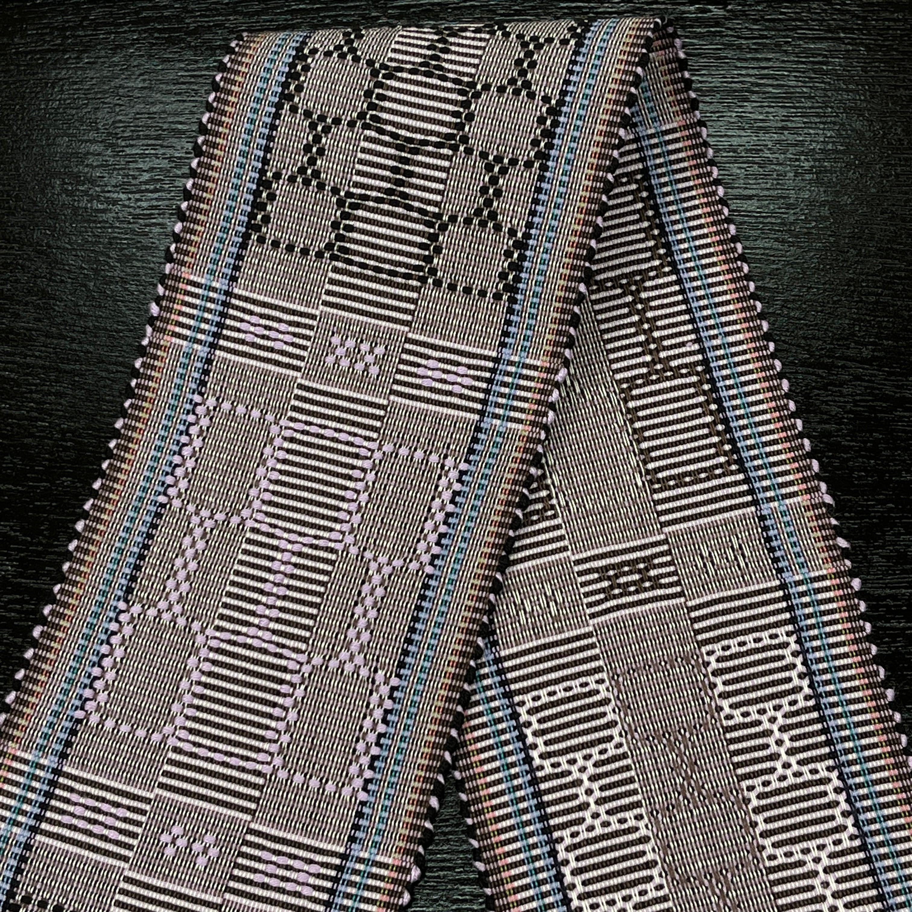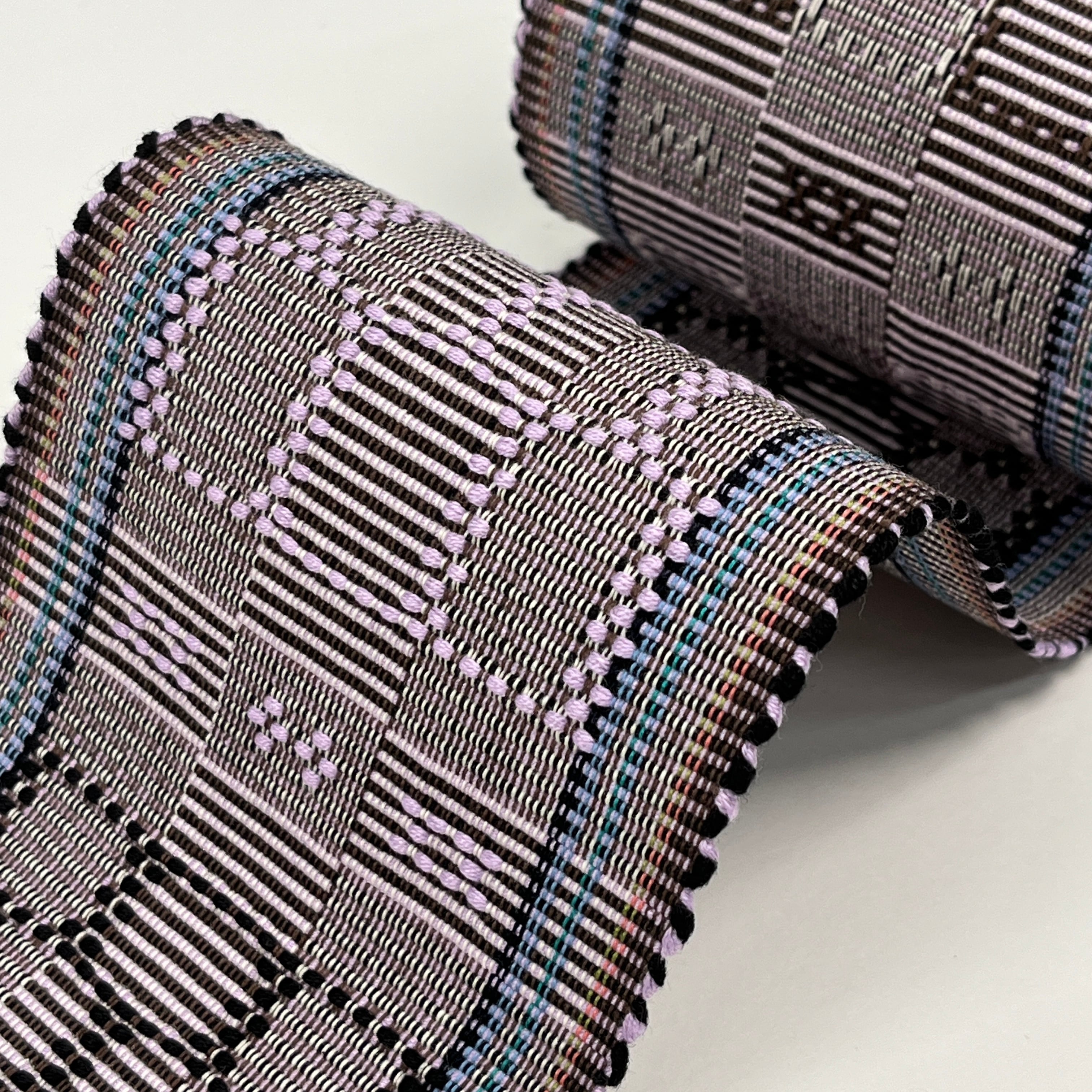 焦茶色と淡紅藤(あわべにふじ・やや灰色い紫系)、白色でやしらみ花織を表し、両端には黄色、オレンジ、緑などで細い線を引いたような、個性的で粋な『首里やしらみ花織の角帯』となっています(^^)