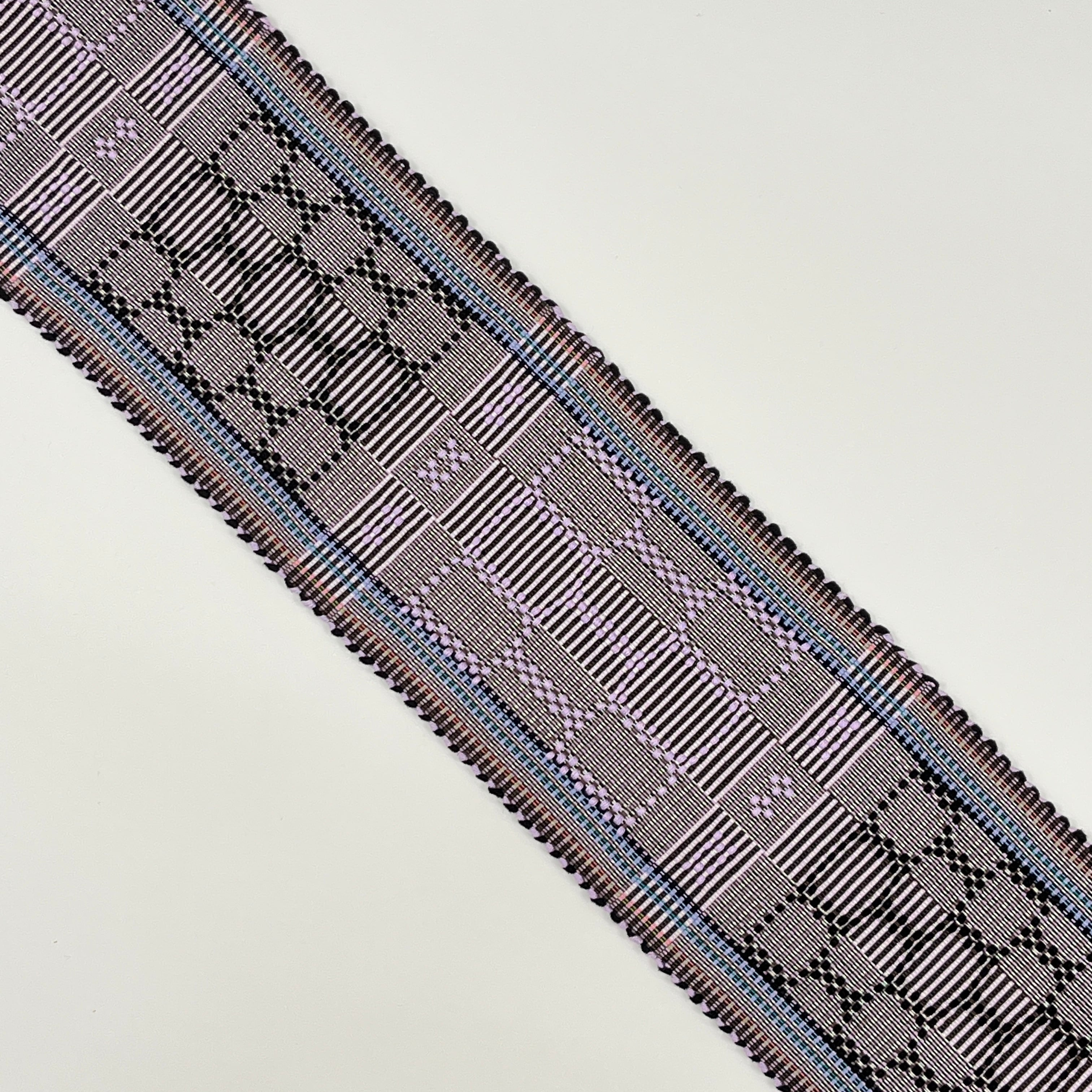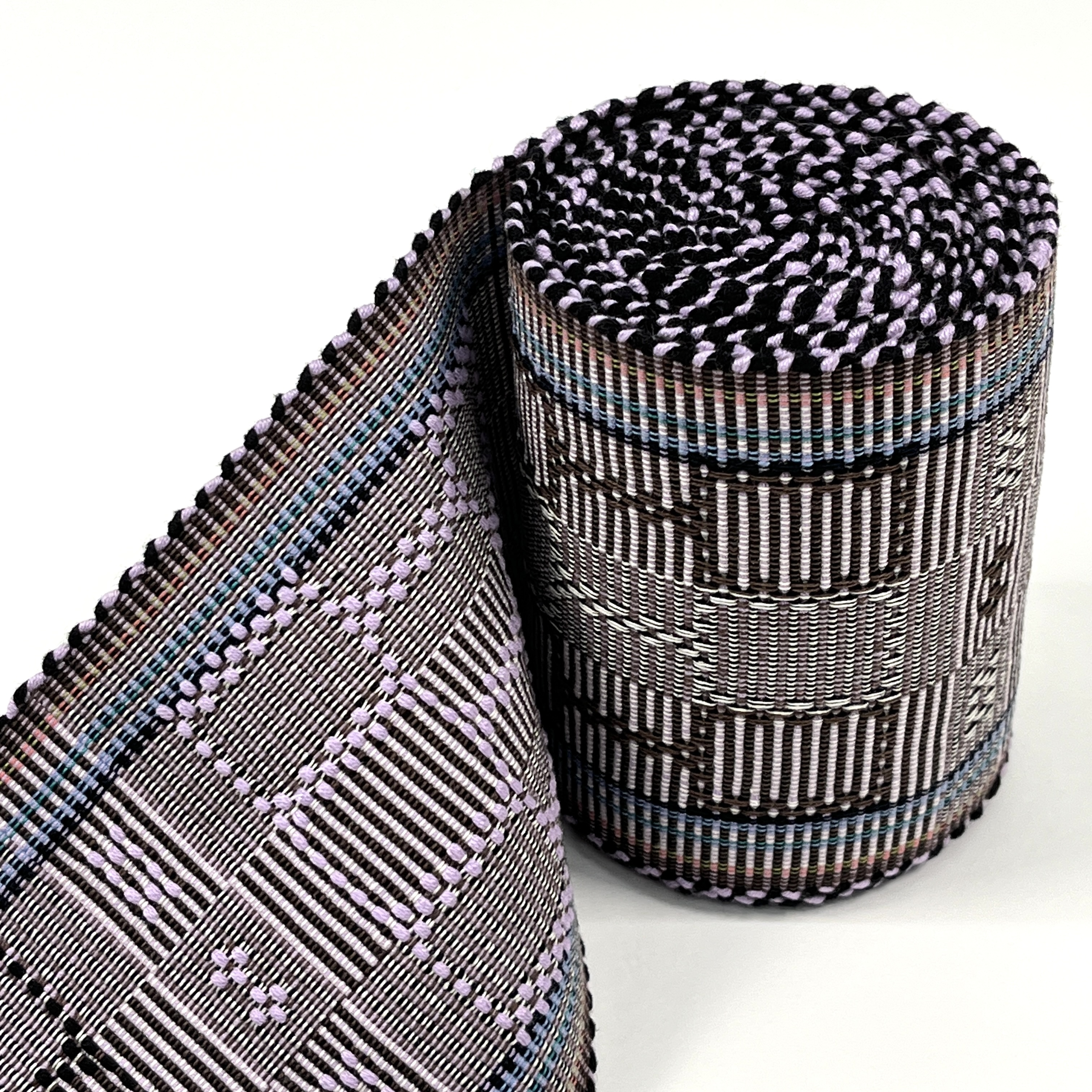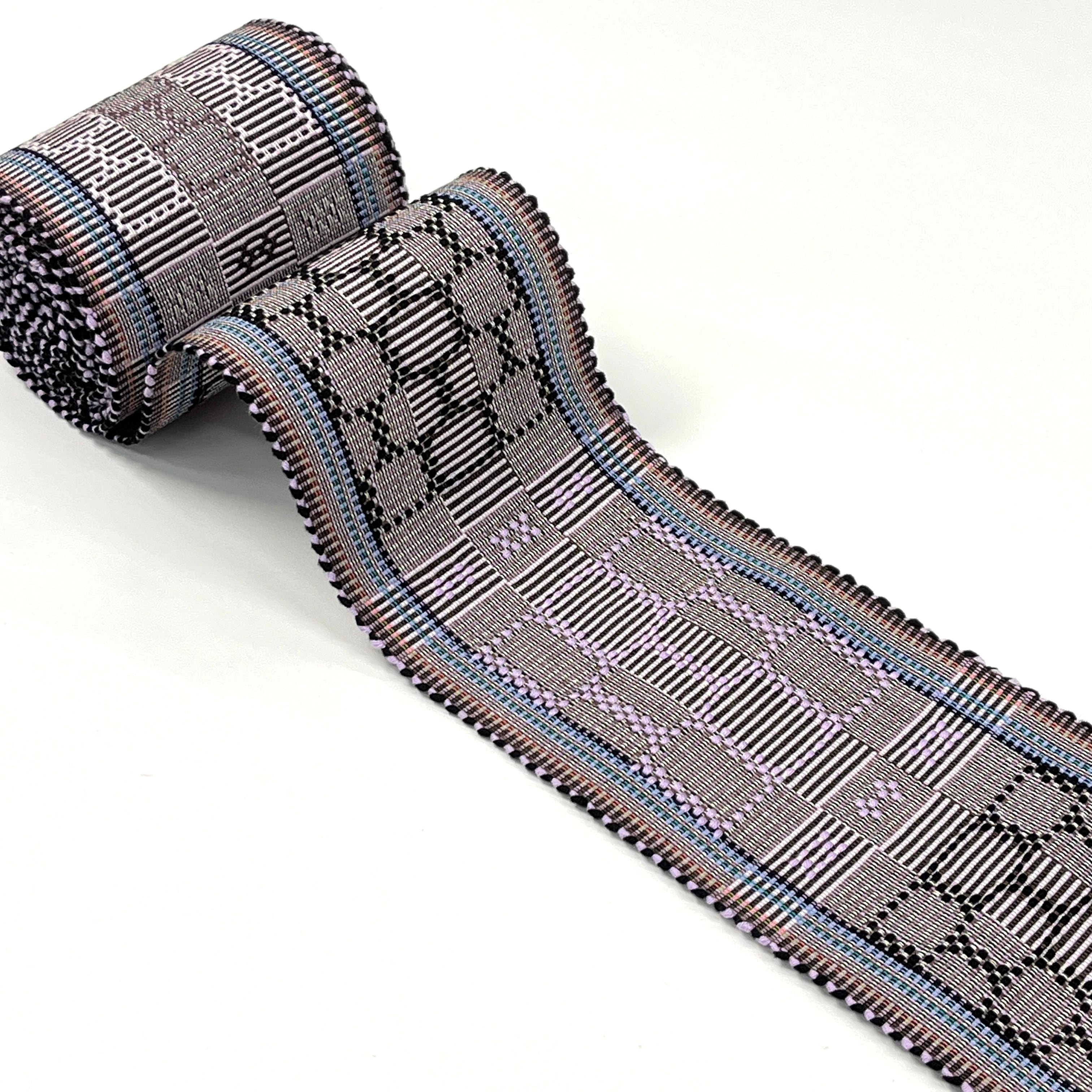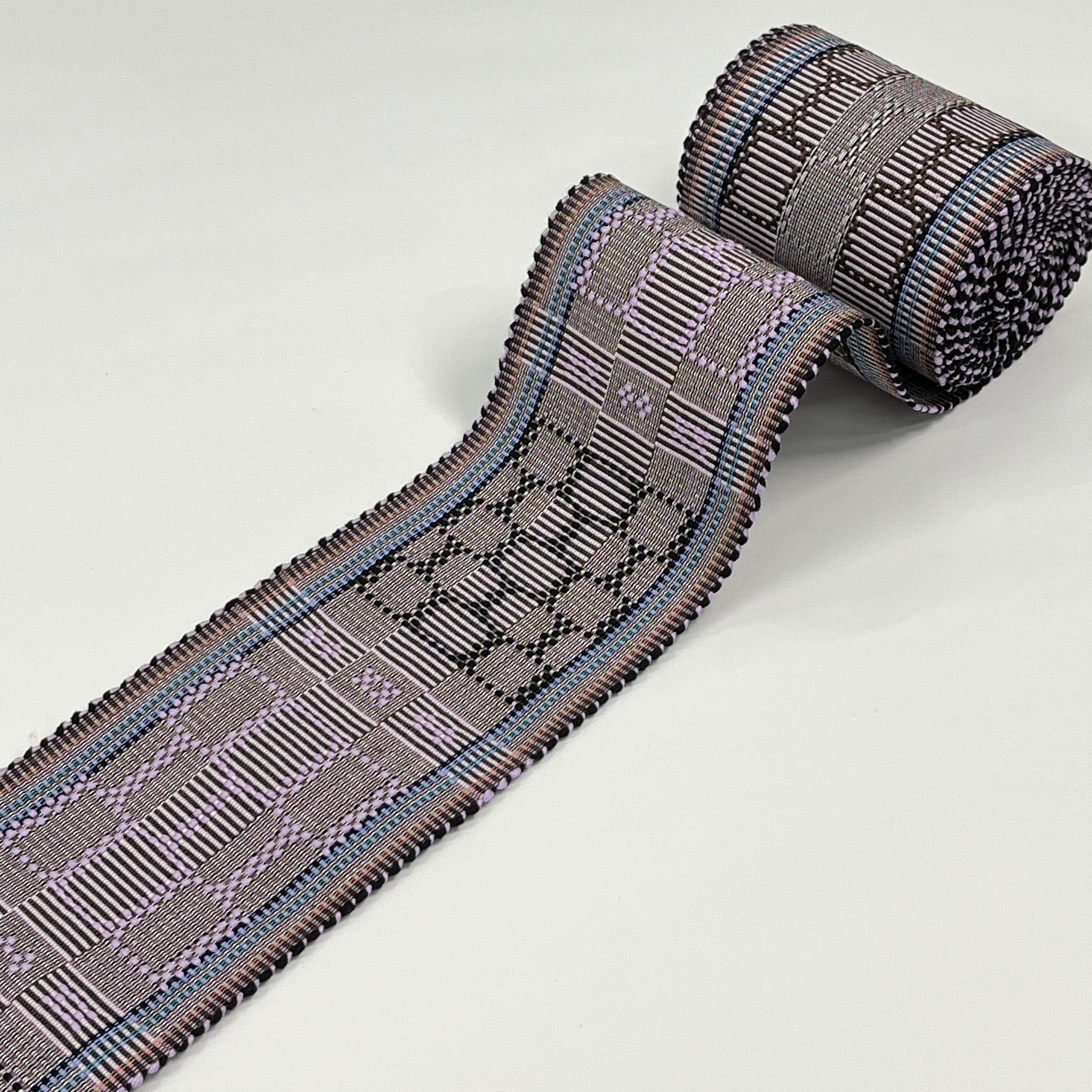 焦茶色と淡紅藤(あわべにふじ・やや灰色い紫系)、白色でやしらみ花織を表し、両端には黄色、オレンジ、緑などで細い線を引いたような、個性的で粋な『首里やしらみ花織の角帯』となっています(^^)