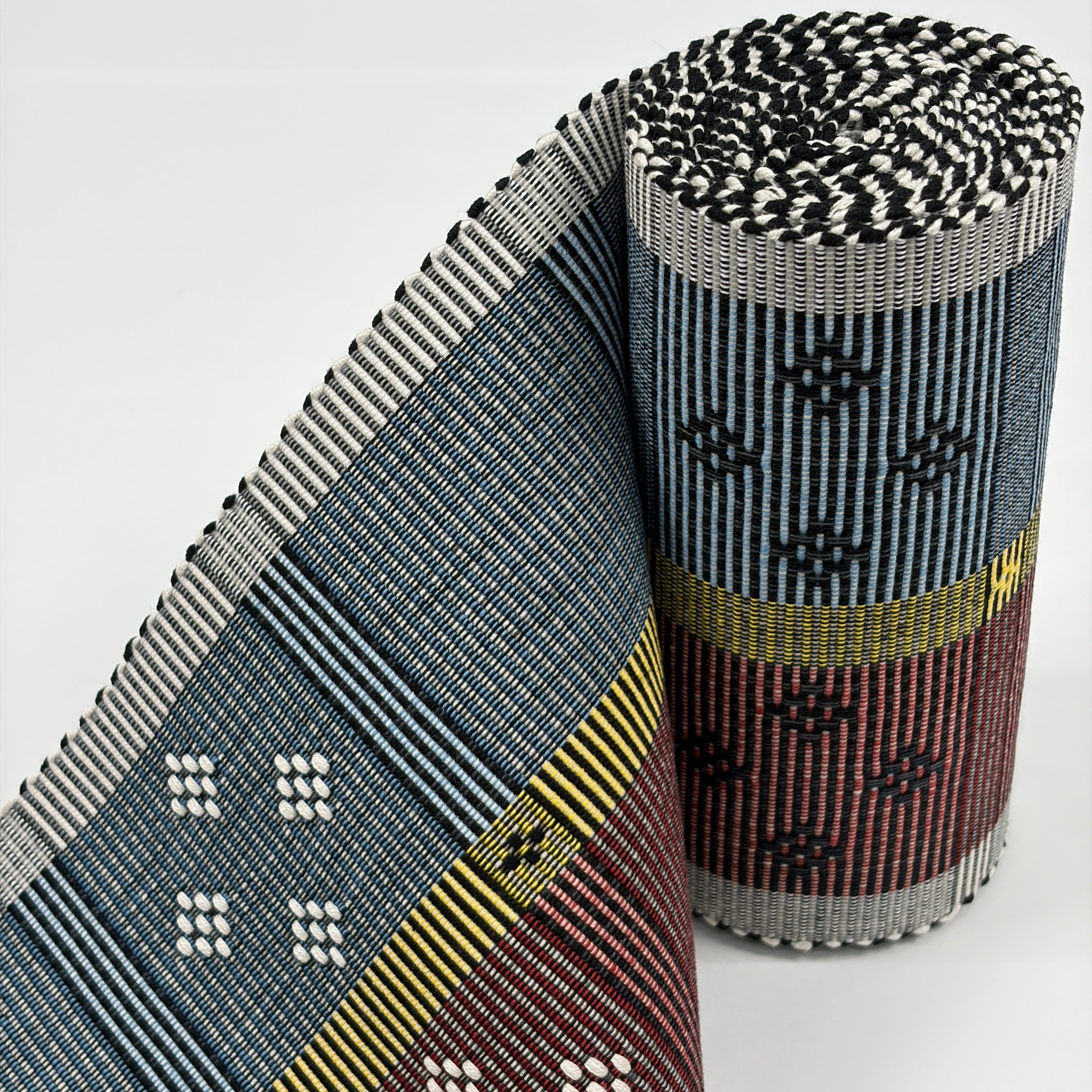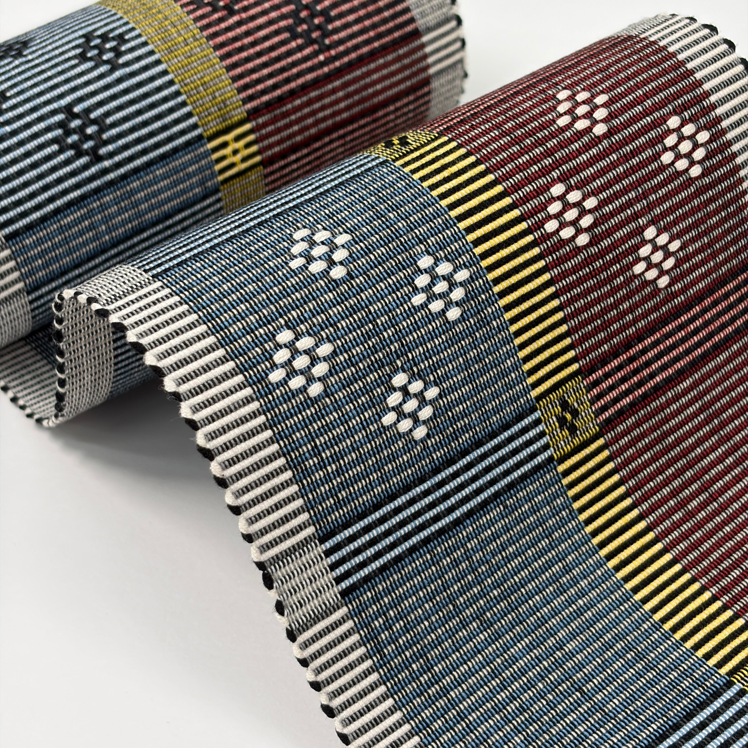 『首里やしらみ織』は、色の異なる糸を交互に配して細縞柄にし、表面に出る糸の色の配置を変えることで市松柄が表され「ヤスリの目」にも見えることから「やしらみ」と呼ばれます。それに花紋を立体的に織り出したものが『首里やしらみ花織』です。
