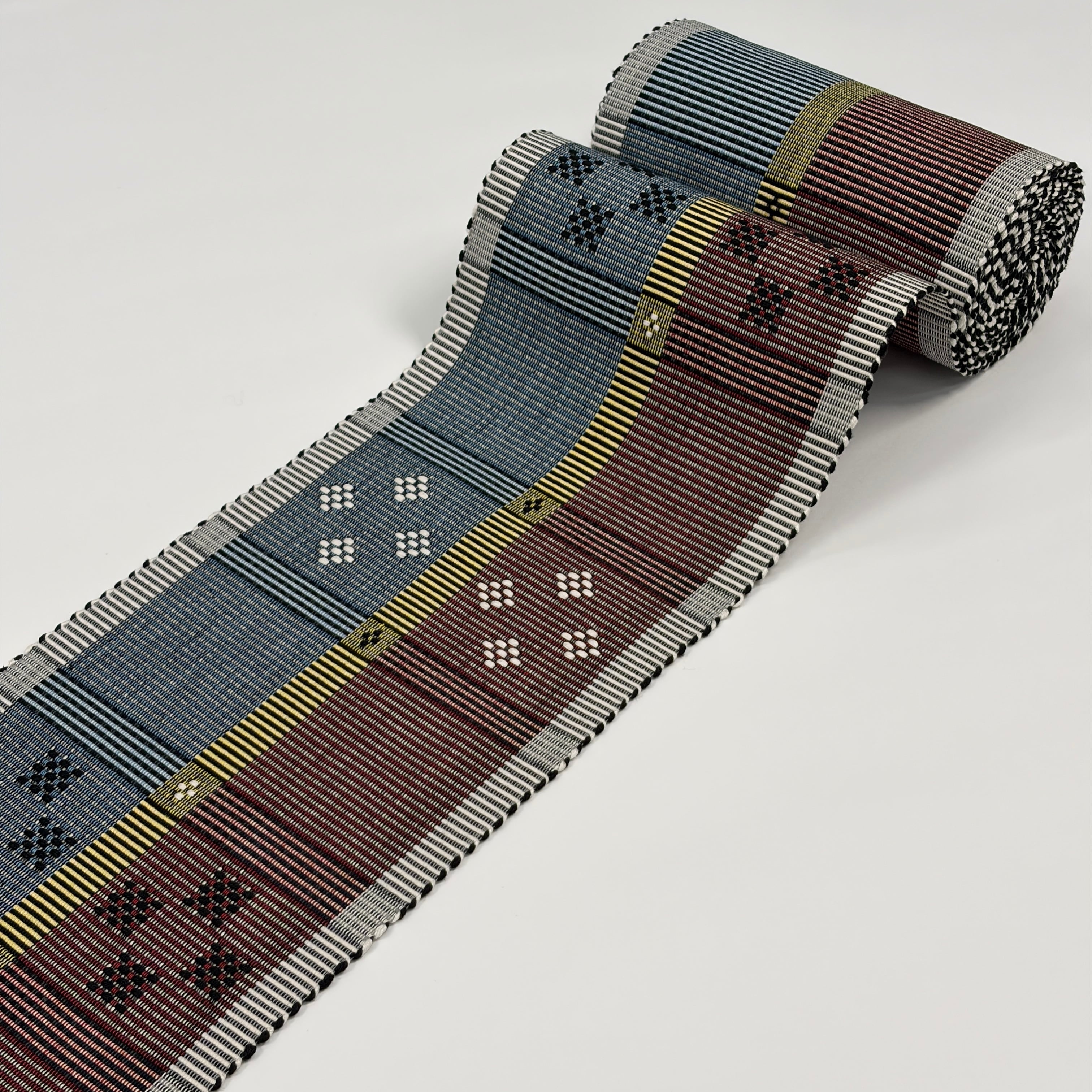赤茶色と薄縹(うすはなだ・鈍い青紫系)の幅のある経縞の中に白と濃藍の幾何学紋様の花織を表した『『首里やしらみ花織の半幅帯』です。やしらみを大きな幅で表した個性的な柄で、年中活躍してくれそうな色合いになっています(^O^)/