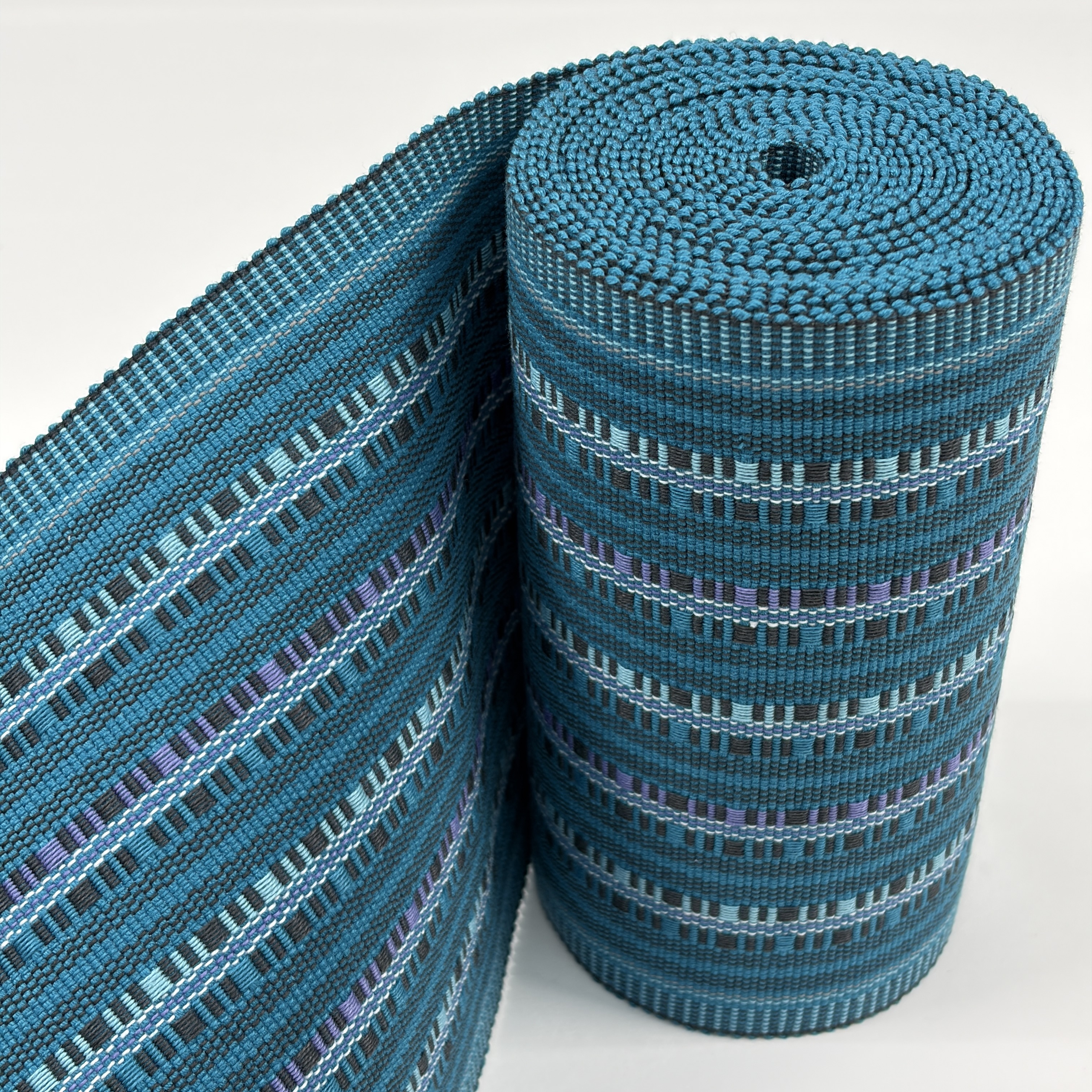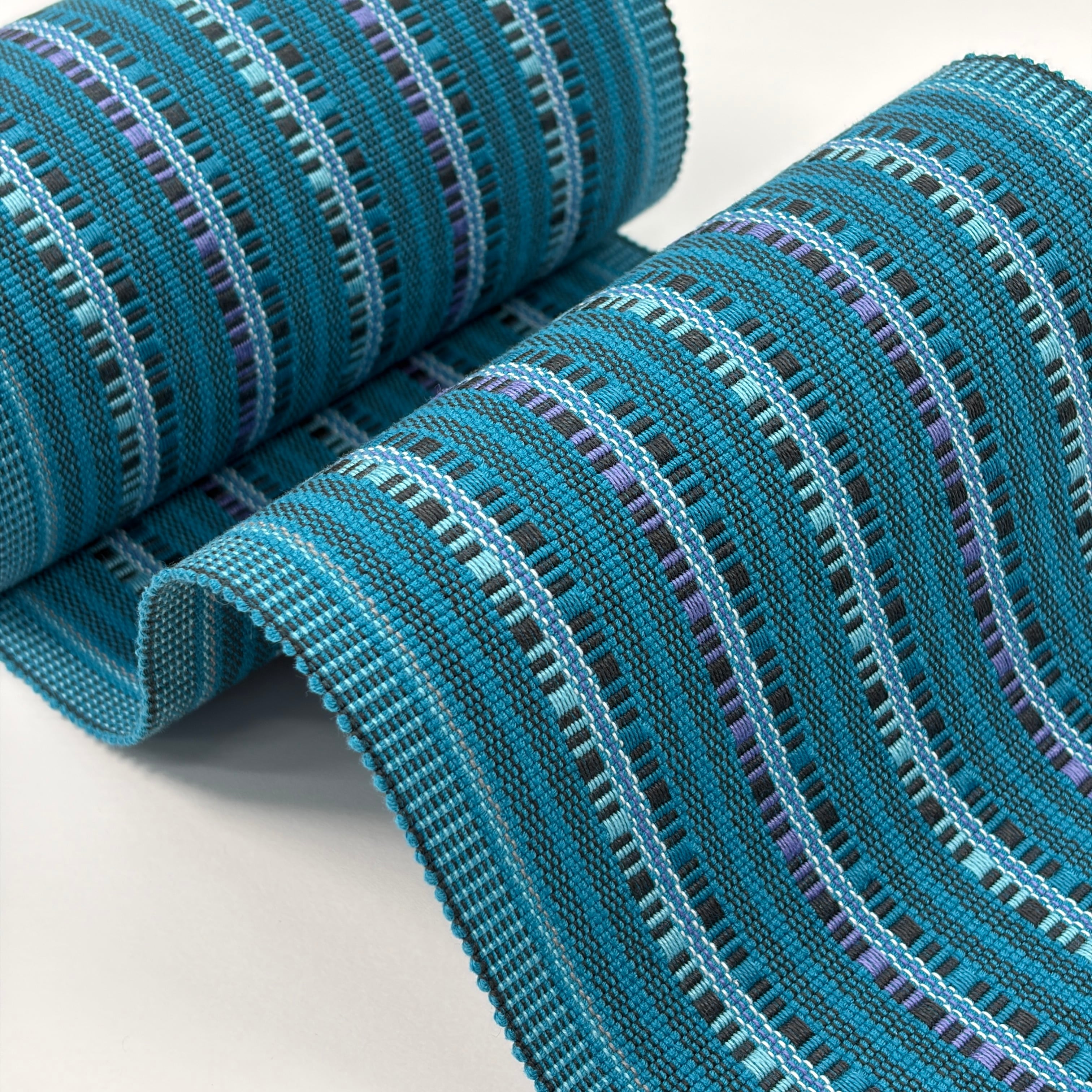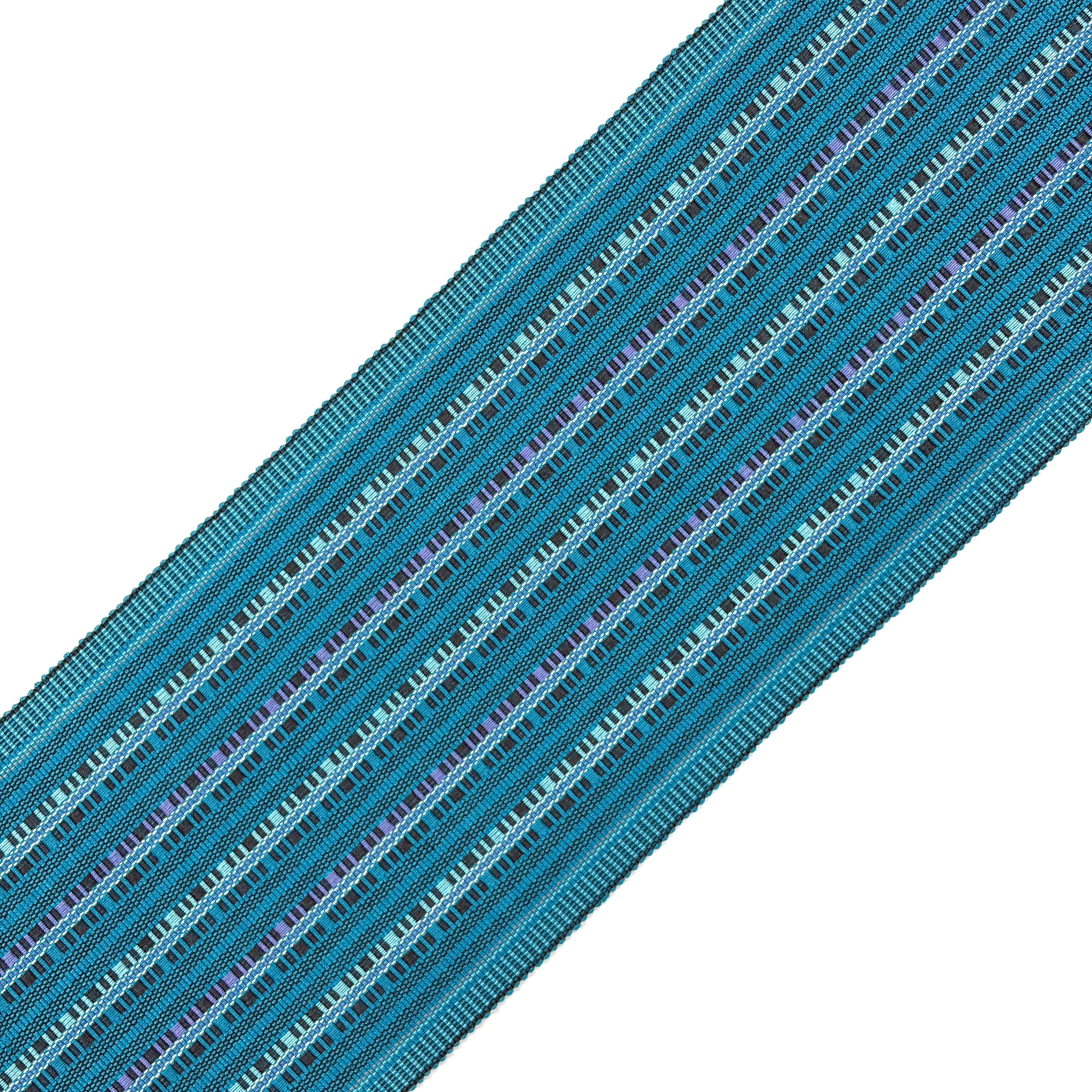 濃い青緑を基調にし、濃いグレー、薄い藤紫、浅縹(あさはなだ・灰みの青系)といった青系のすっきりと格好良いテイストの『首里道屯織の半幅帯』です。