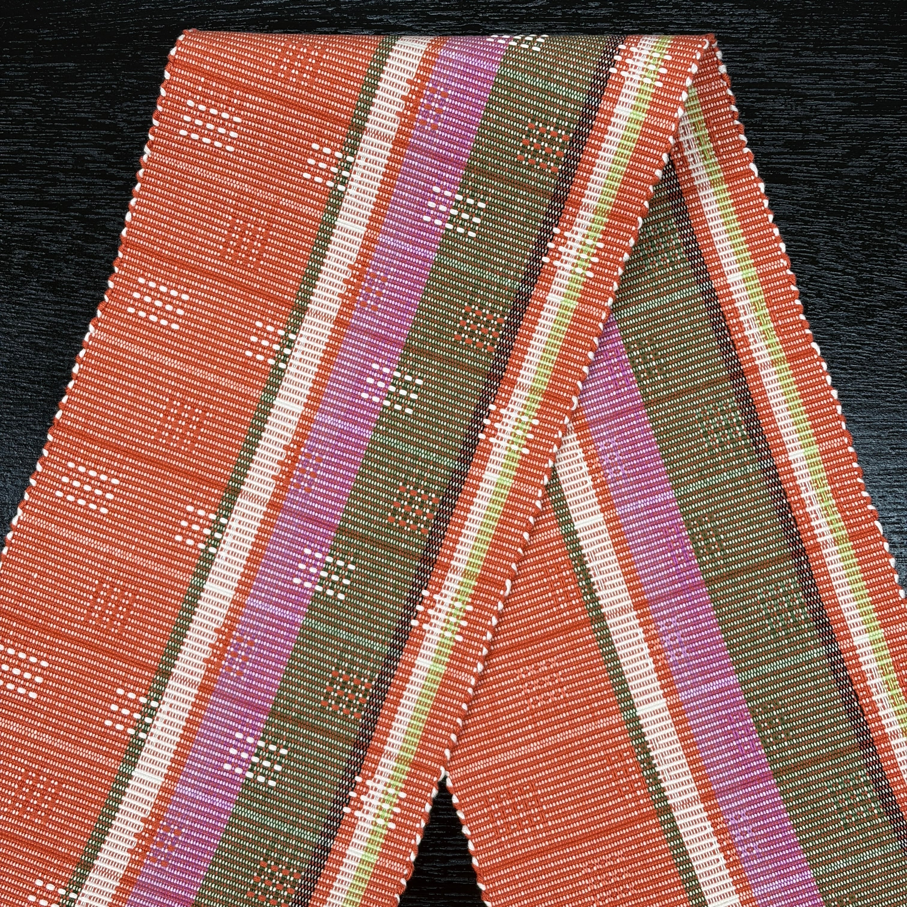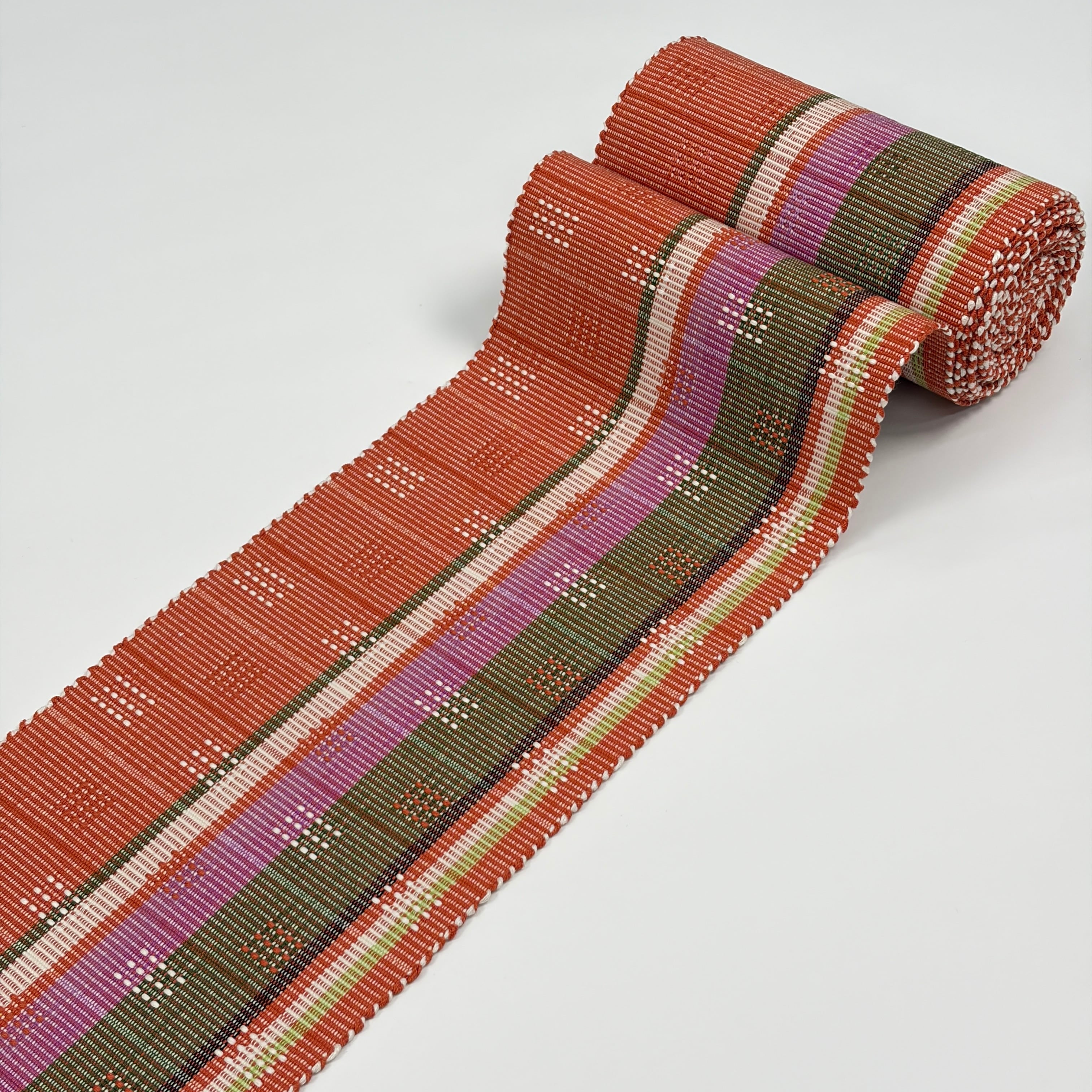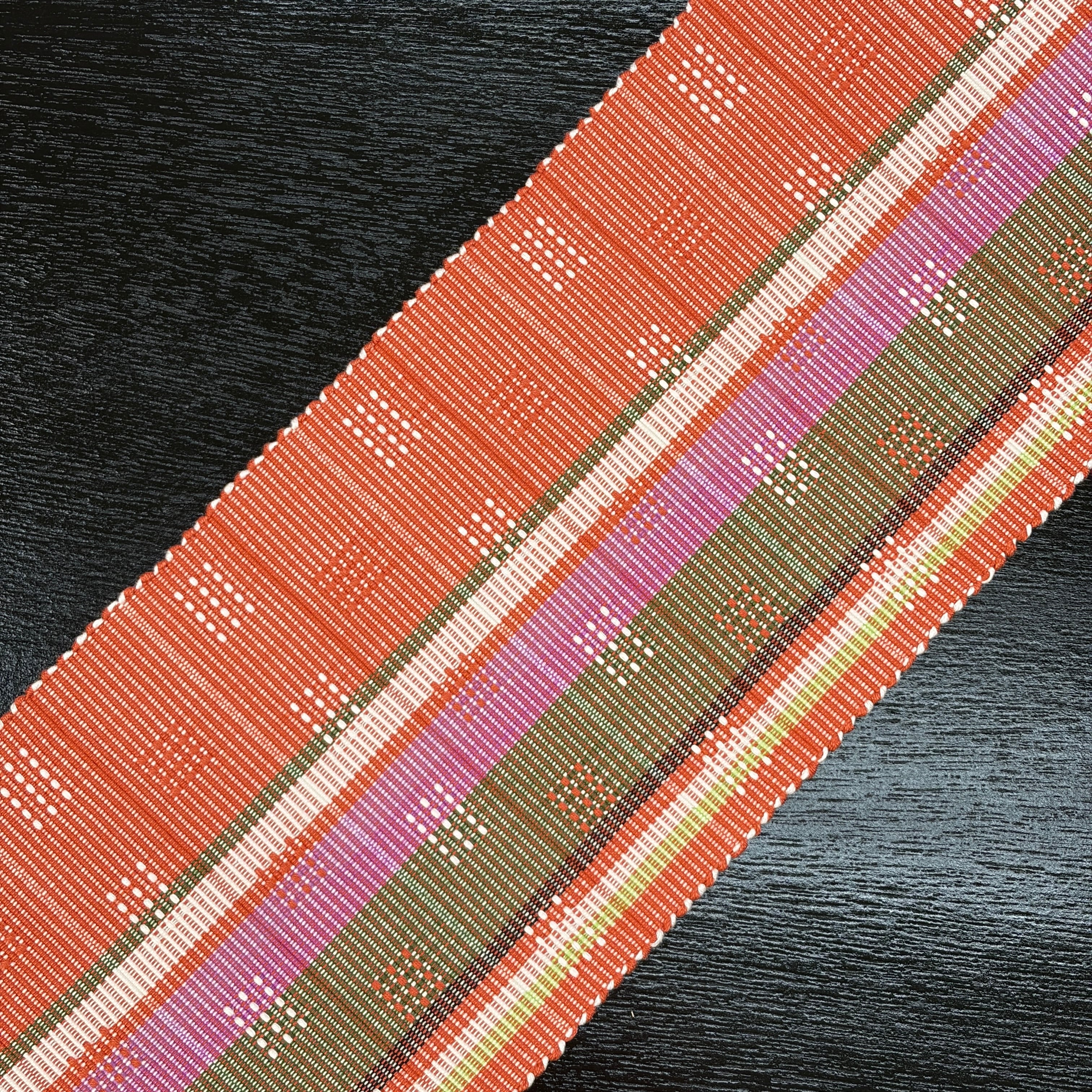 赤丹色(あかにいろ・強い赤系の色)に菖蒲色、黄緑、緑、薄藍、白が経縞に入り、アシンメトリーな色分けがされ、白と赤丹色で四角いドットの花織を織り表した個性的な『首里花織の半幅帯』です。