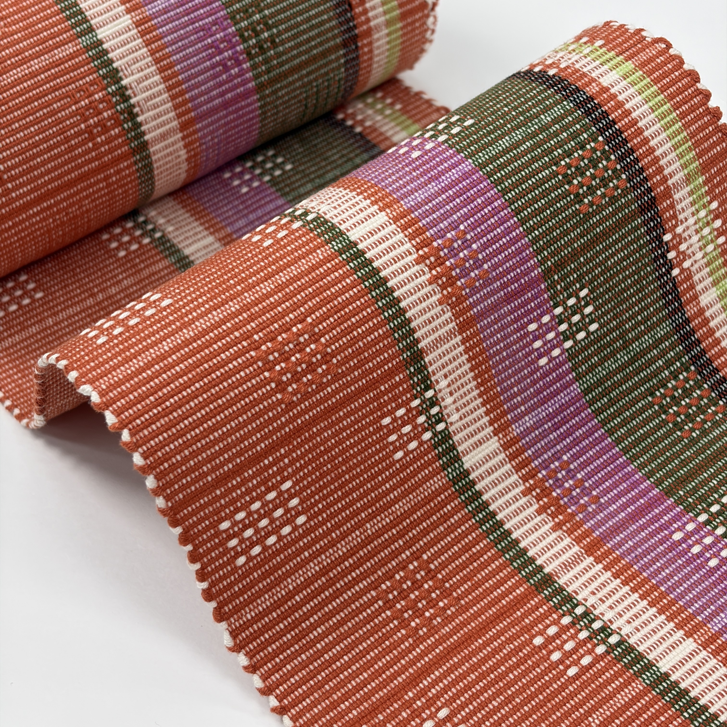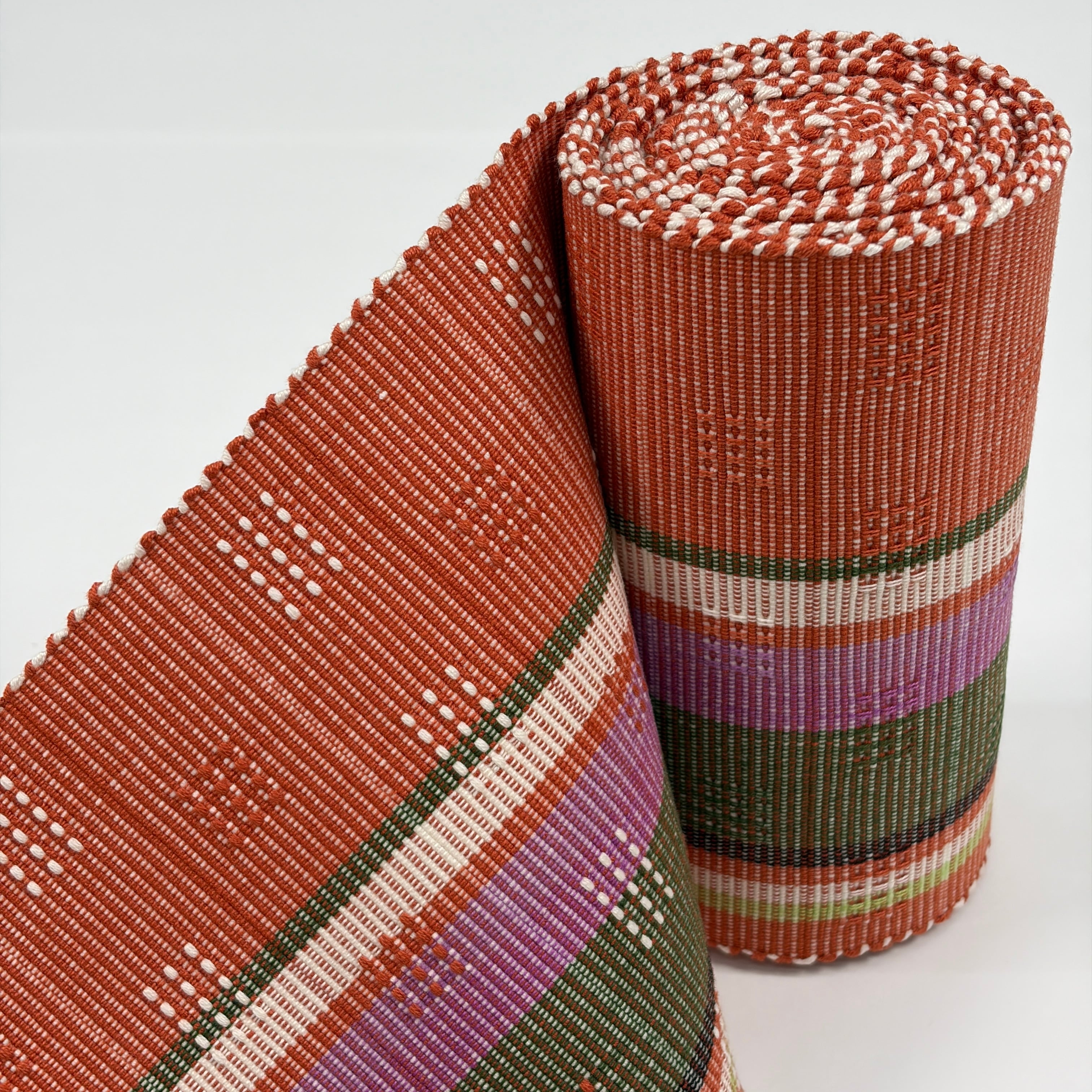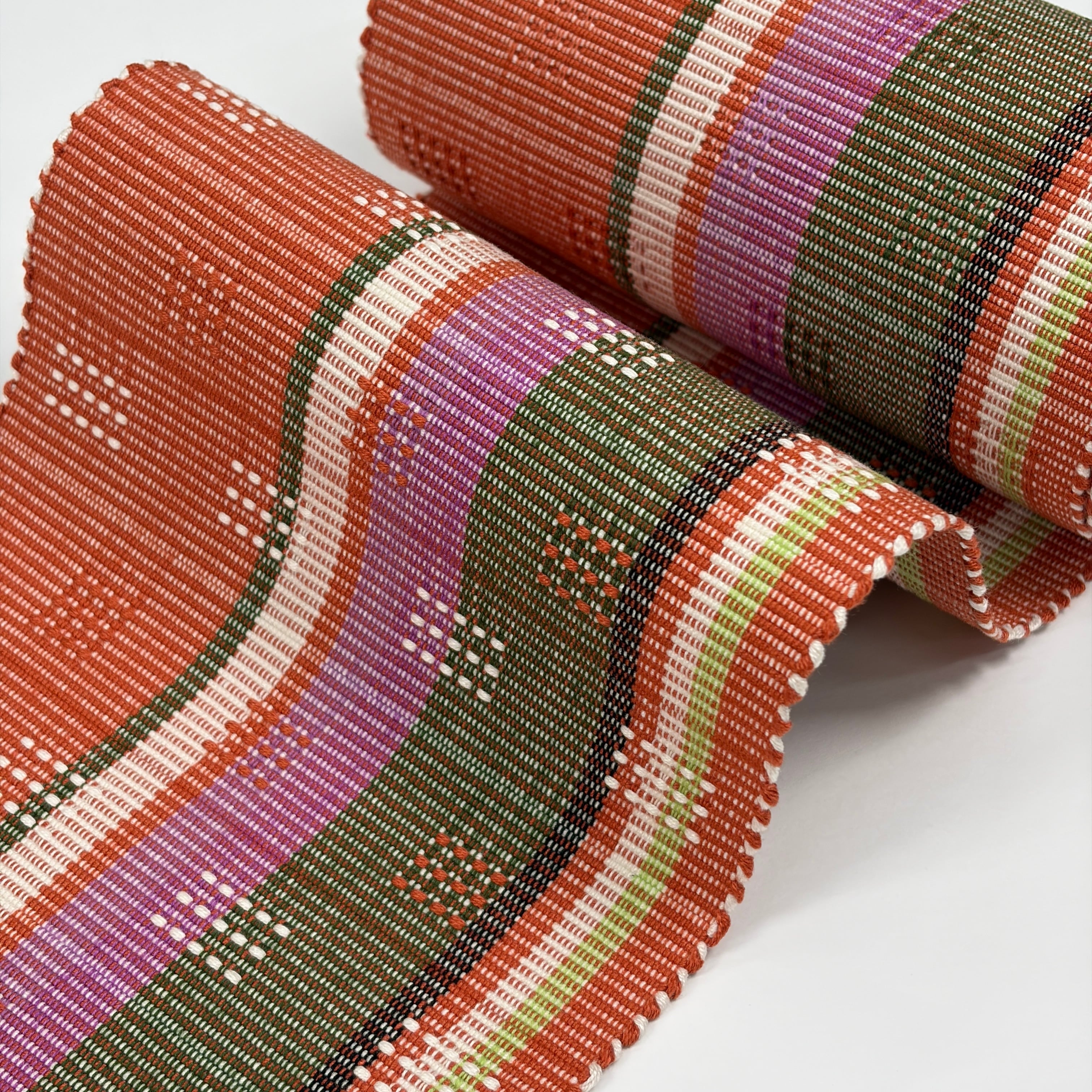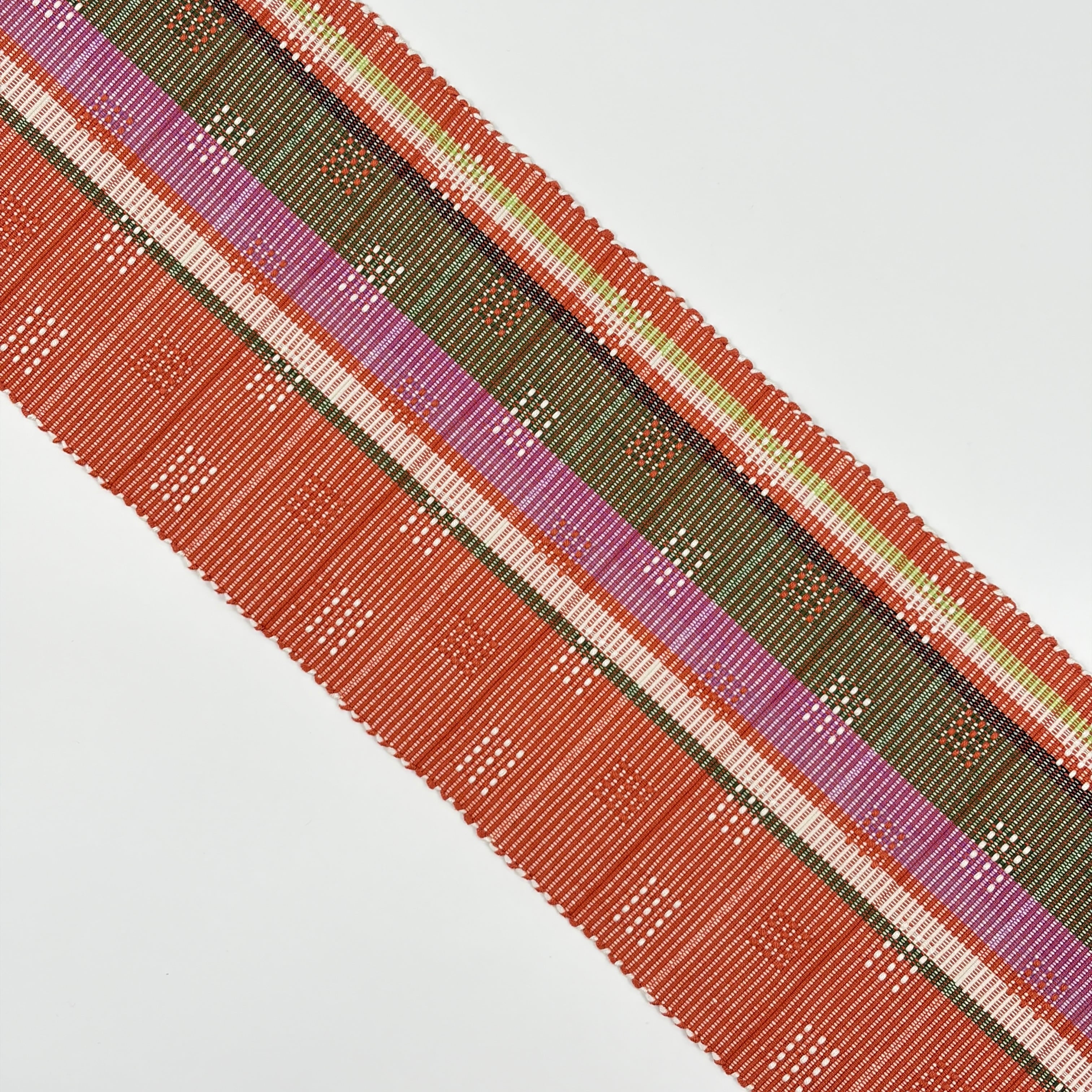 赤丹色(あかにいろ・強い赤系の色)に菖蒲色、黄緑、緑、薄藍、白が経縞に入り、アシンメトリーな色分けがされ、白と赤丹色で四角いドットの花織を織り表した個性的な『首里花織の半幅帯』です。