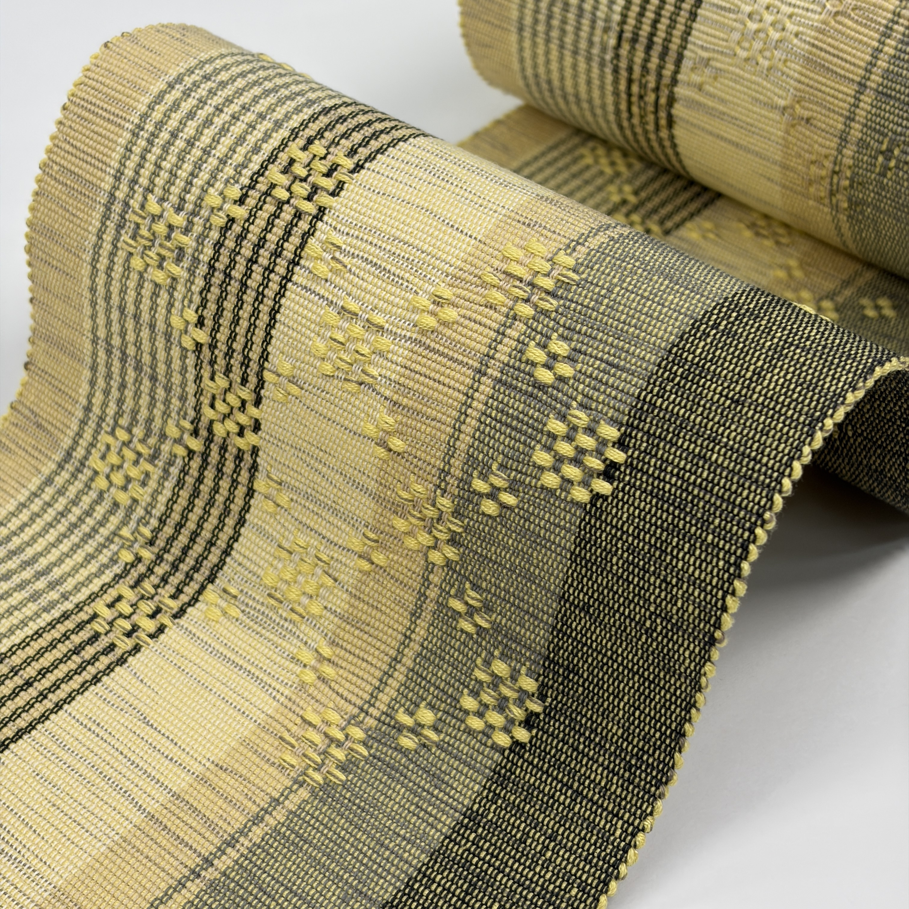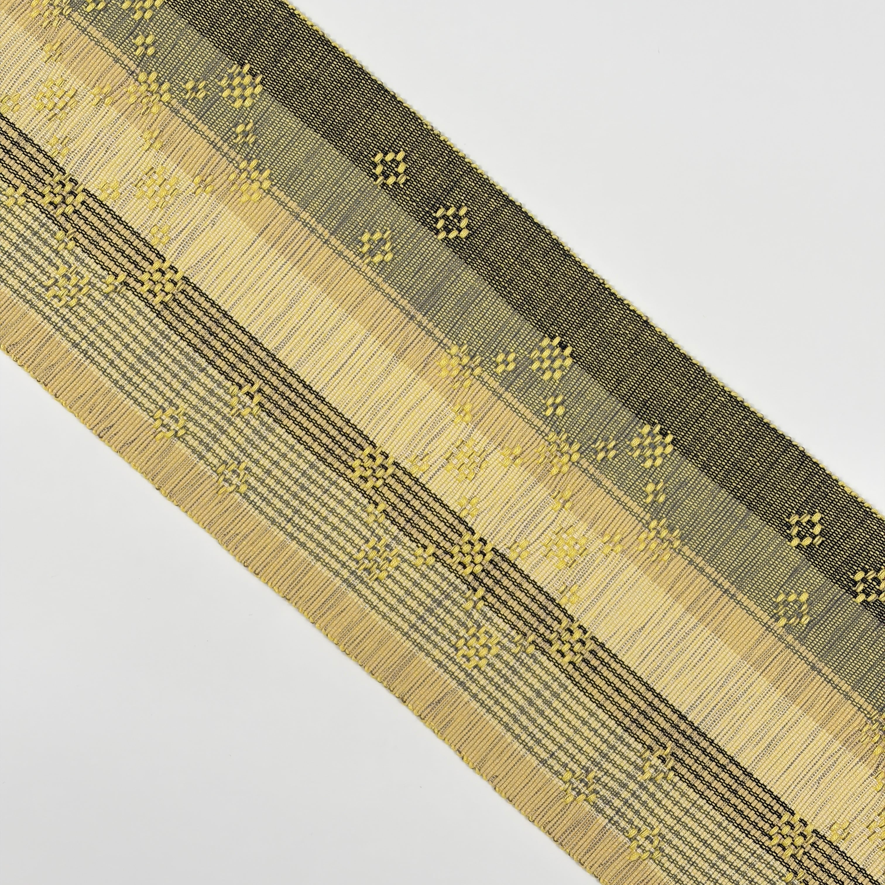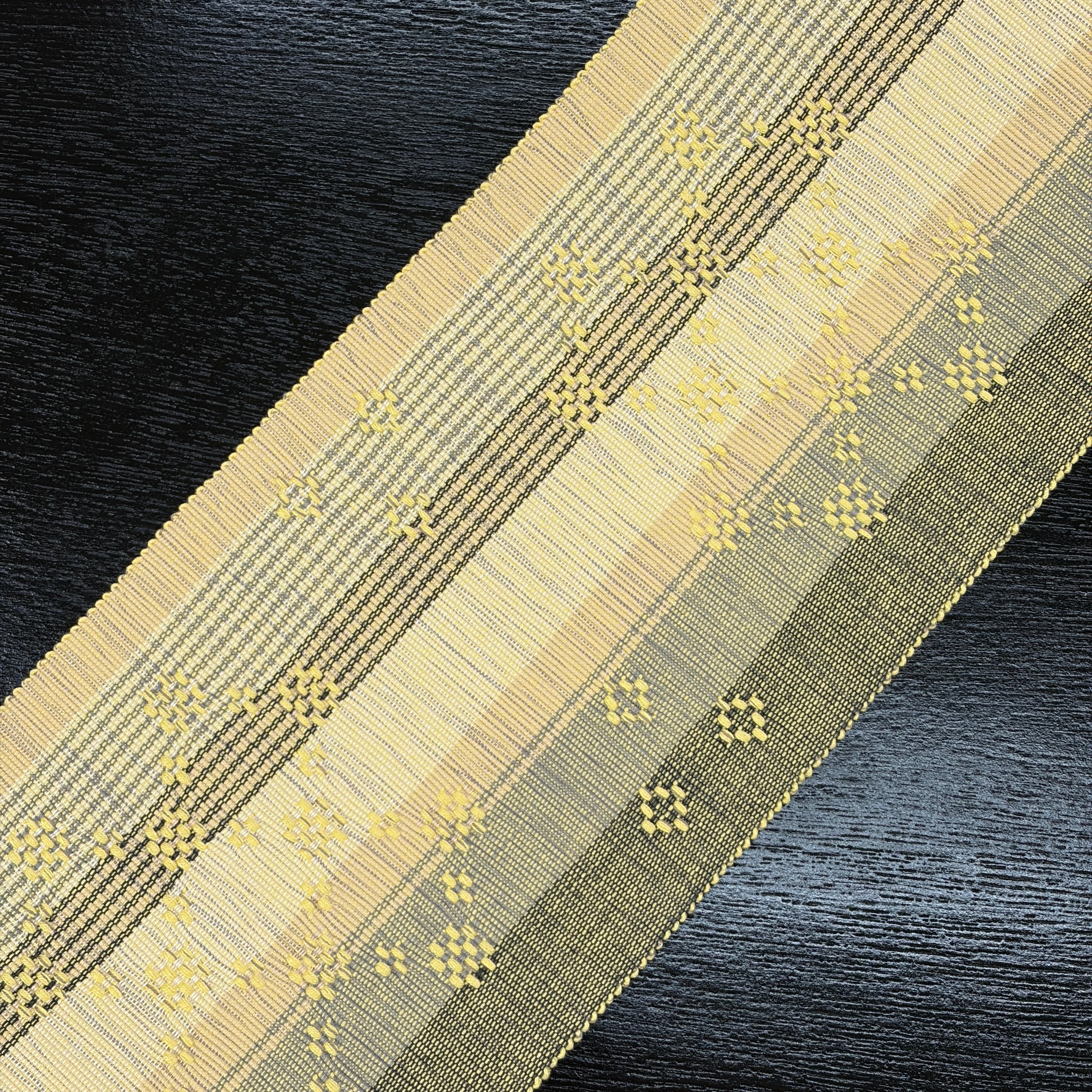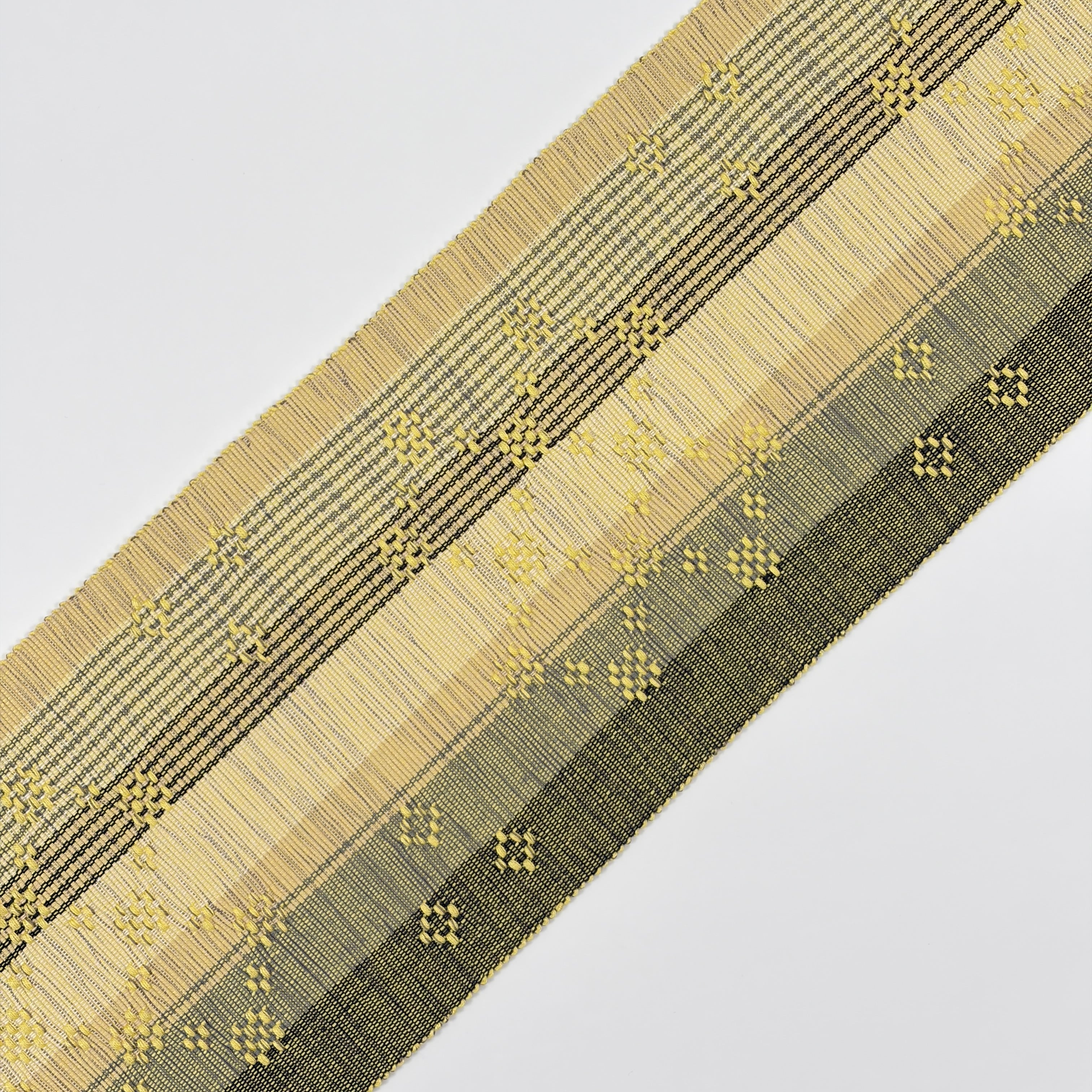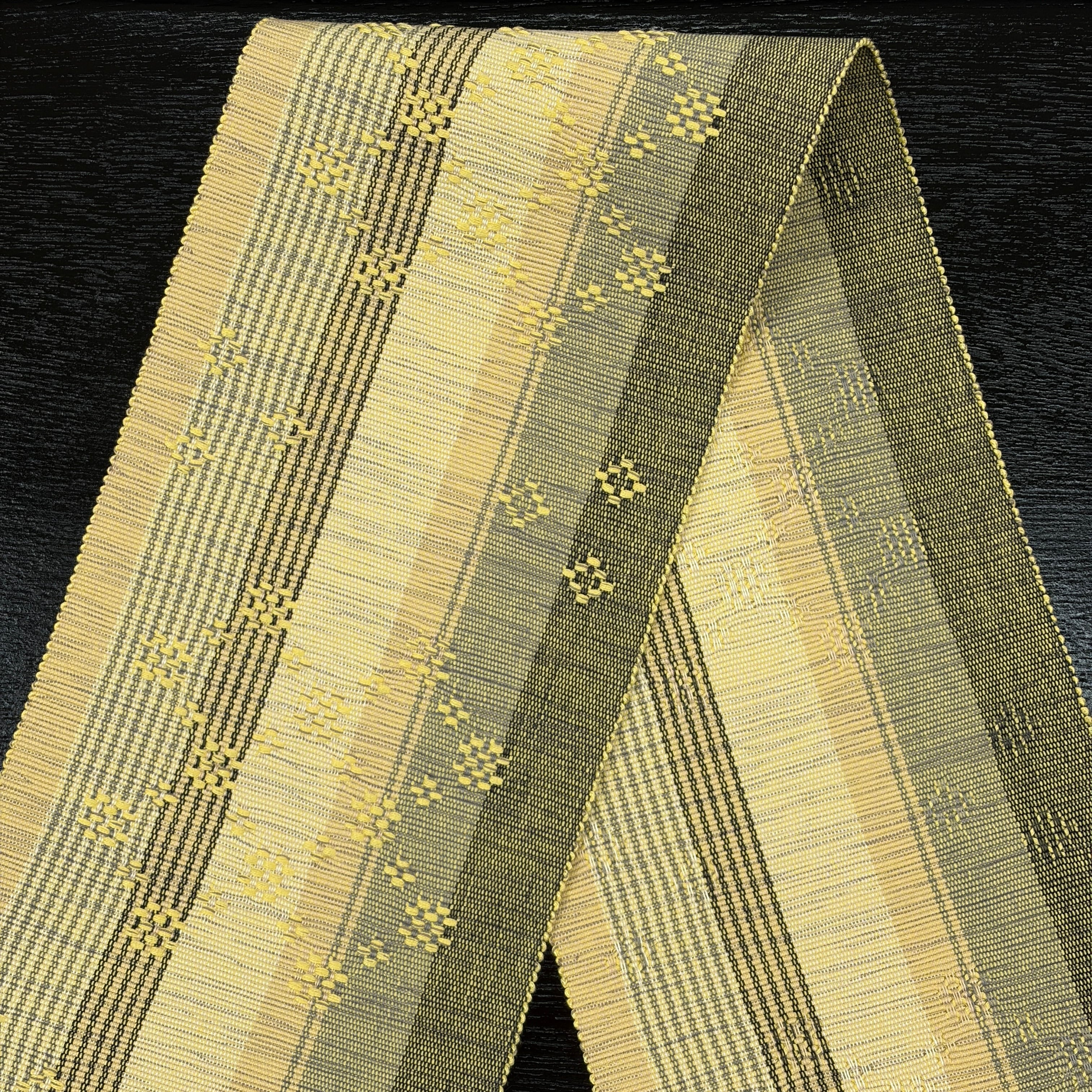 淡黄色、芥子色(からしいろ)、深川鼠(ふかがわねず・やや灰色い黄緑系)、濃いグレーの糸でいろんな幅で縞を表し、淡黄色の花織も可愛らしく、よく見るとグレーの糸を合わせてた合糸(ごうし)になっているため柔らかい雰囲気の『首里花織の半幅帯』です。
