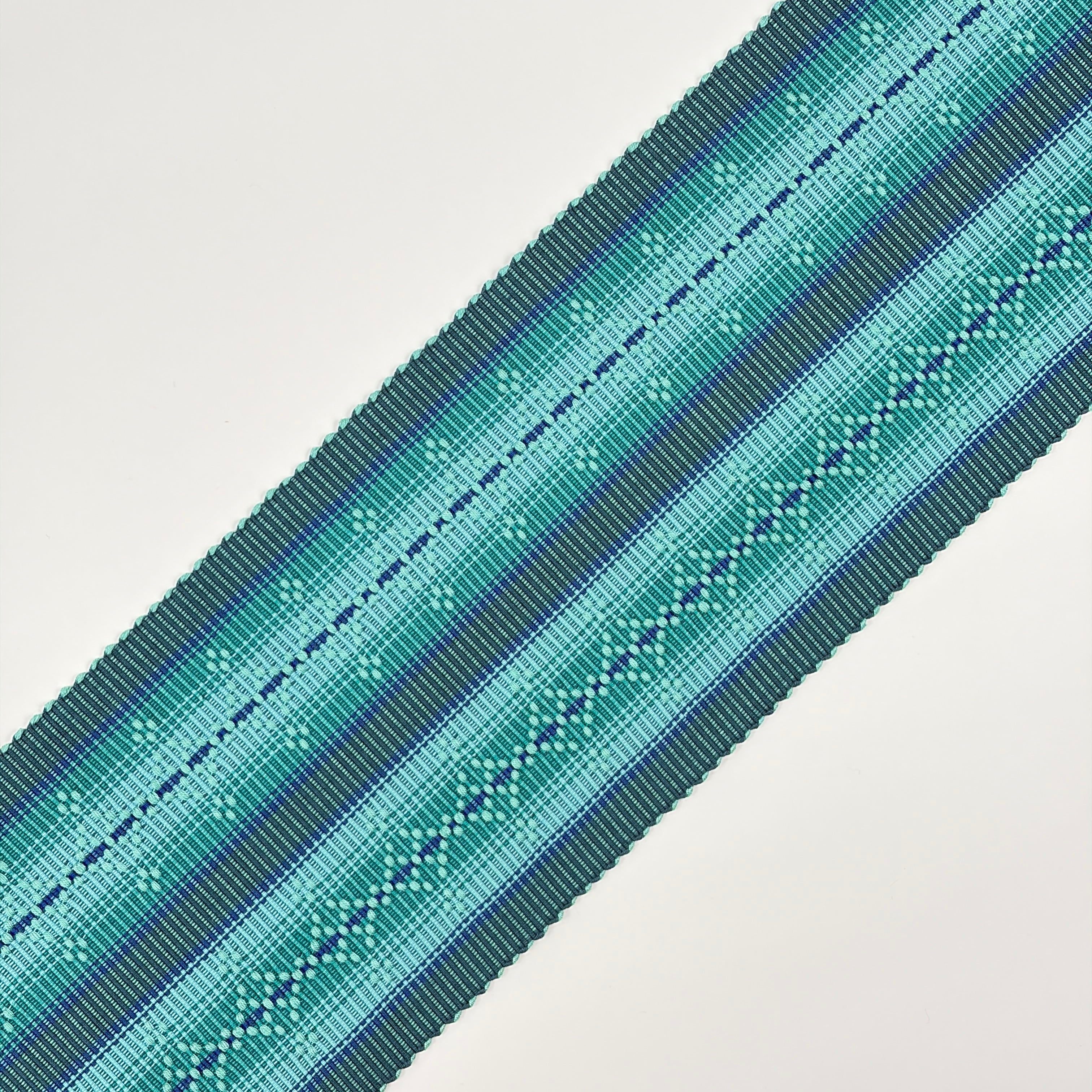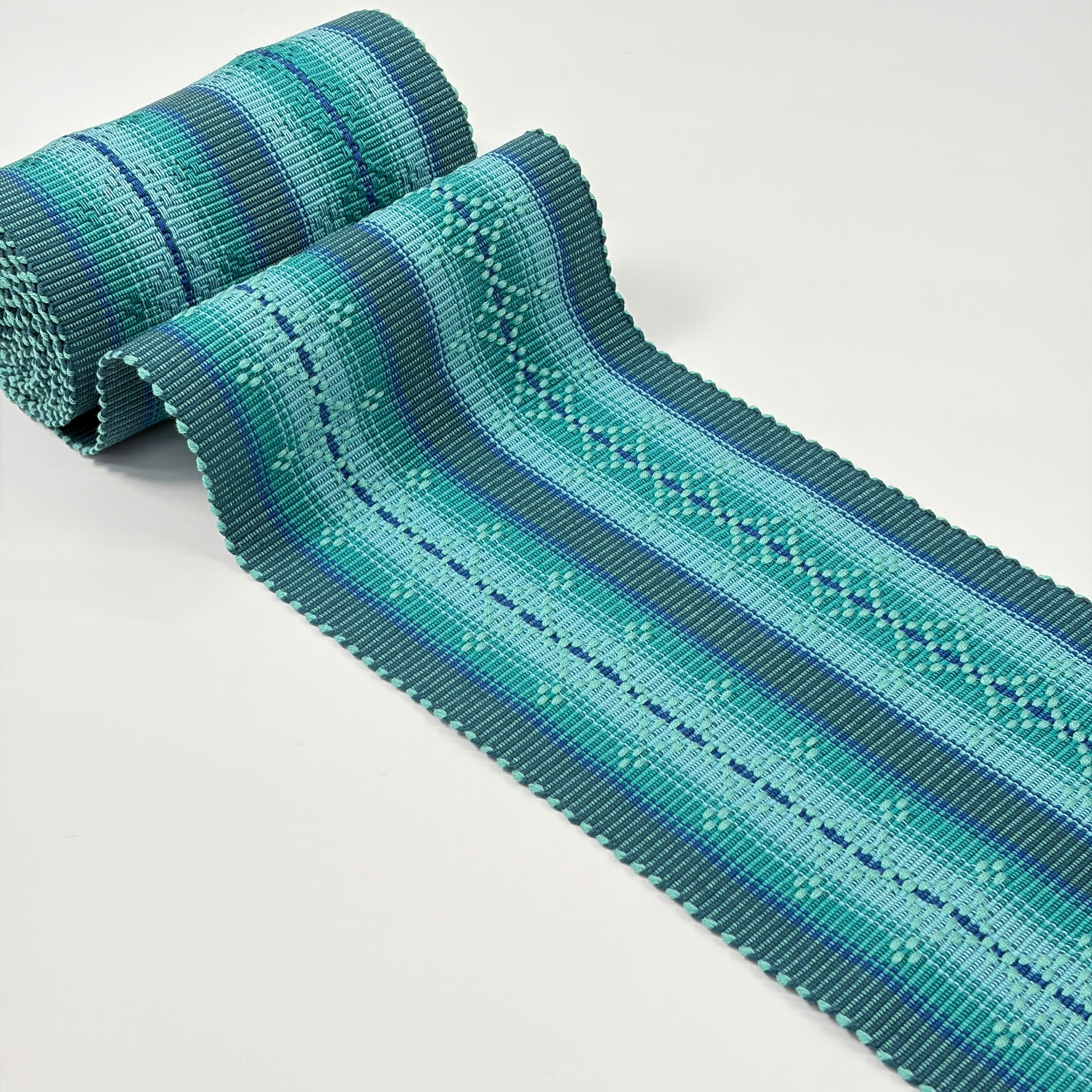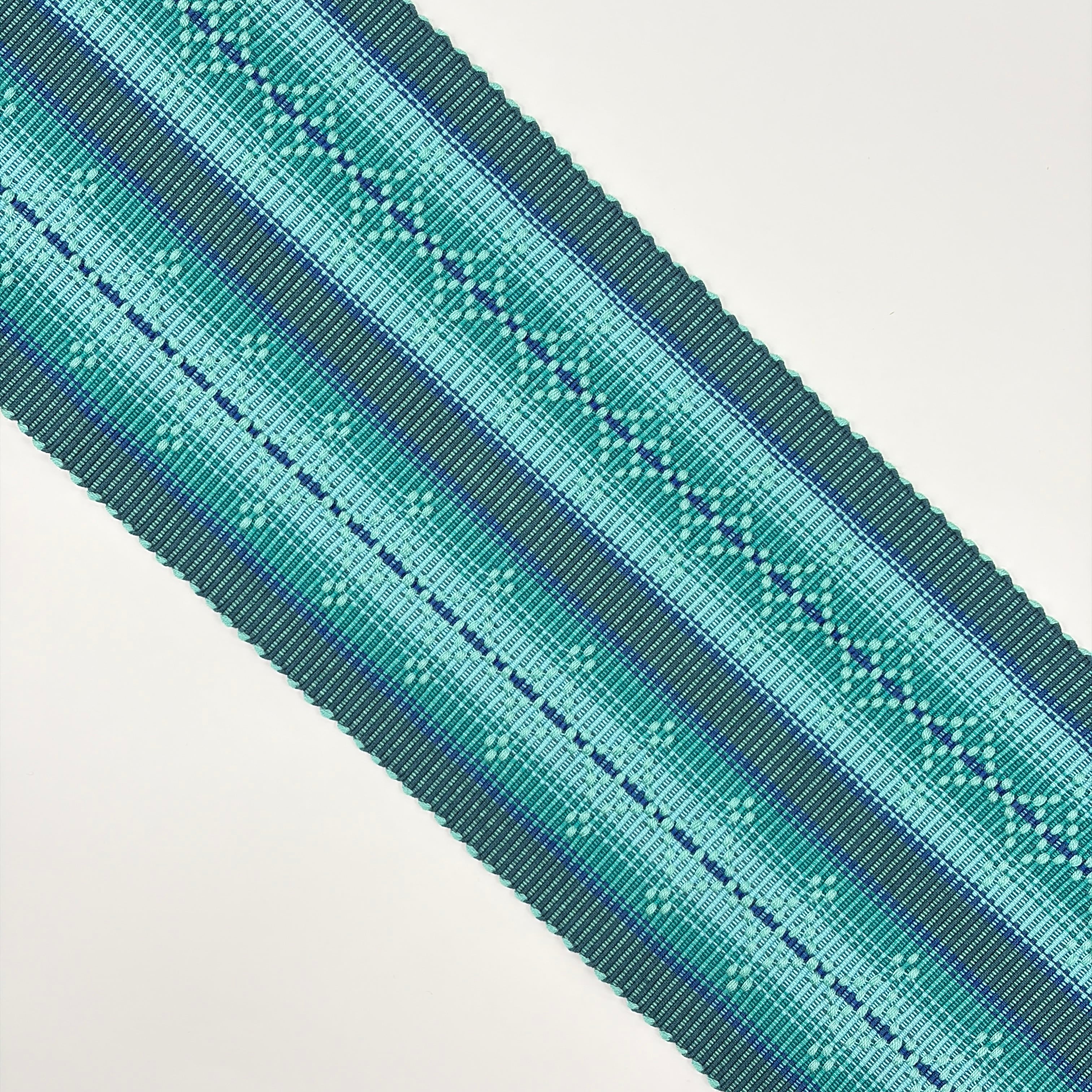 青緑、青磁色、千歳緑(ちとせみどり・暗い緑系)といった緑色系のグラデーションで縞を表し、青磁色の花織が整列して並び、紺色のラインがアクセントになっています。粋な大人の『首里花織の半幅帯』。年中活躍してくれそうな濃い目の大人な色合いです。