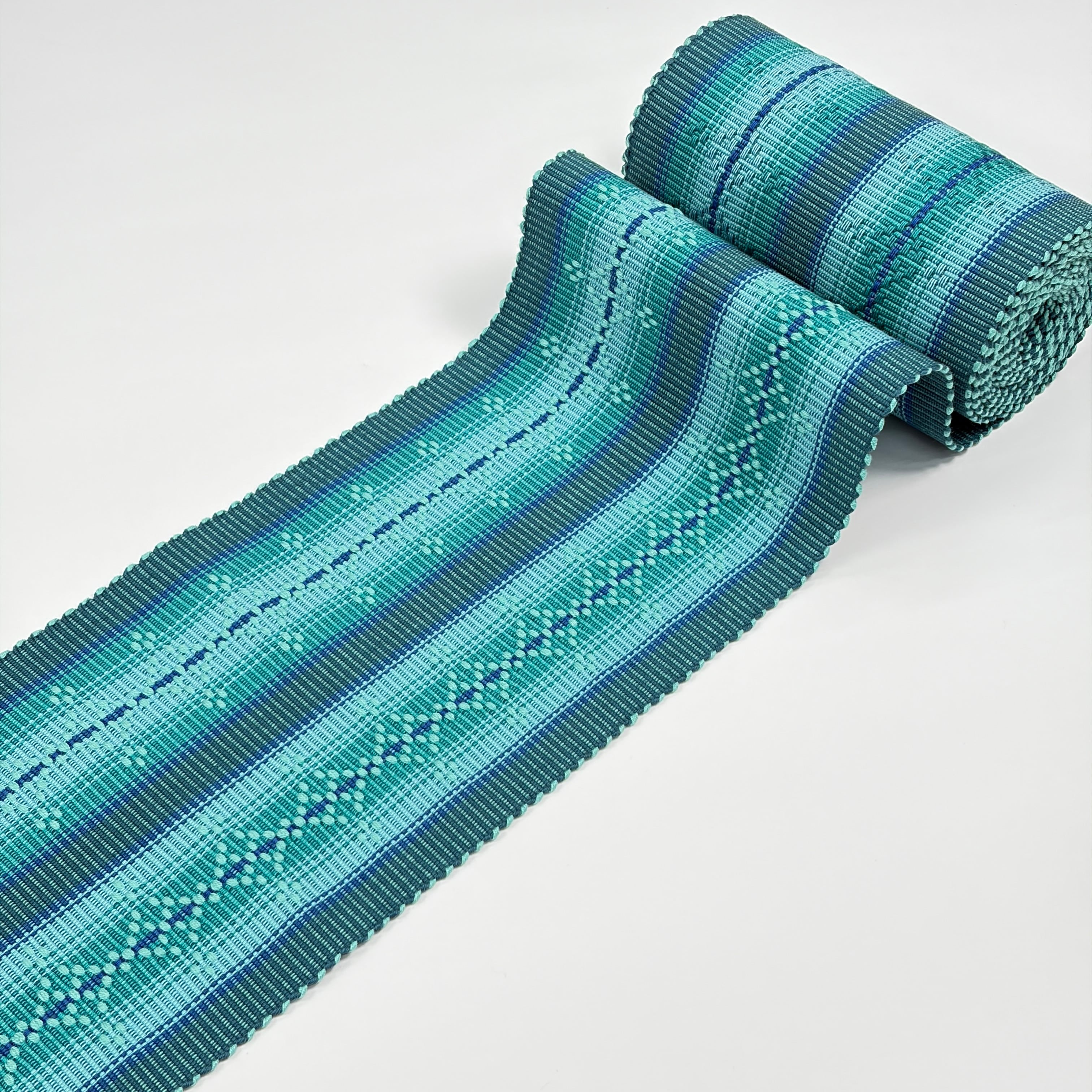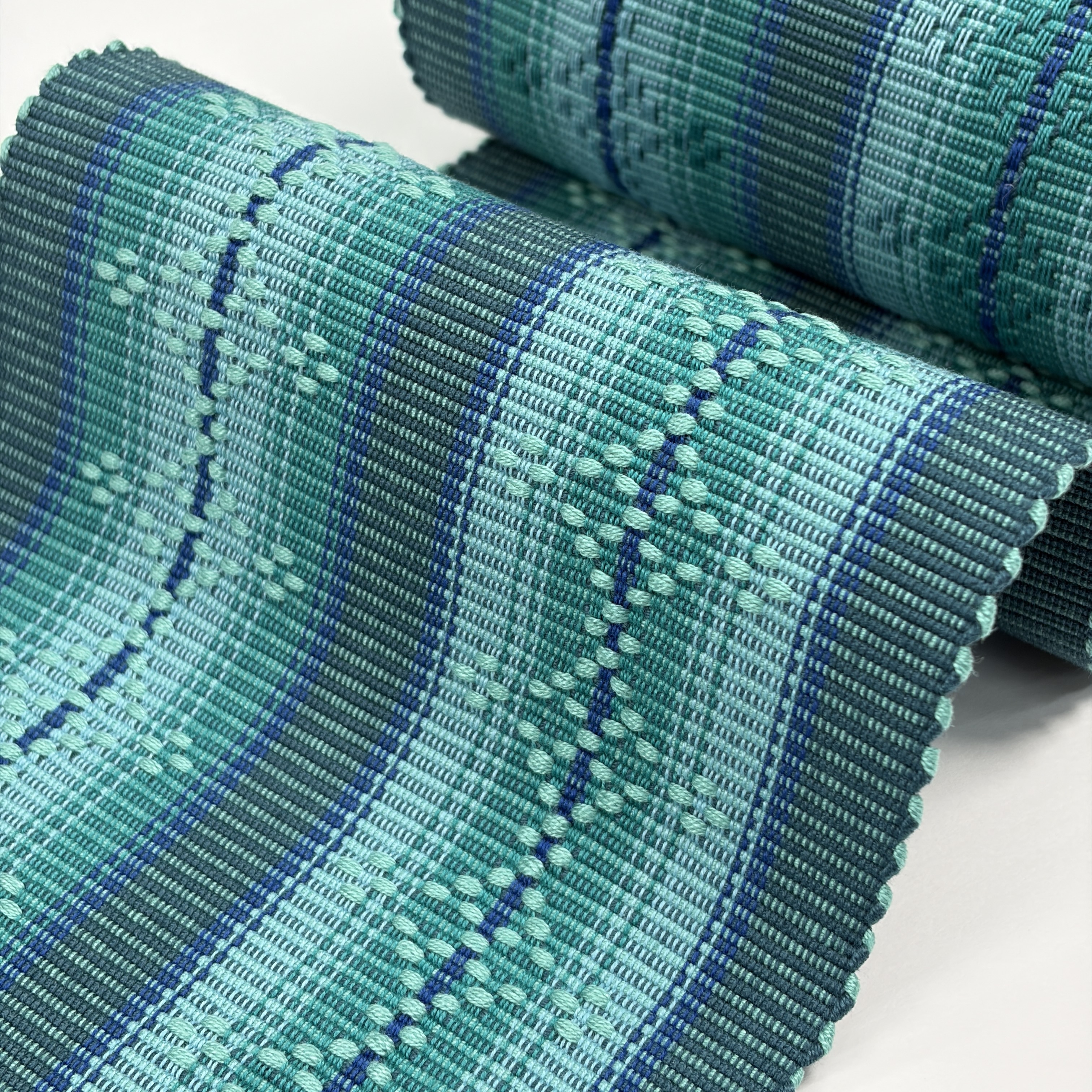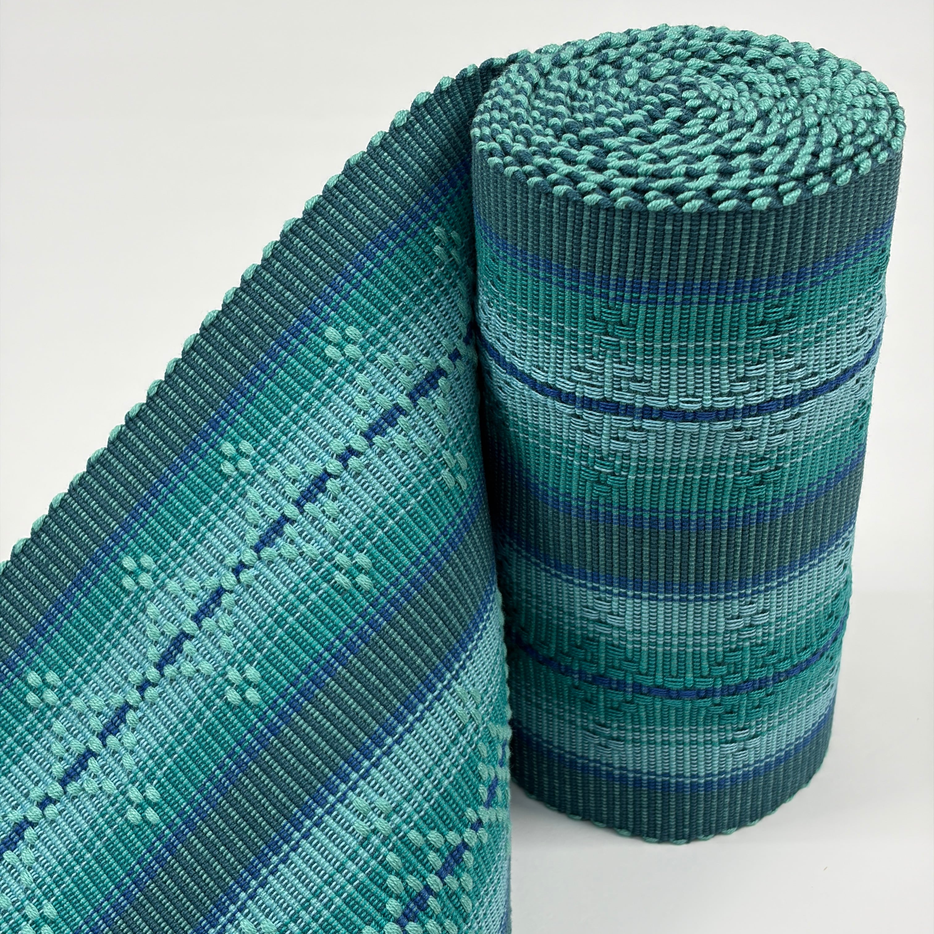 青緑、青磁色、千歳緑(ちとせみどり・暗い緑系)といった緑色系のグラデーションで縞を表し、青磁色の花織が整列して並び、紺色のラインがアクセントになっています。粋な大人の『首里花織の半幅帯』。年中活躍してくれそうな濃い目の大人な色合いです。