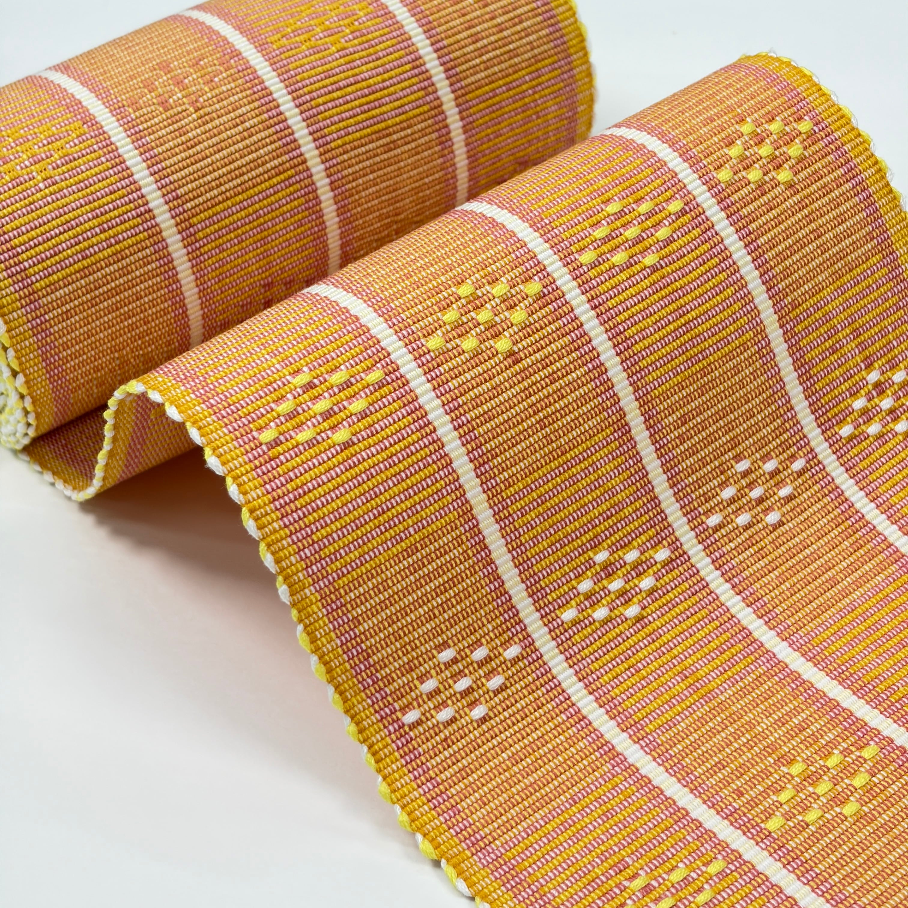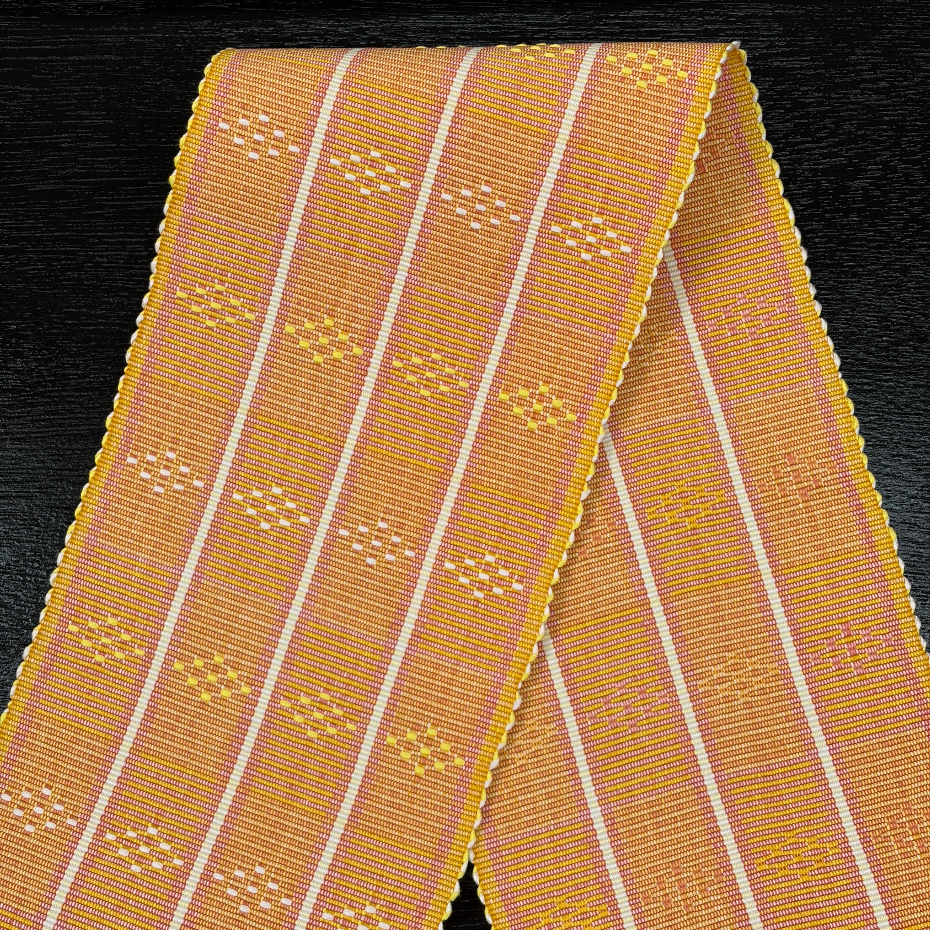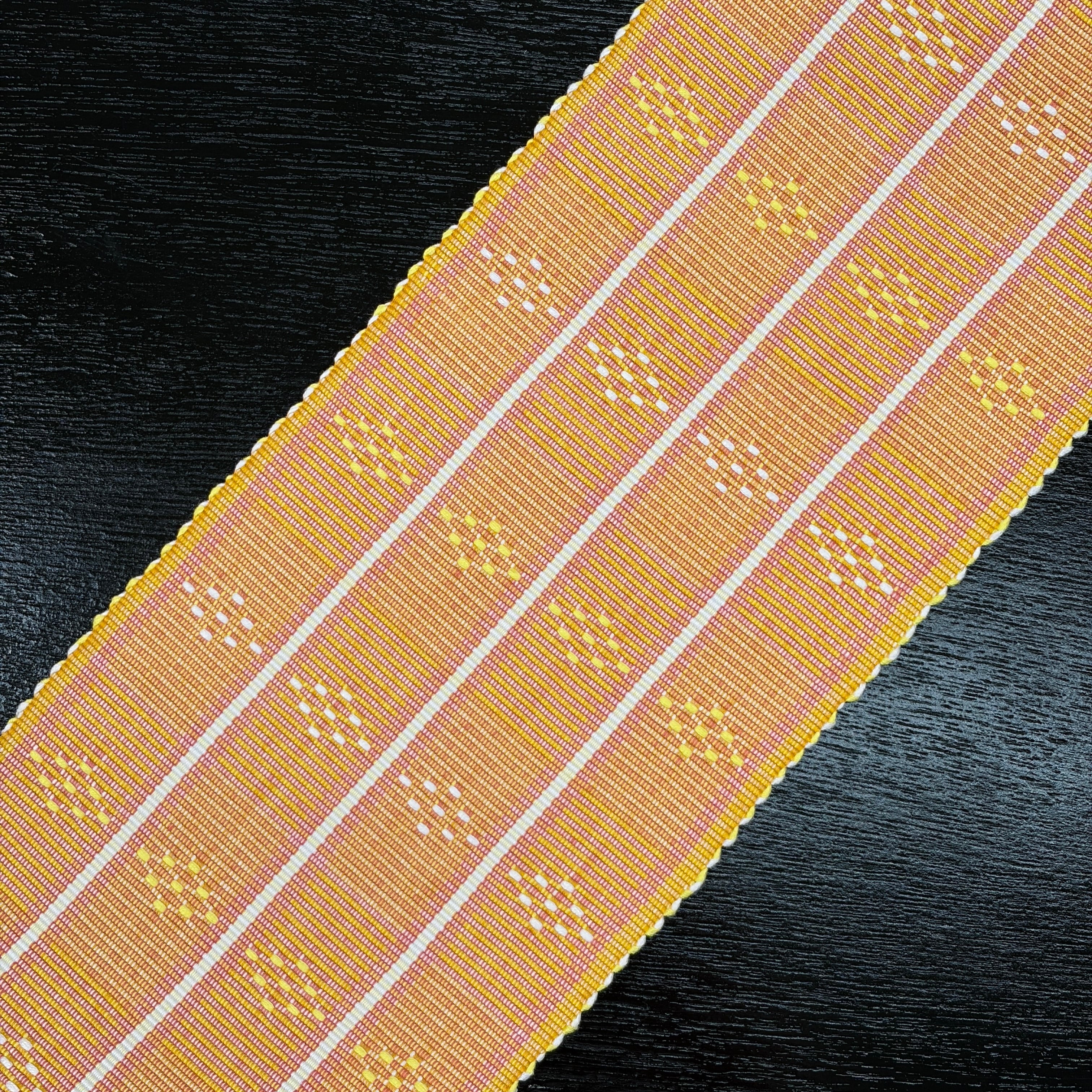 黄色、珊瑚朱色(さんごしゅいろ)の糸が混じったピーチカラーで等間隔の縞を表し、白のラインがアクセントに、黄色と白の花織が菱形を表し、明るい色ながらクールな雰囲気も持つ『首里花織の半幅帯』です。