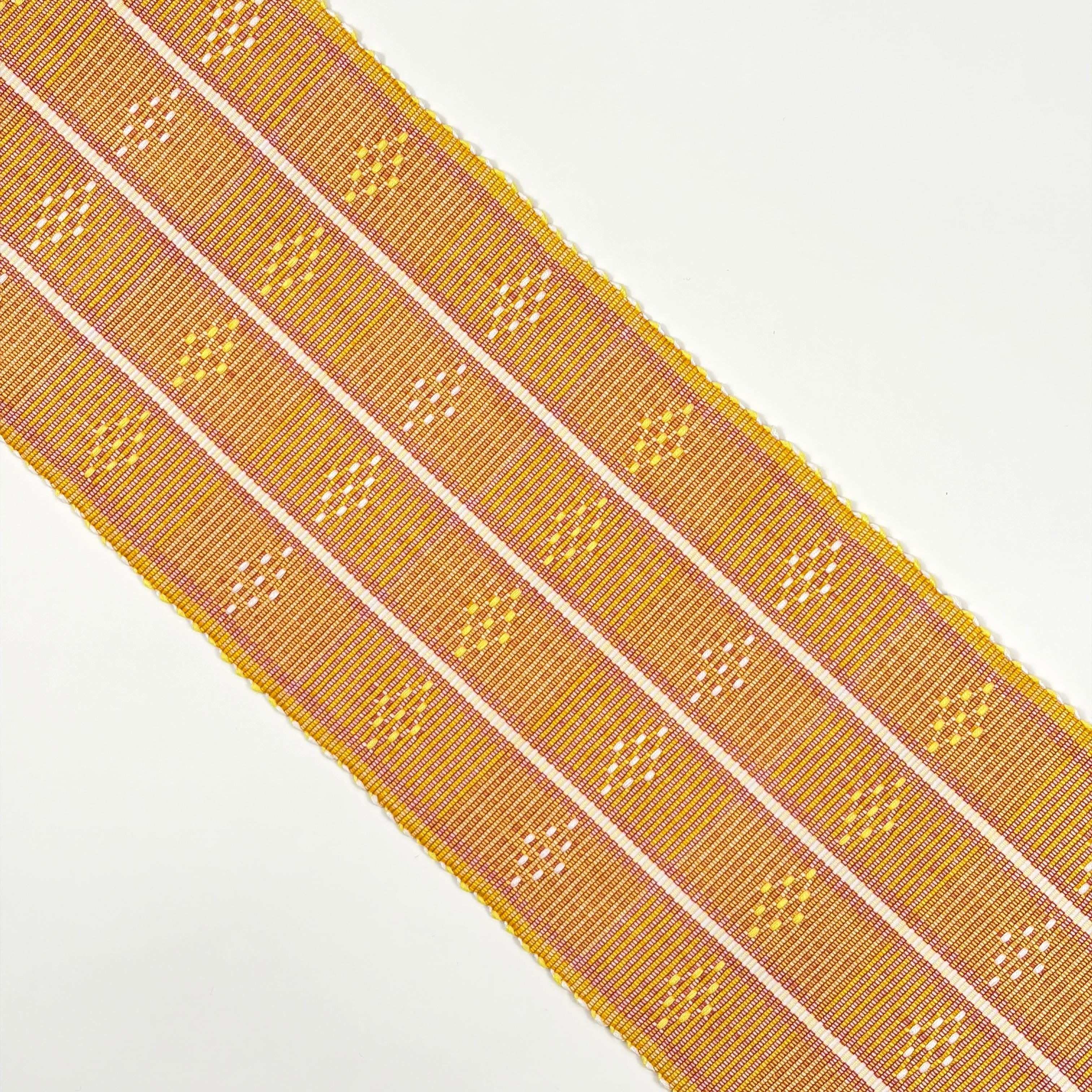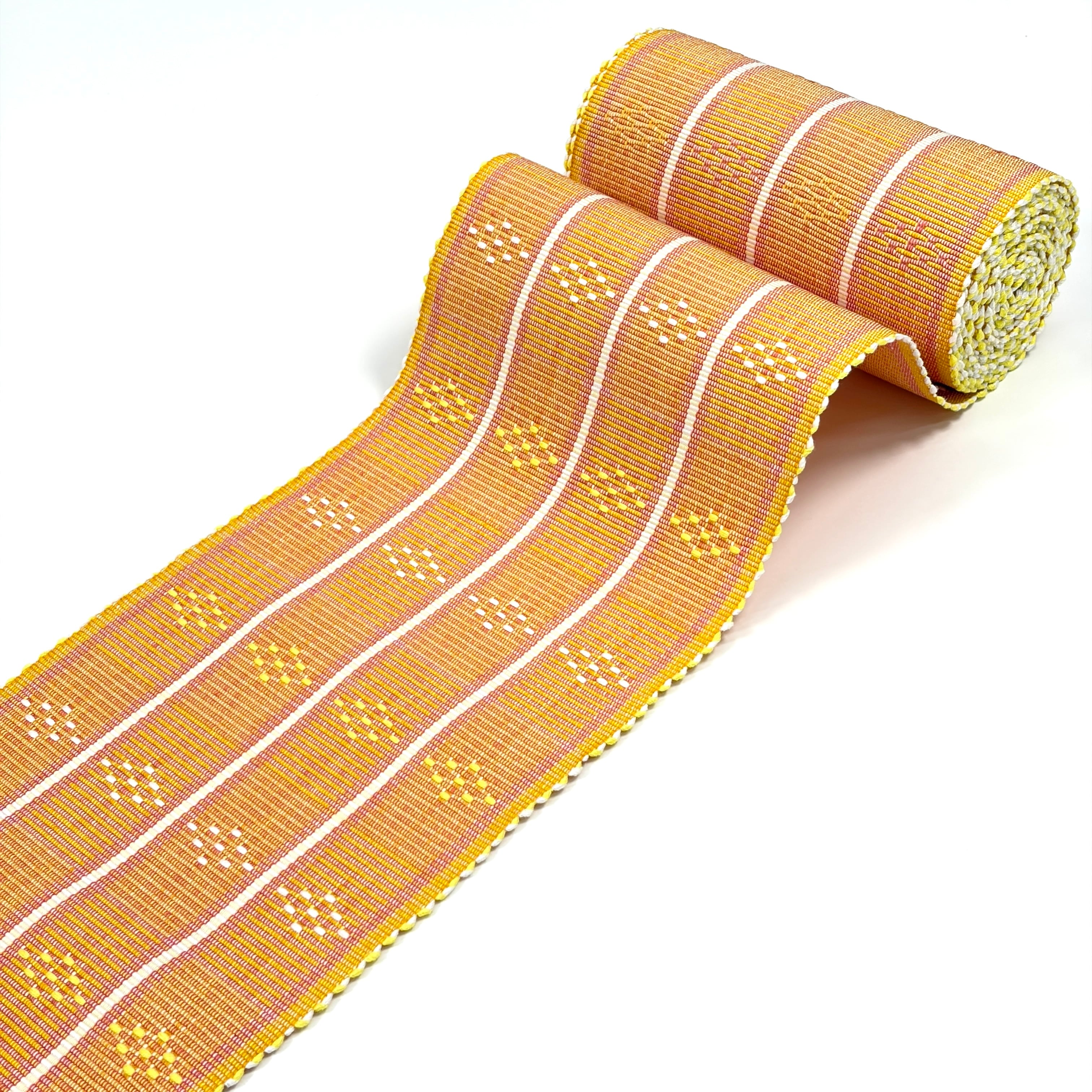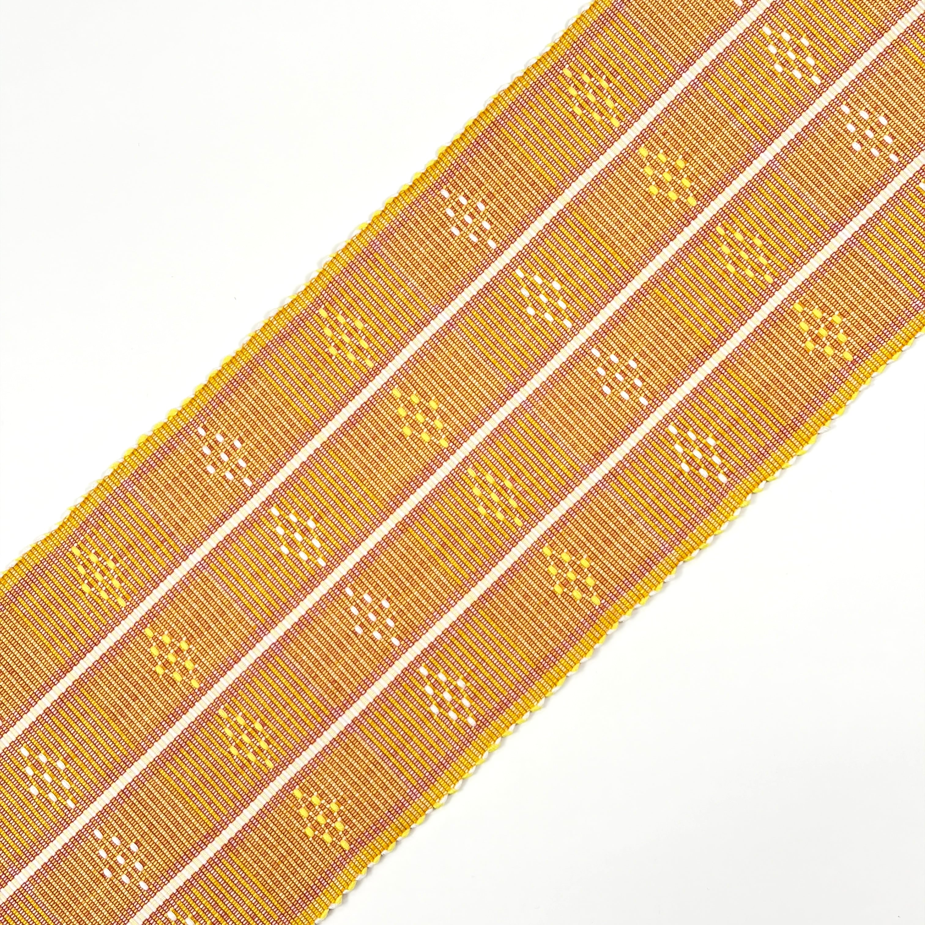 黄色、珊瑚朱色(さんごしゅいろ)の糸が混じったピーチカラーで等間隔の縞を表し、白のラインがアクセントに、黄色と白の花織が菱形を表し、明るい色ながらクールな雰囲気も持つ『首里花織の半幅帯』です。