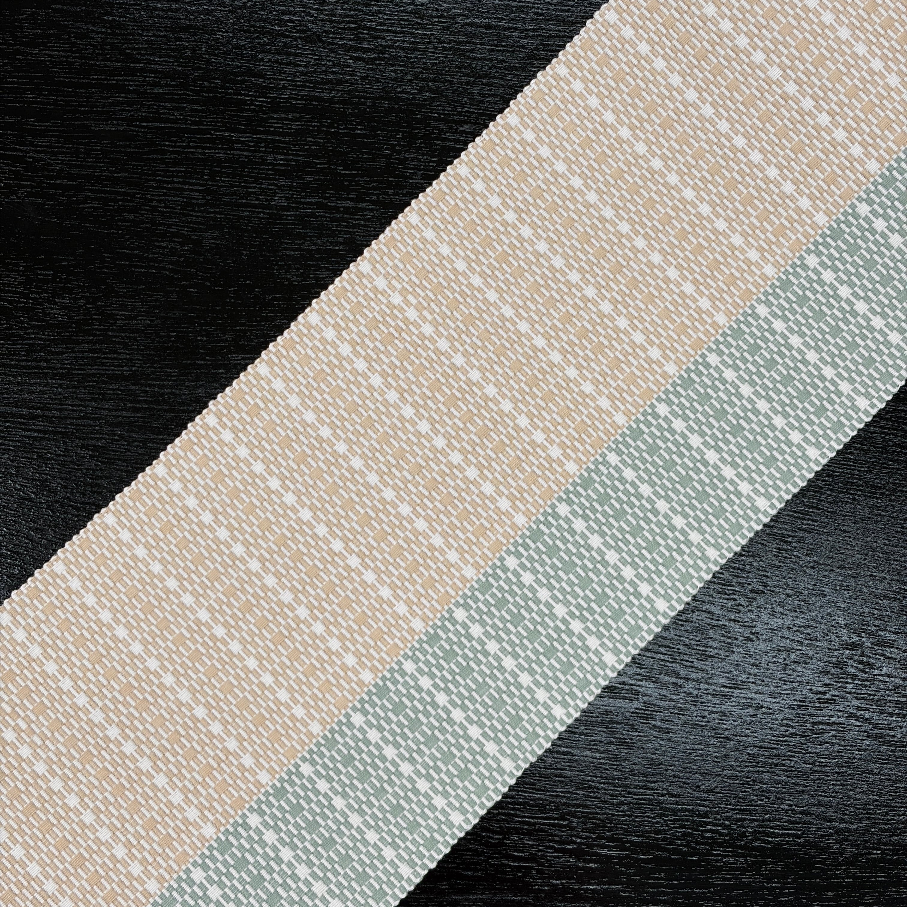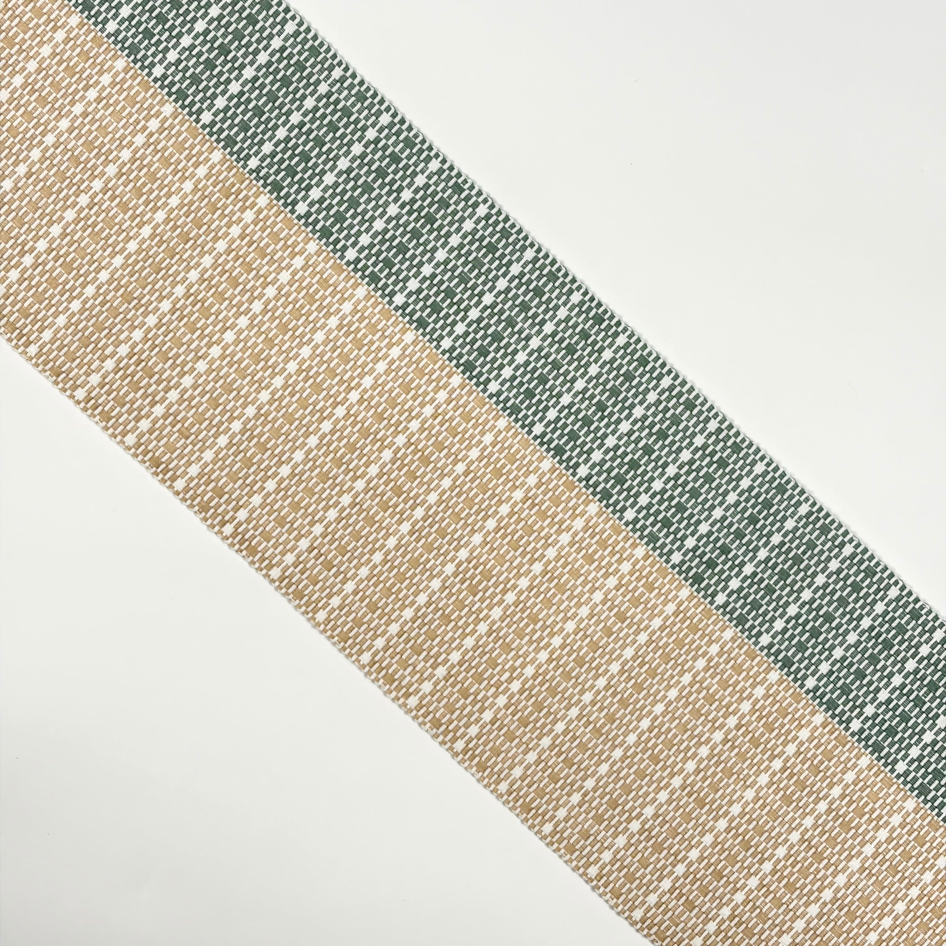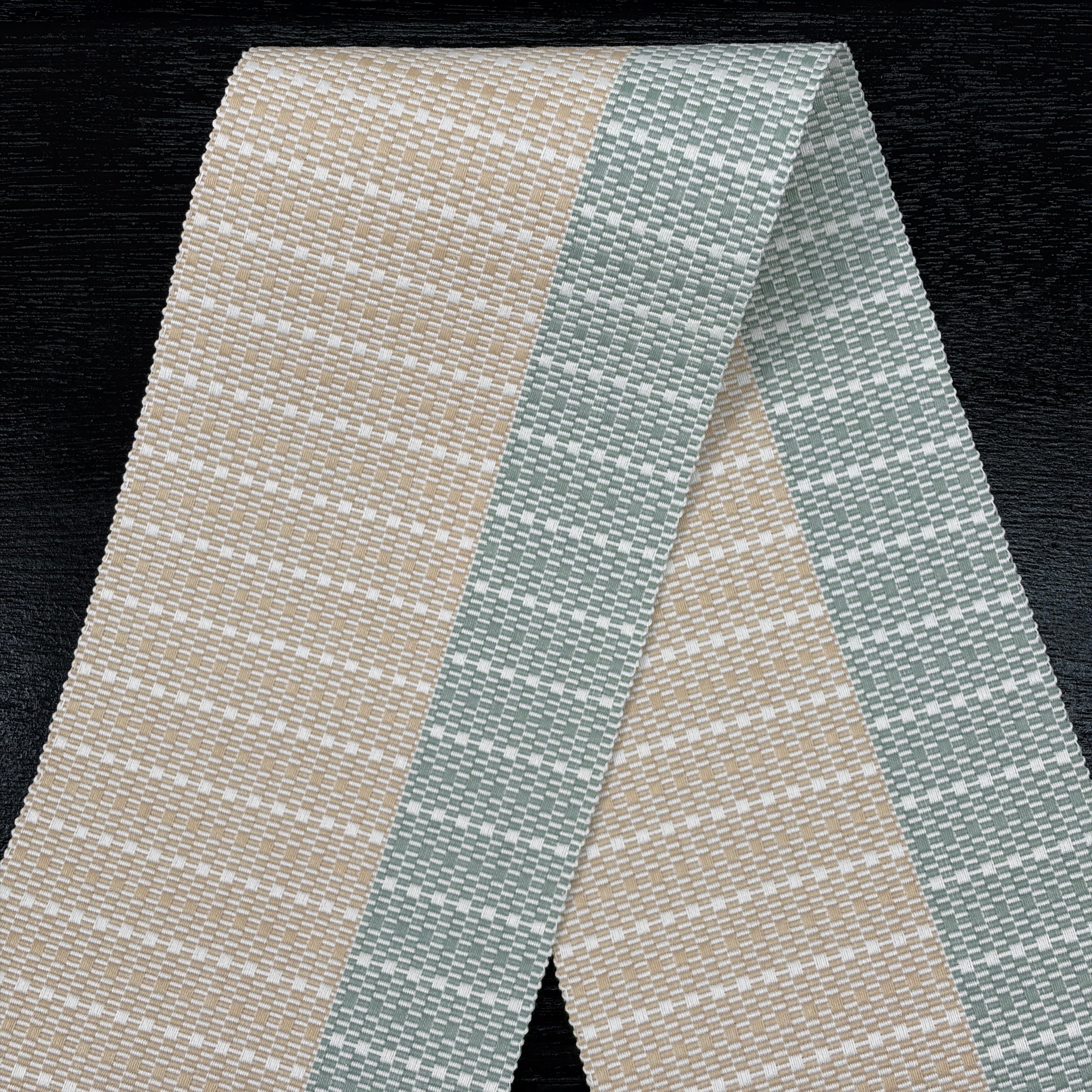 生成色と千草色(ちぐさいろ・やや灰色い緑系)のツートンカラーが美しい『首里道屯織の半幅帯』です。その中でも技術と手間が必要な『総道屯』となっています。アシンメトリーなデザインが格好良いテイストの帯となっています。幅の狭い千草色の方を上側にして締めると足長効果ありです(^ ^)