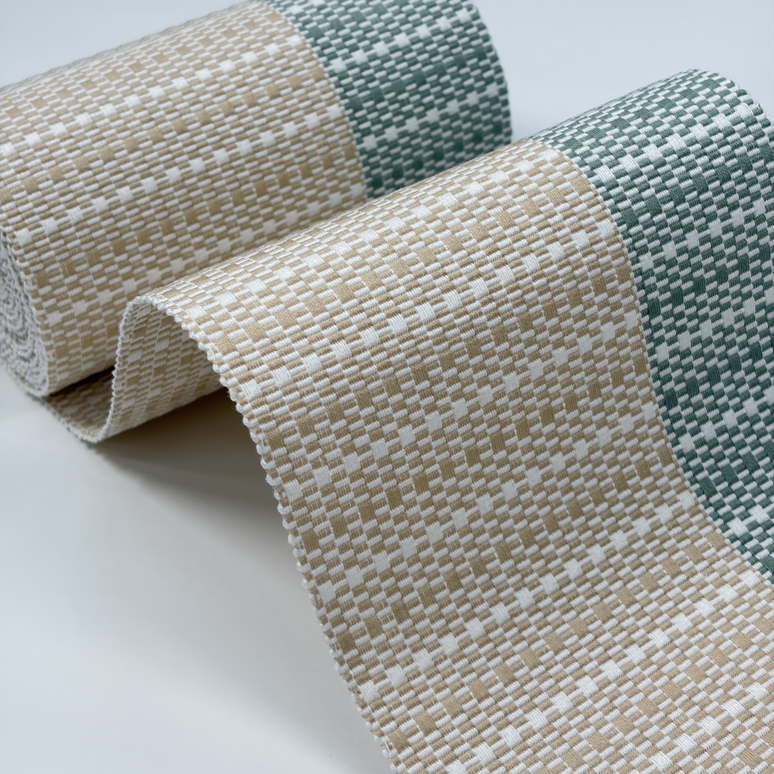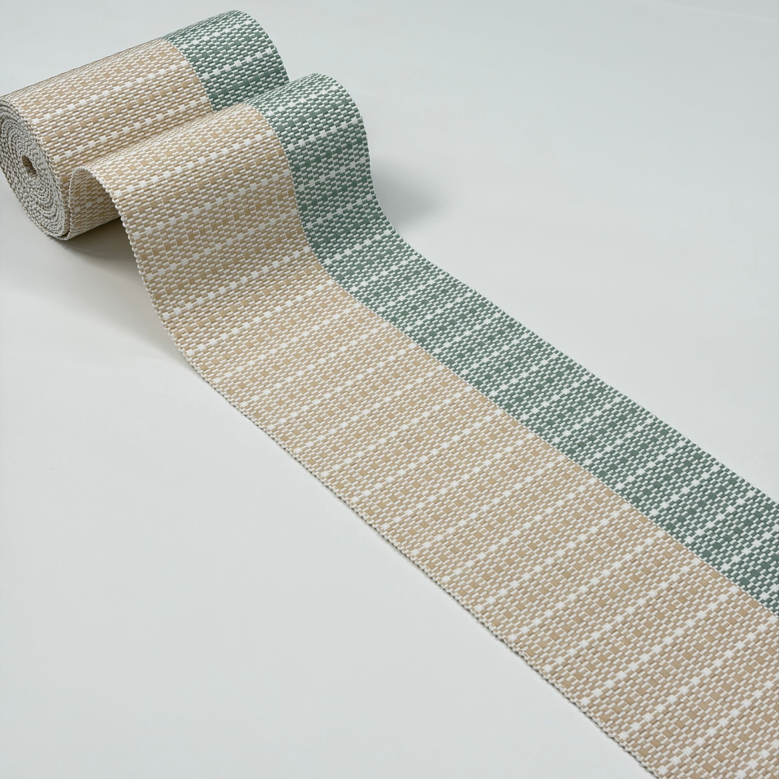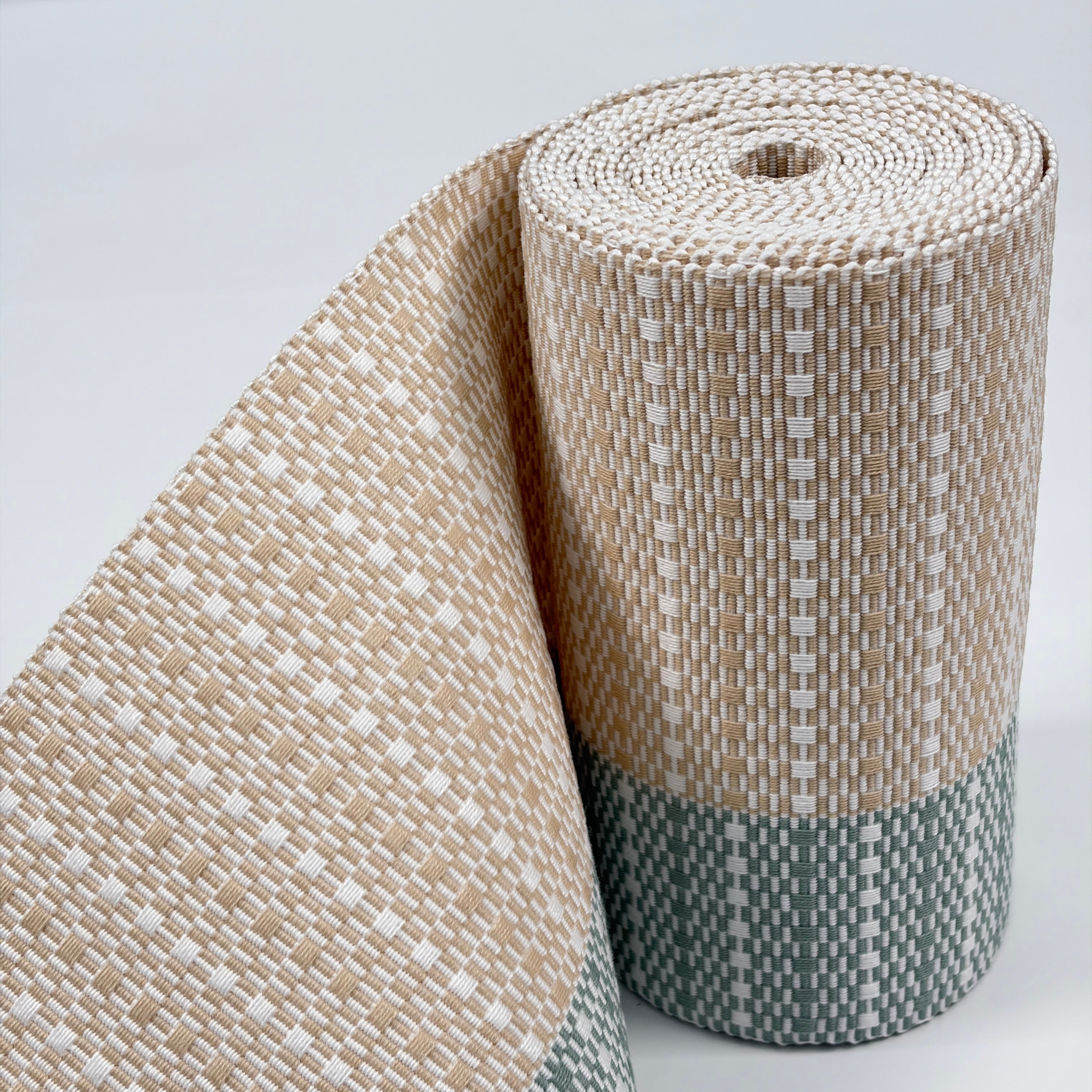 生成色と千草色(ちぐさいろ・やや灰色い緑系)のツートンカラーが美しい『首里道屯織の半幅帯』です。その中でも技術と手間が必要な『総道屯』となっています。アシンメトリーなデザインが格好良いテイストの帯となっています。幅の狭い千草色の方を上側にして締めると足長効果ありです(^ ^)