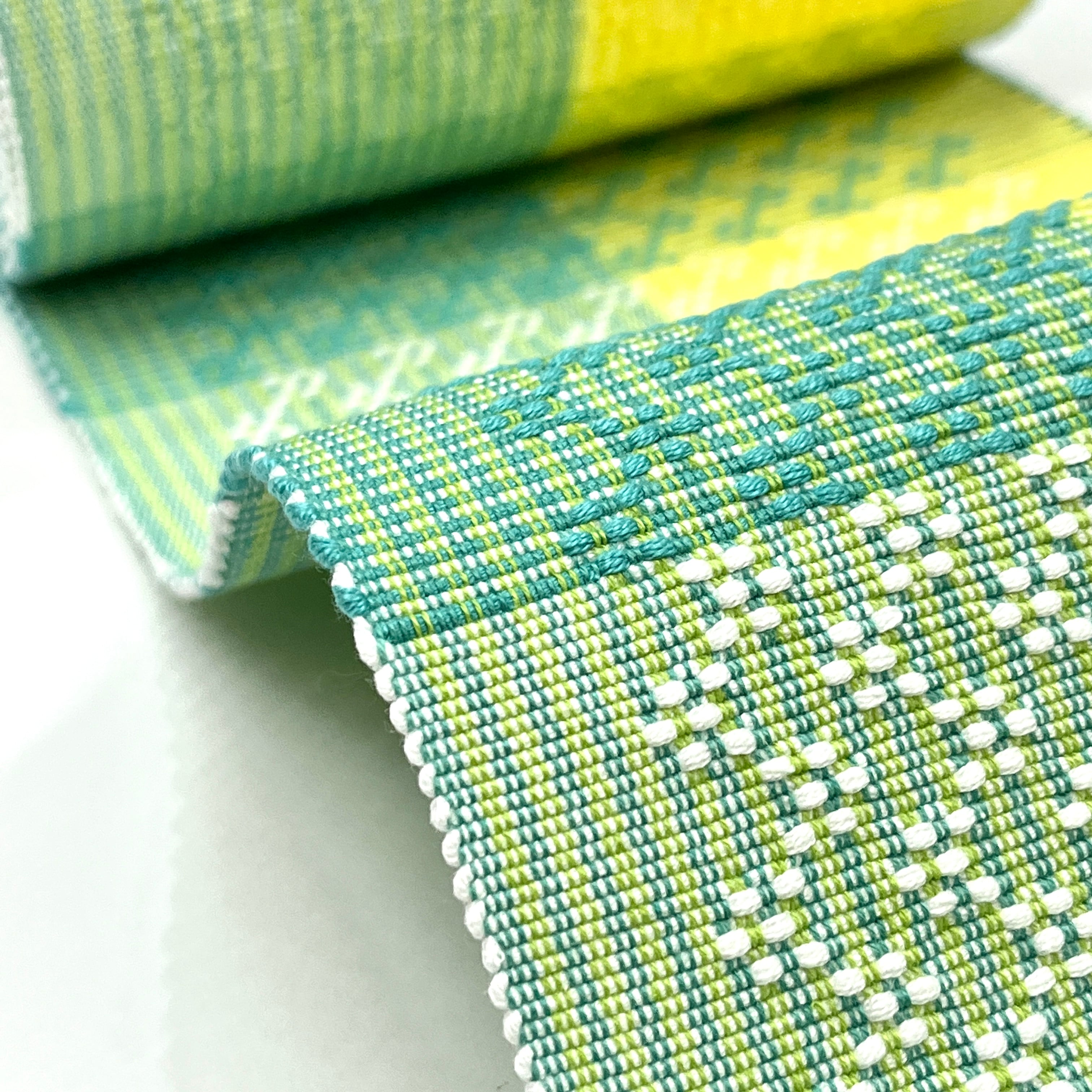 緑、黄色の変わり千鳥格子の中に、白と緑青の花織がたくさん浮き織り出された、可愛さと洗練された雰囲気の『首里花織の半幅帯』です。