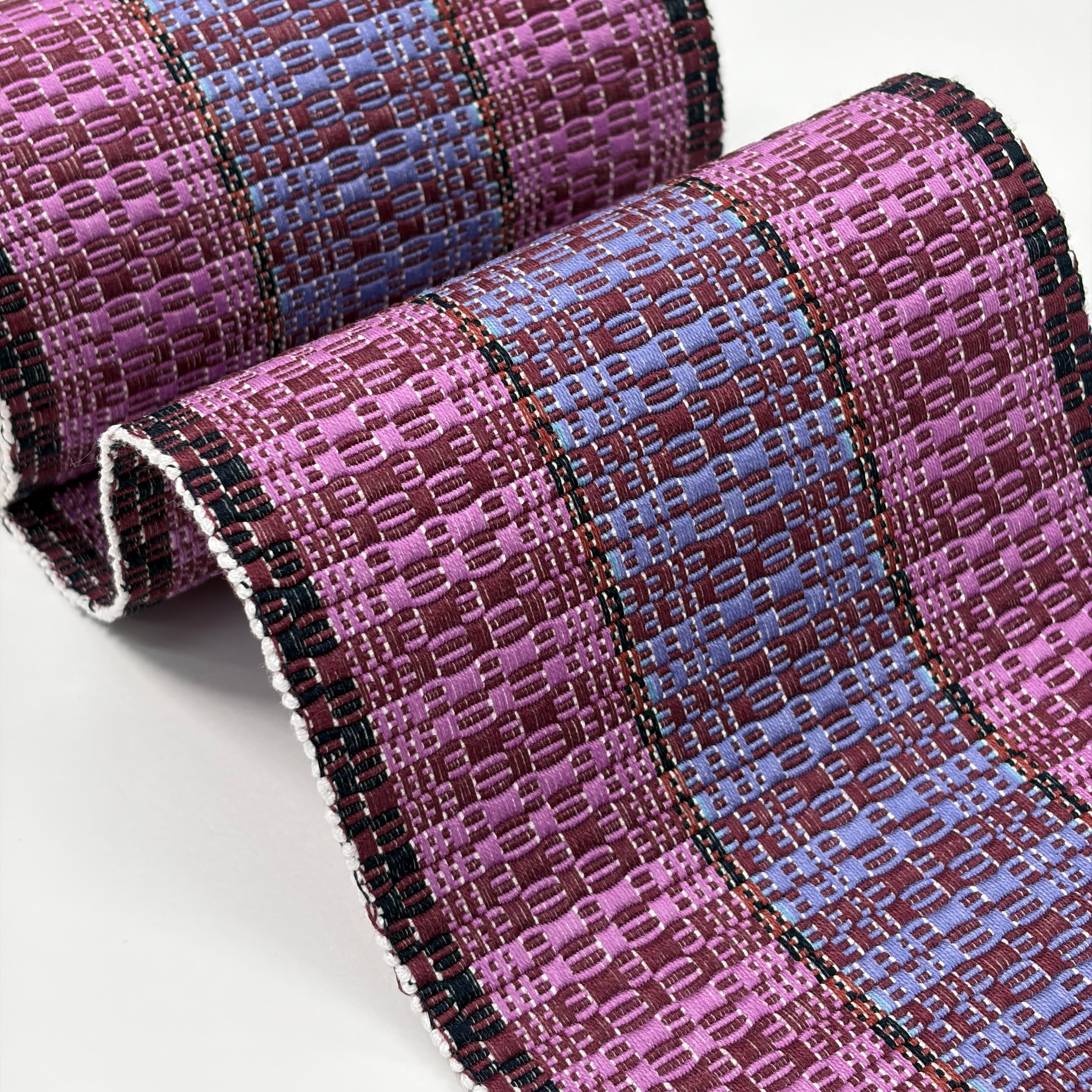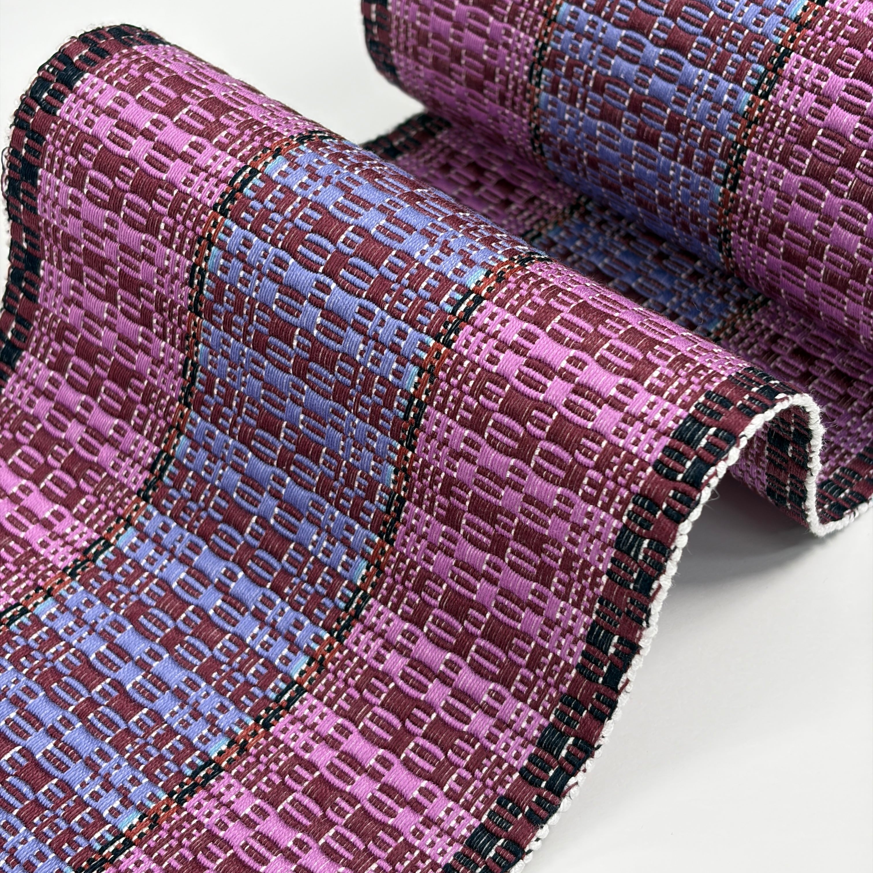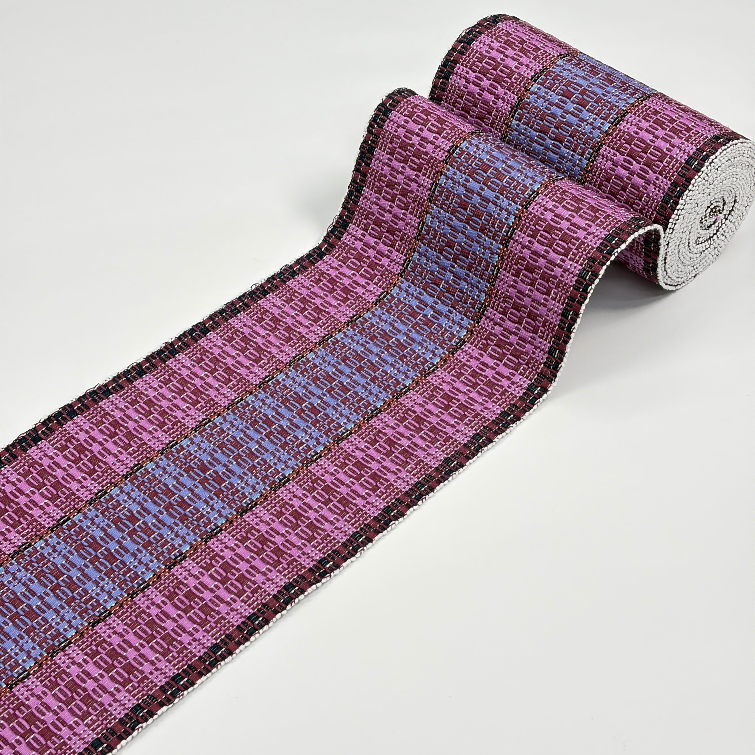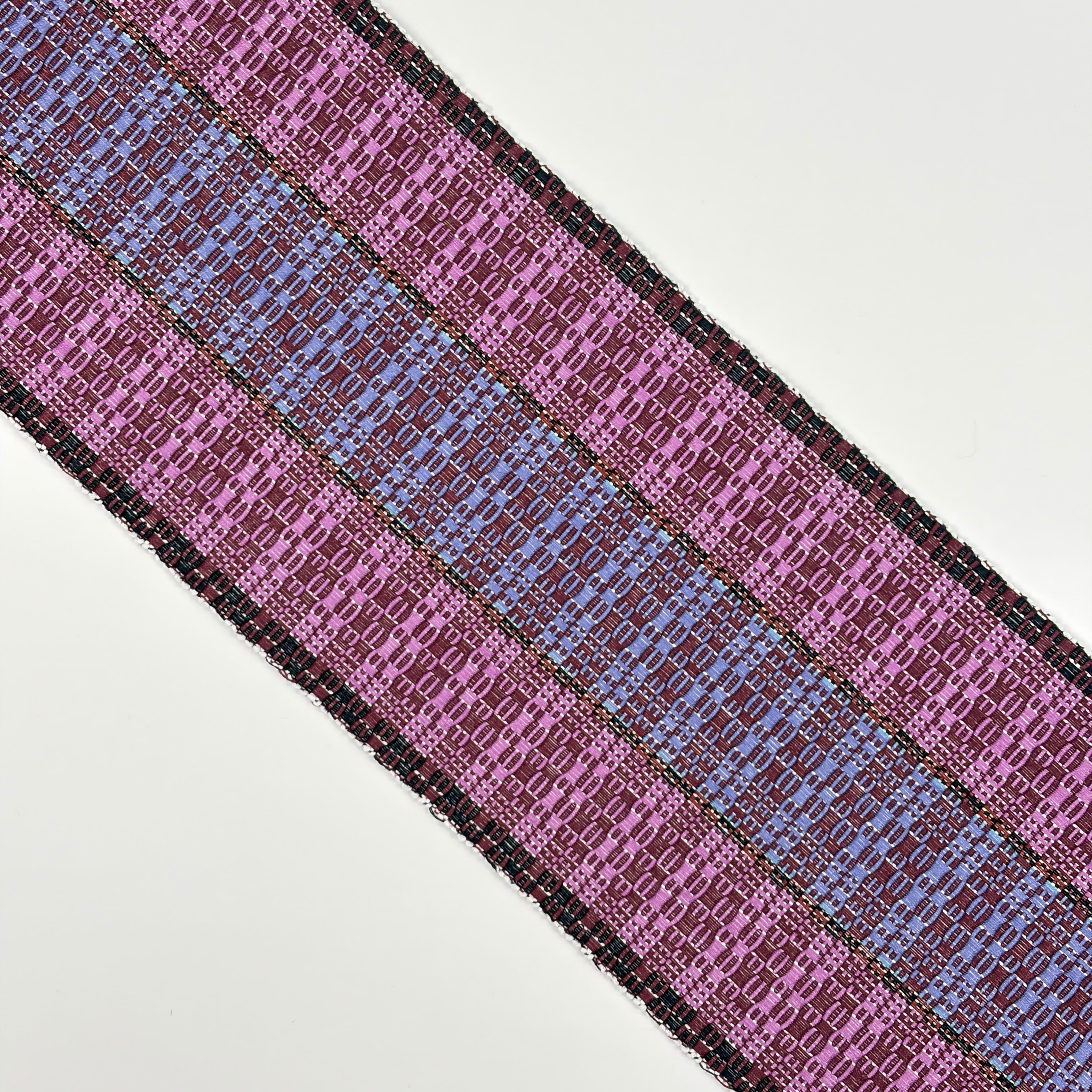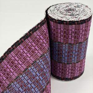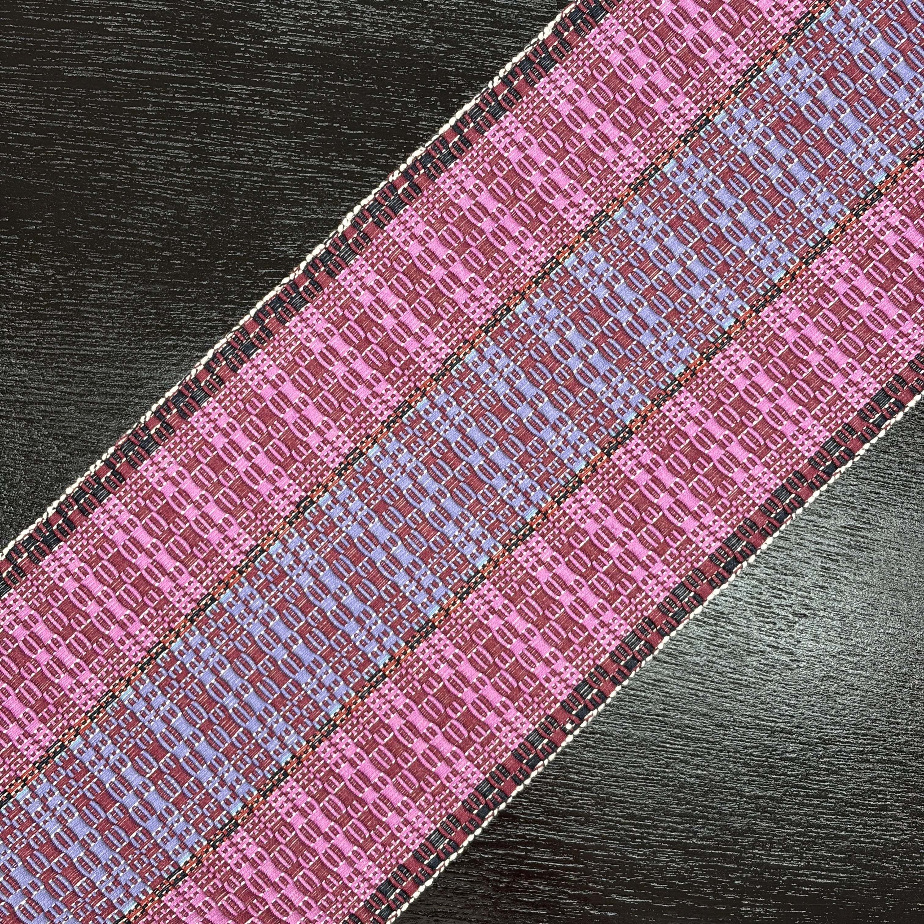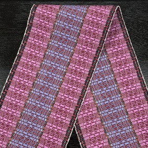 赤紫、菖蒲色(あやめいろ)、紅碧(べにみどり・灰みの青紫系)、黒で全体赤紫系の『首里道屯織の半幅帯』です。その中でも技術と手間が必要な『総道屯』となっています。