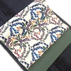 太鼓部分と胴巻き部分のクリーム色の地色に「リュウキュウアセビ」を紫、臙脂、深緑、藍、茶、オレンジといった色数は多いですが落ち着いた色合いで型染めし、たれを薄く灰色がかった虫襖色(暗い青みのある緑色)で渋い雰囲気に仕上げています。