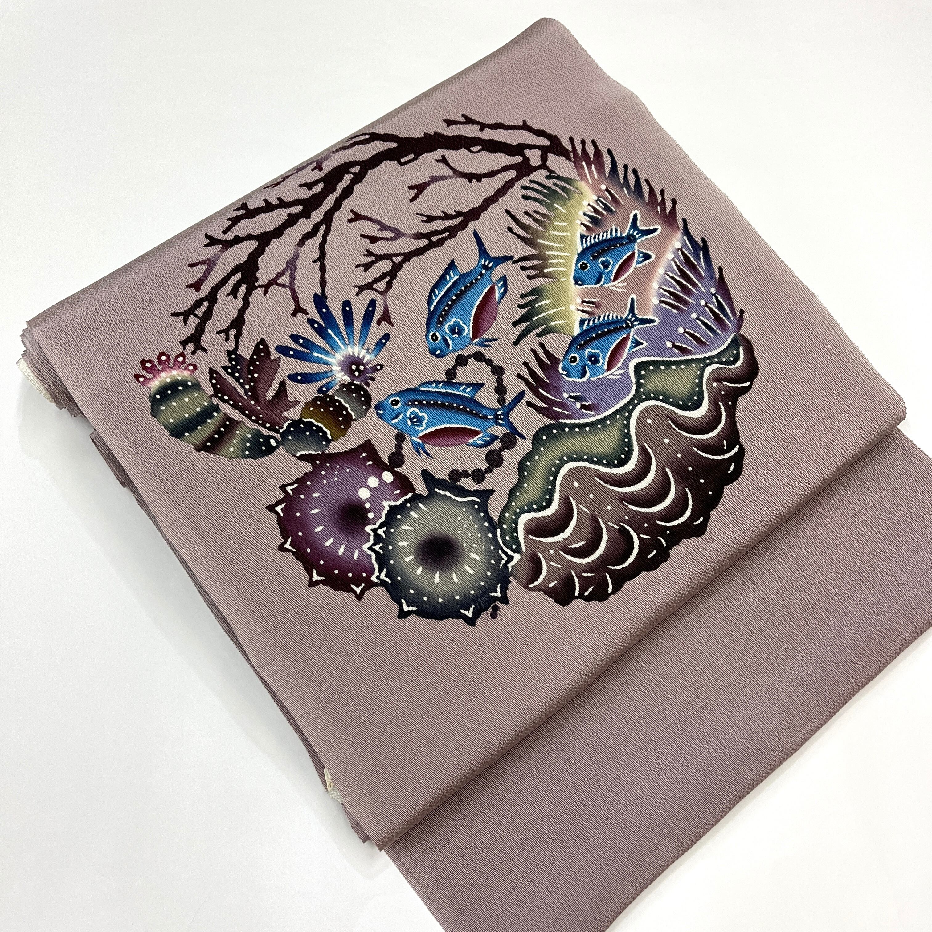 鳩羽鼠色(グレーがかった薄紫色)の地色に紫、臙脂、深緑、抹茶色、藍、青、茶といった色で海のモチーフを描き、色数は多いですが、華やかな明るい色使いが多い琉球紅型の中でも落ち着いた色合いで型染めしています。