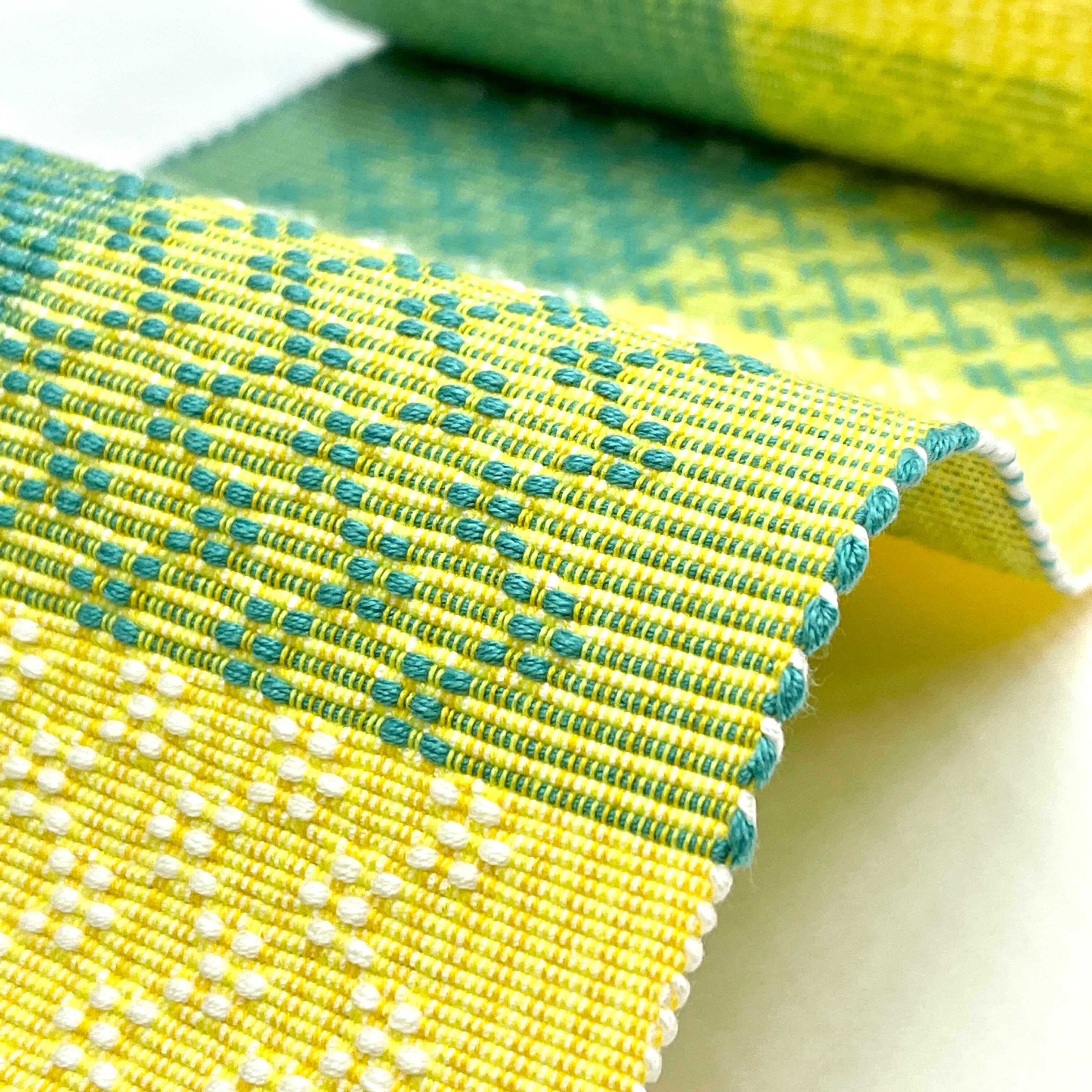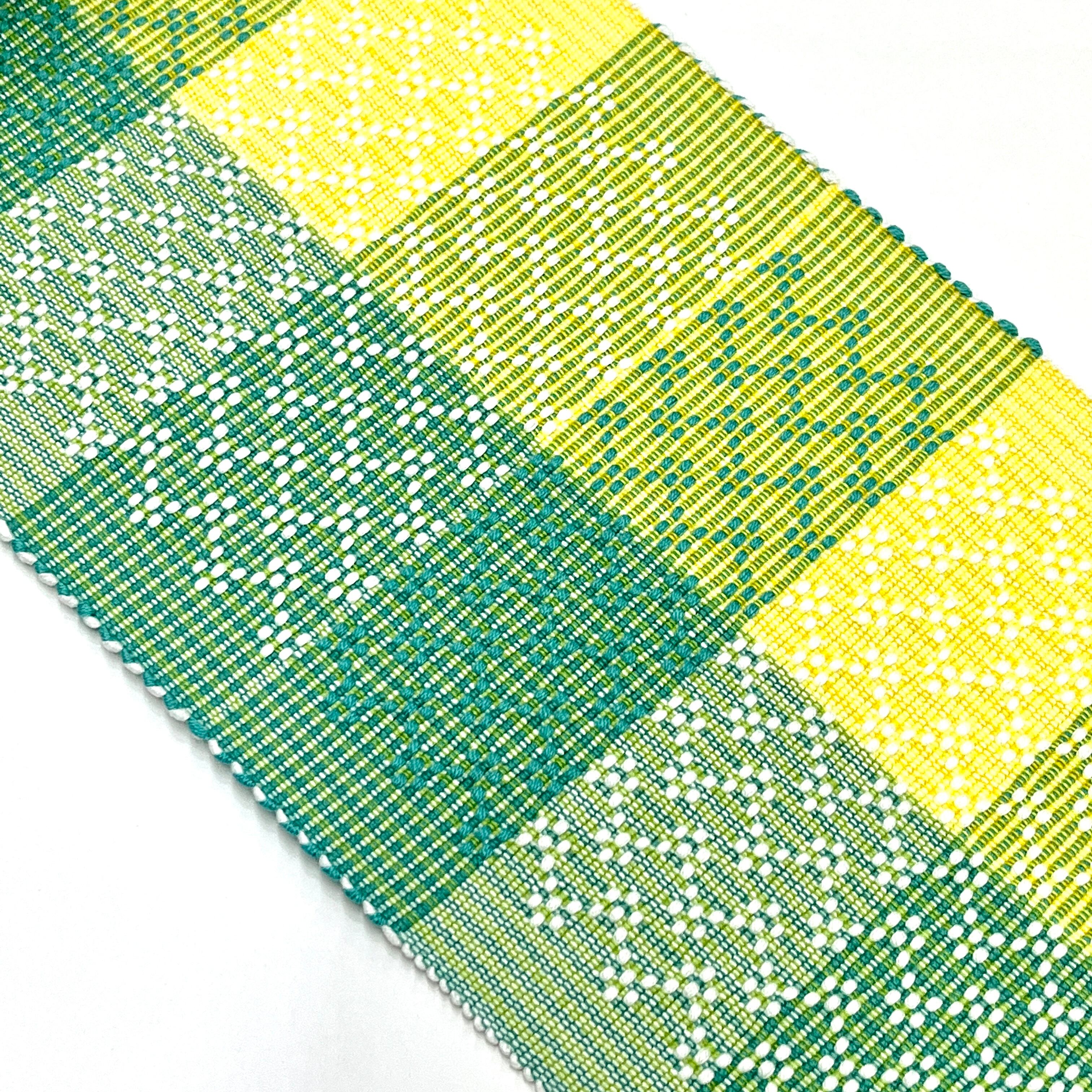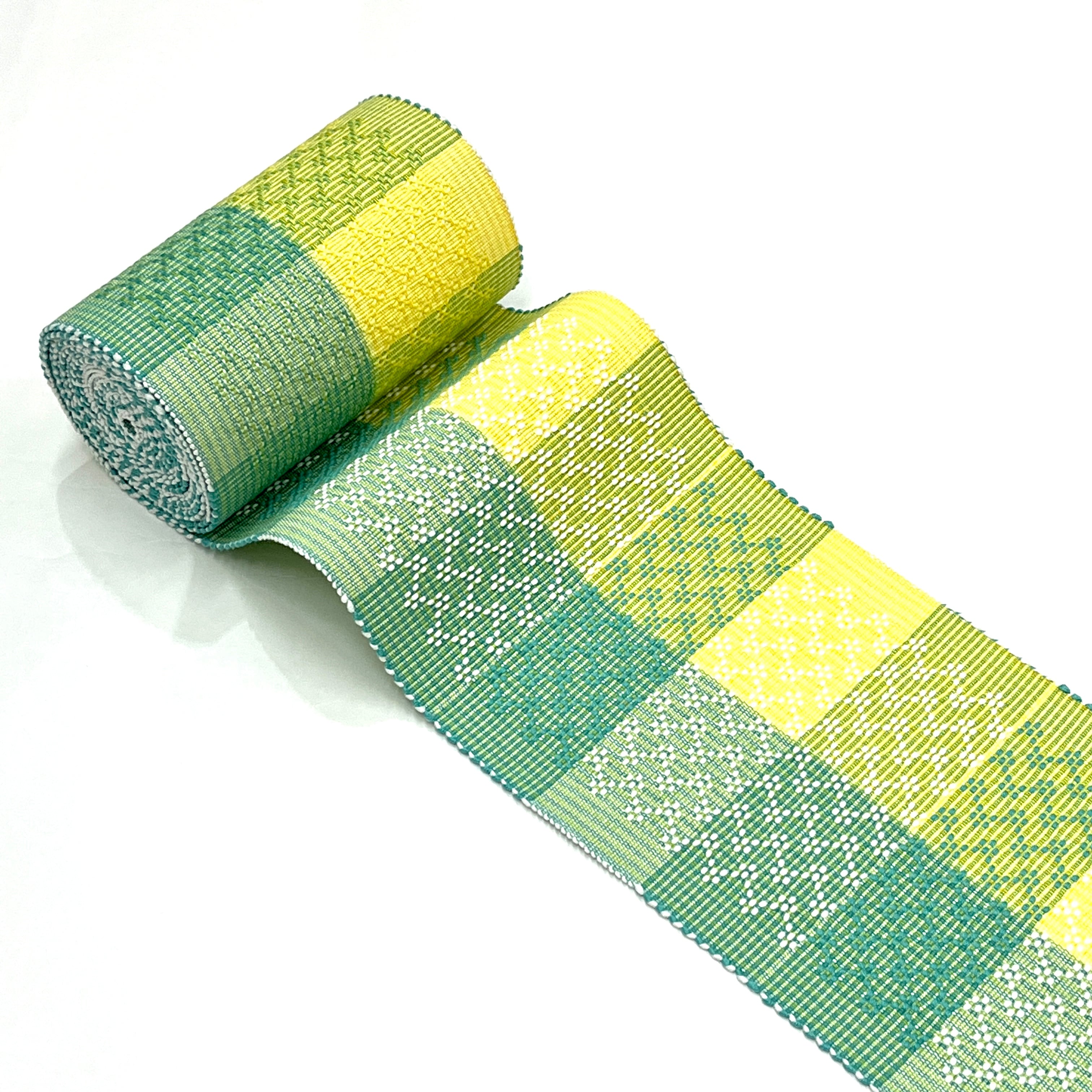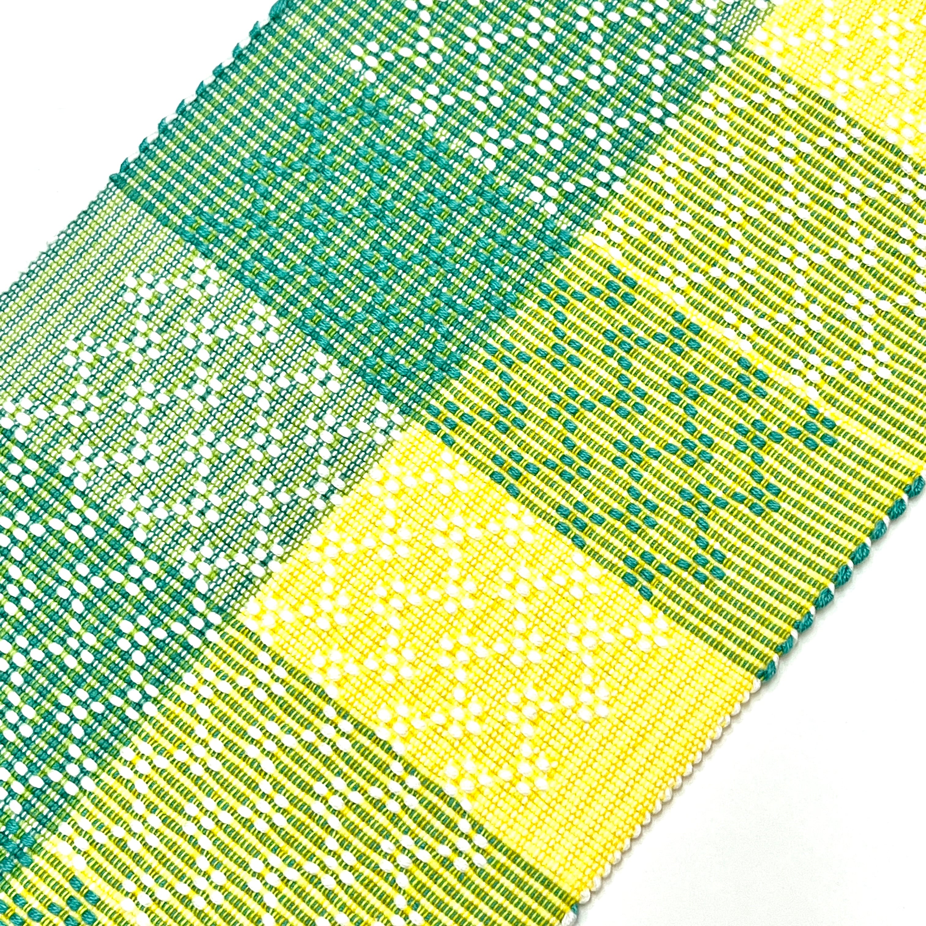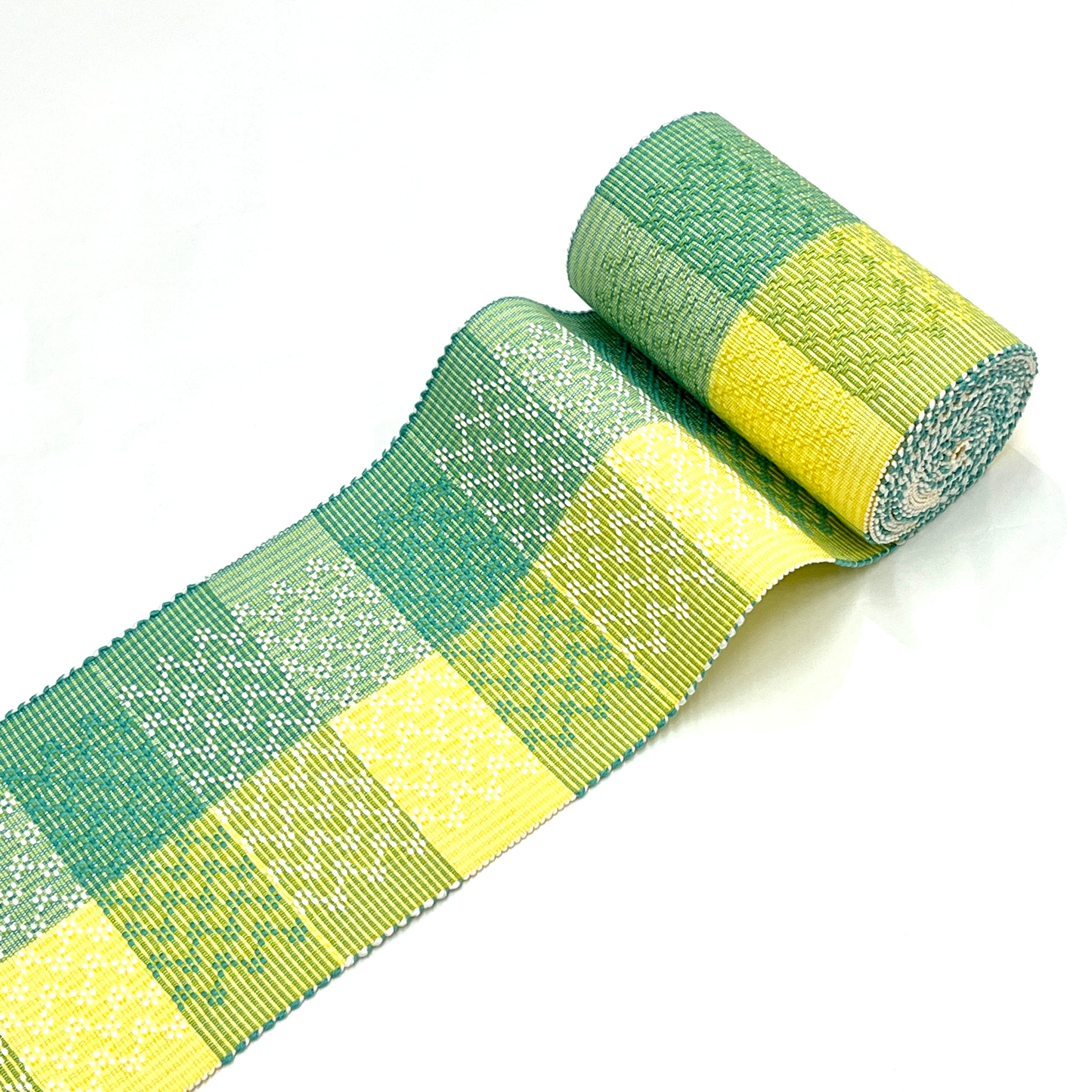 緑、黄色の変わり千鳥格子の中に、白と緑青の花織がたくさん浮き織り出された、可愛さと洗練された雰囲気の『首里花織の半幅帯』です。