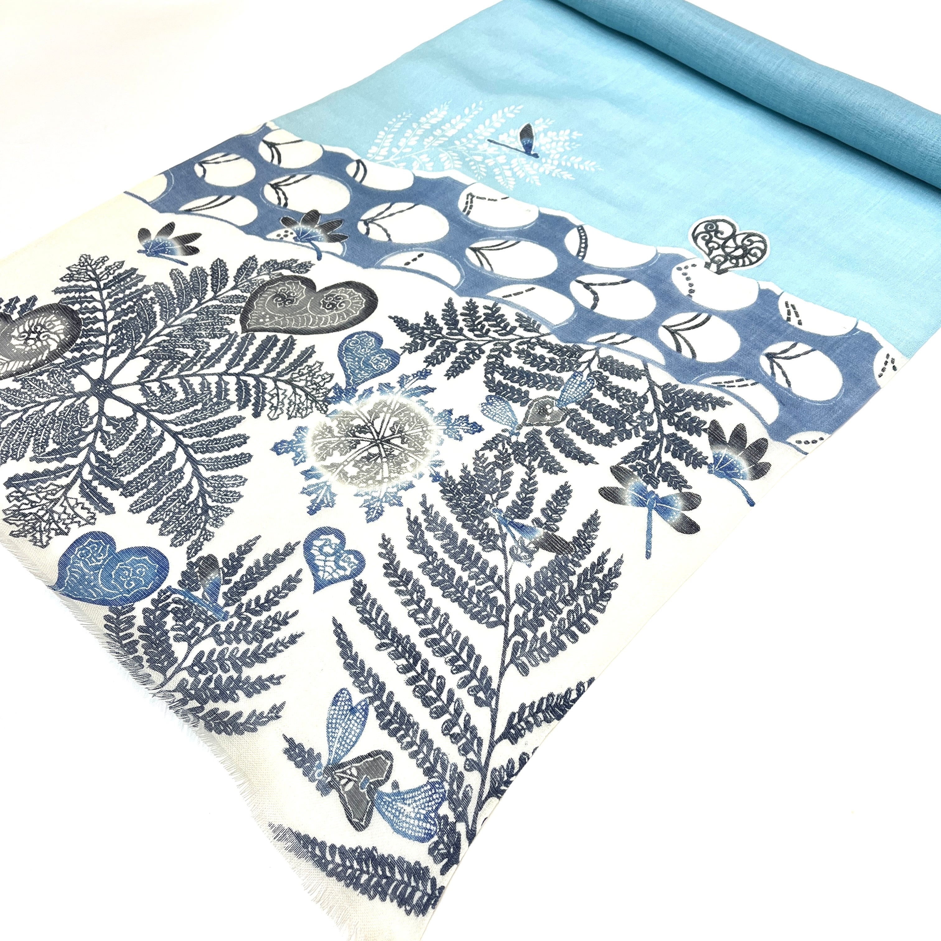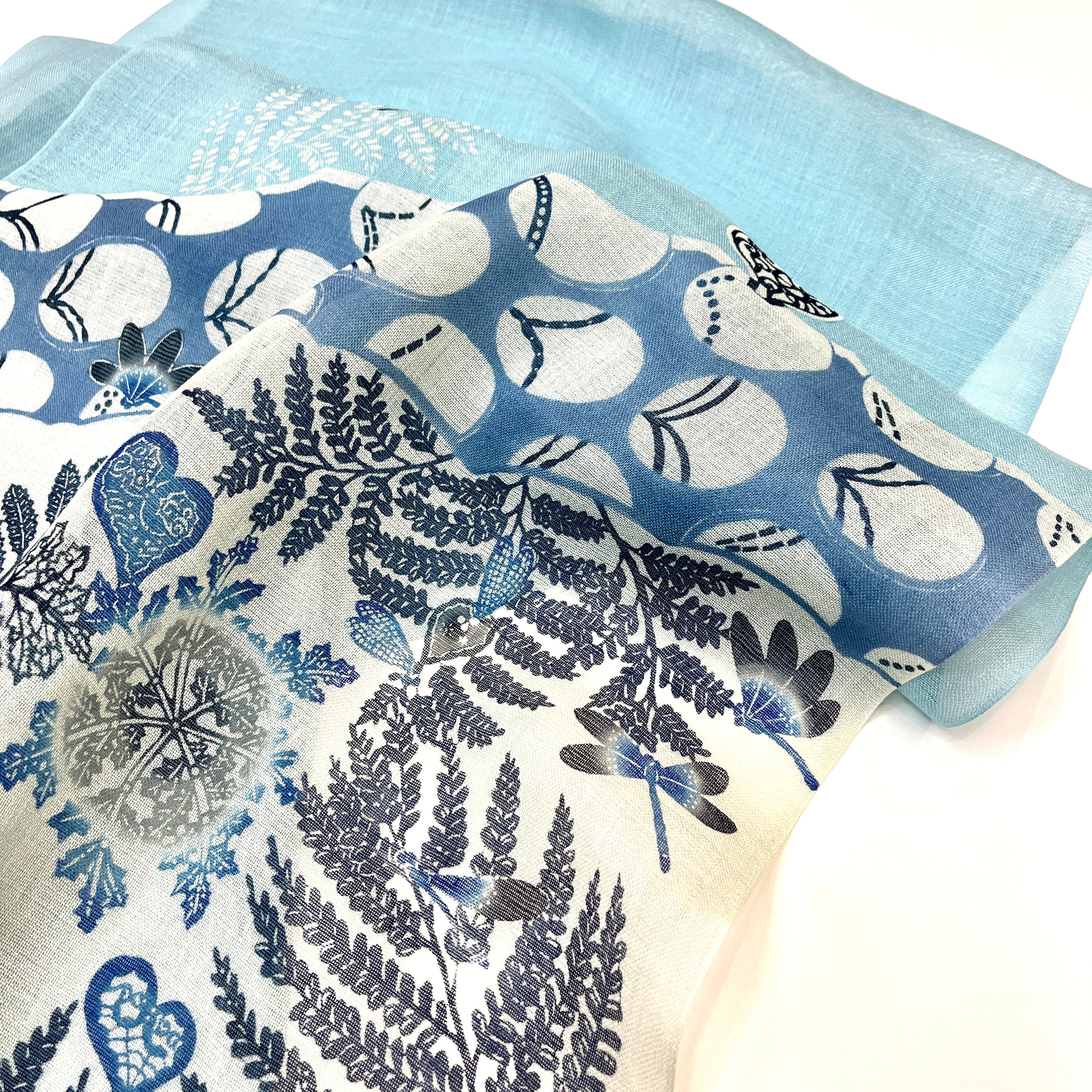 タッサーシルクという野蚕繭の絹地に、やんばるに生息する植物リュウキュウヒカゲヘゴやリュウキュウハグロトンボといった生き物たちを活き活きと描き琉球紅型で染めた『本場琉球紅型ショール」です。