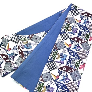 無地部は、灰みがかった青藍で、帯結びの時に現れる対照的な雰囲気が楽しいと思います。