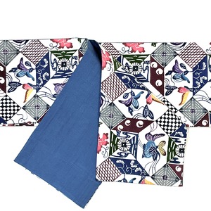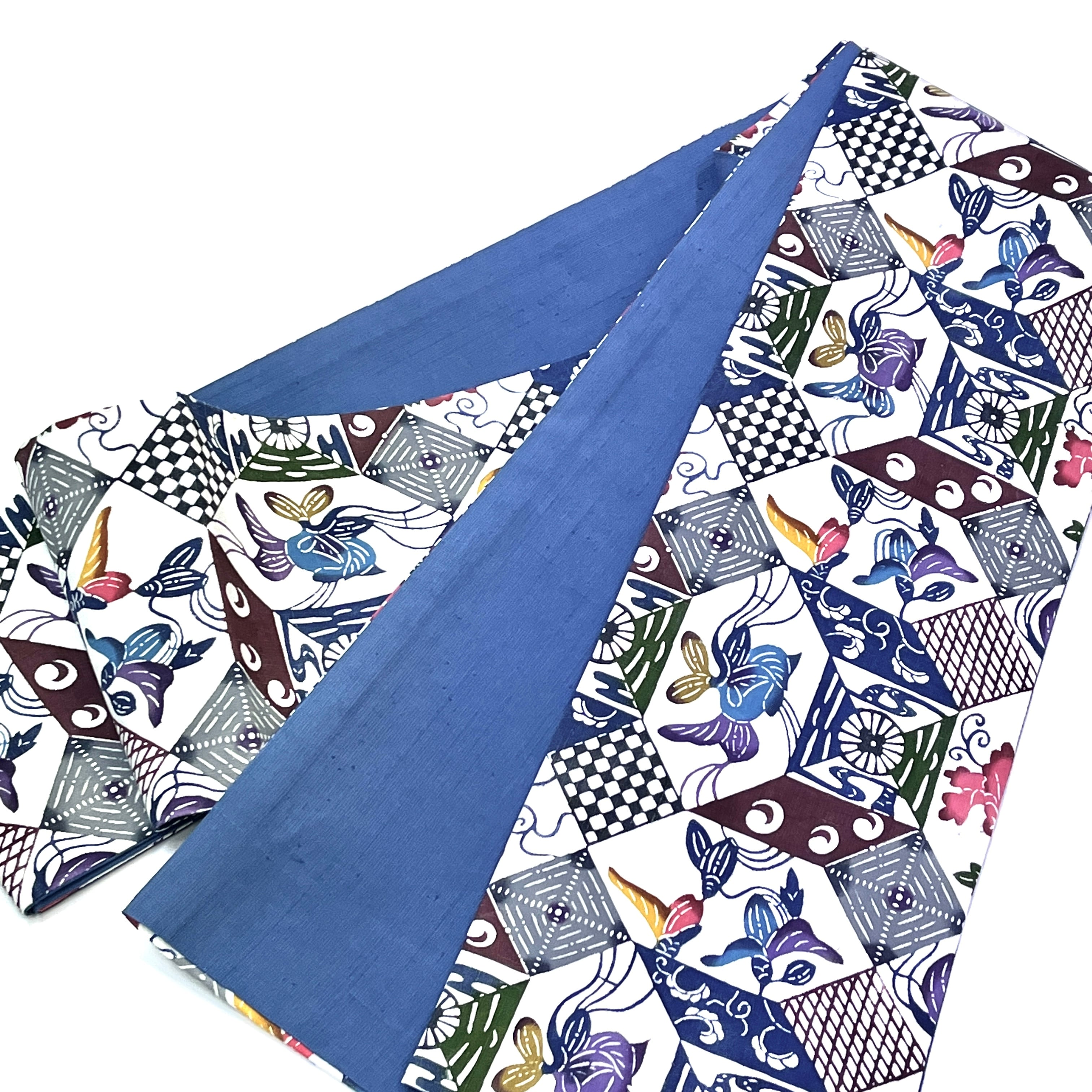 柄部は、生地の色(オフホワイト)に、濃藍、青、墨色、水色、暗いワイン色、黄土色、深緑、紅といった落ち着いた色合いで型染めしました。全通です。六通名古屋帯と同じくらいの作業量あります。