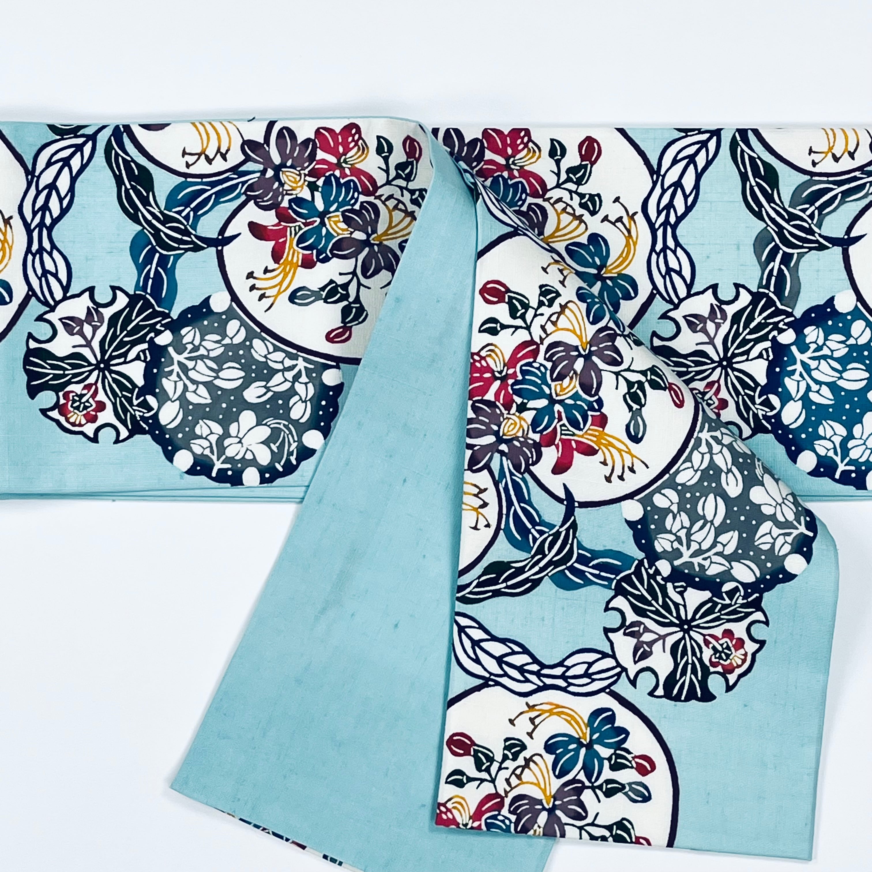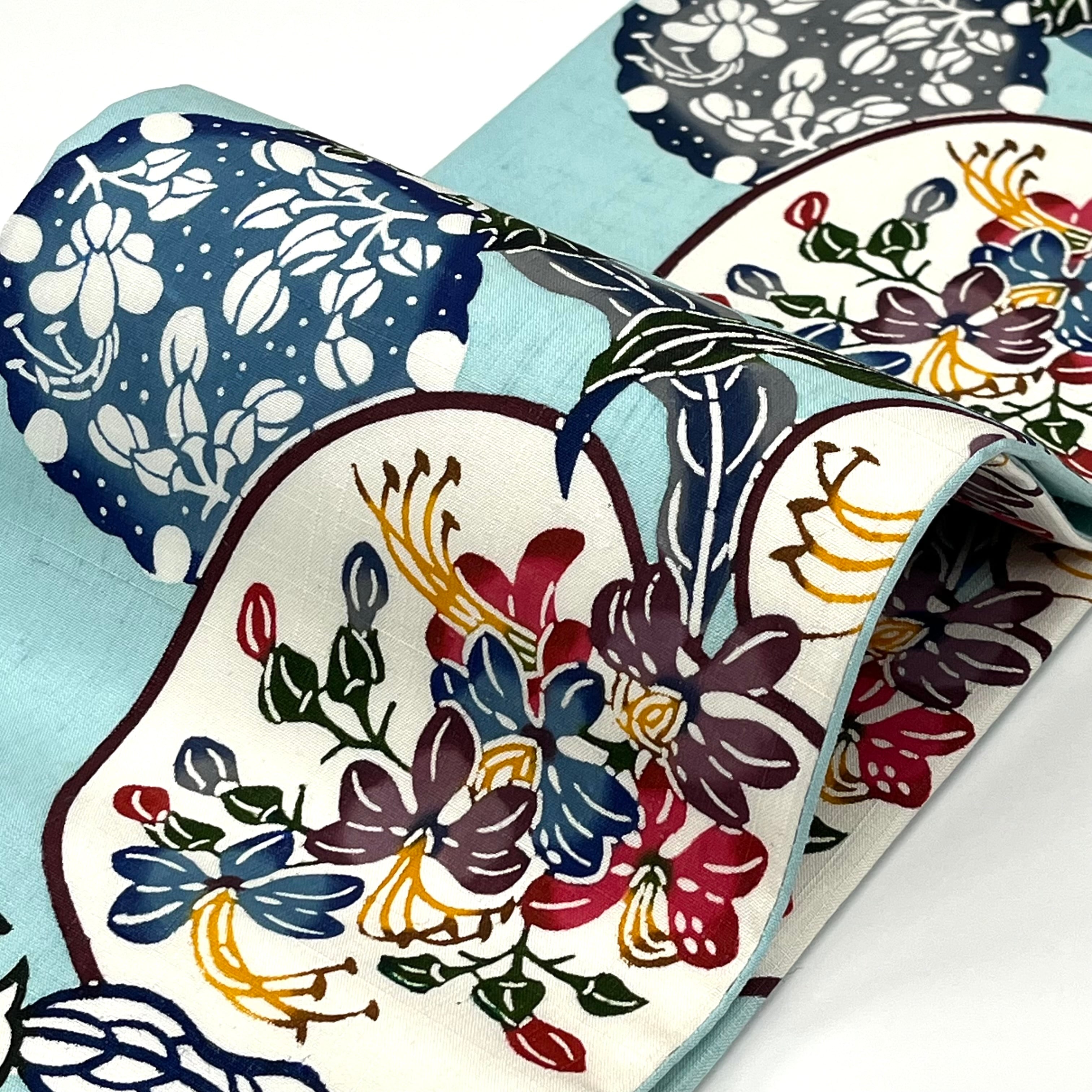 柄部は、明るい新橋色(薄い水色)の地に、濃藍、青、紫、赤紫、墨色、水色、茶、黄土色、深緑、紅といった色合いで型染めしました。全通です。六通名古屋帯と同じくらいの作業量あります。