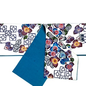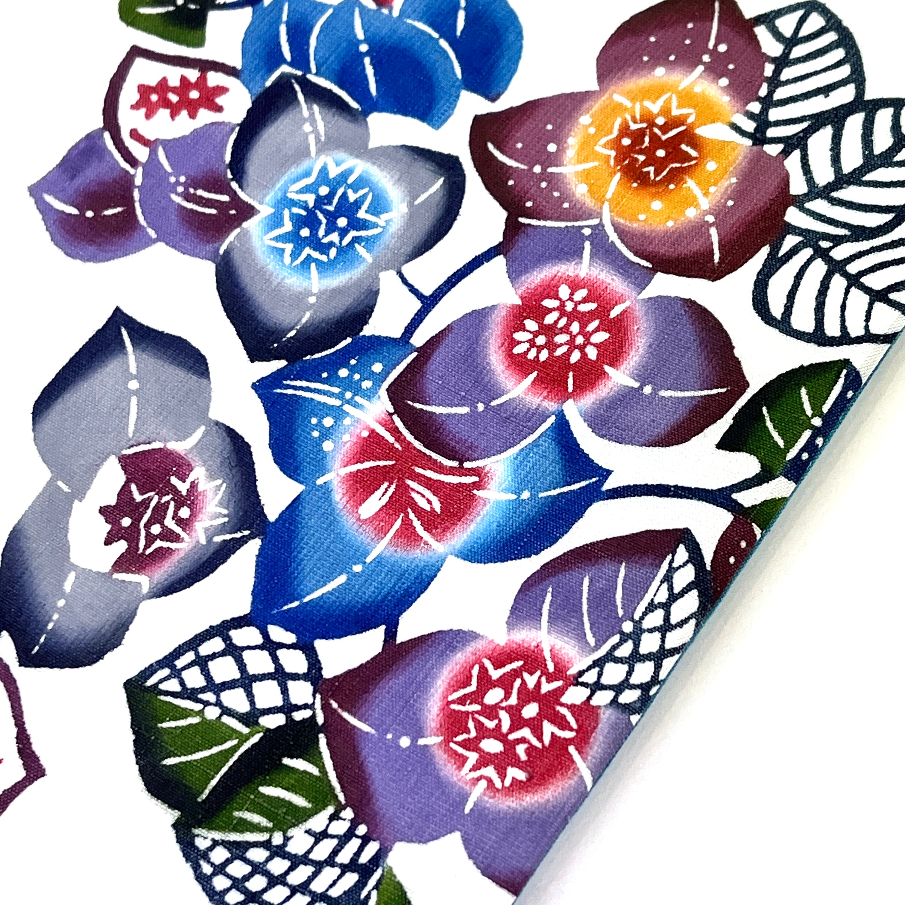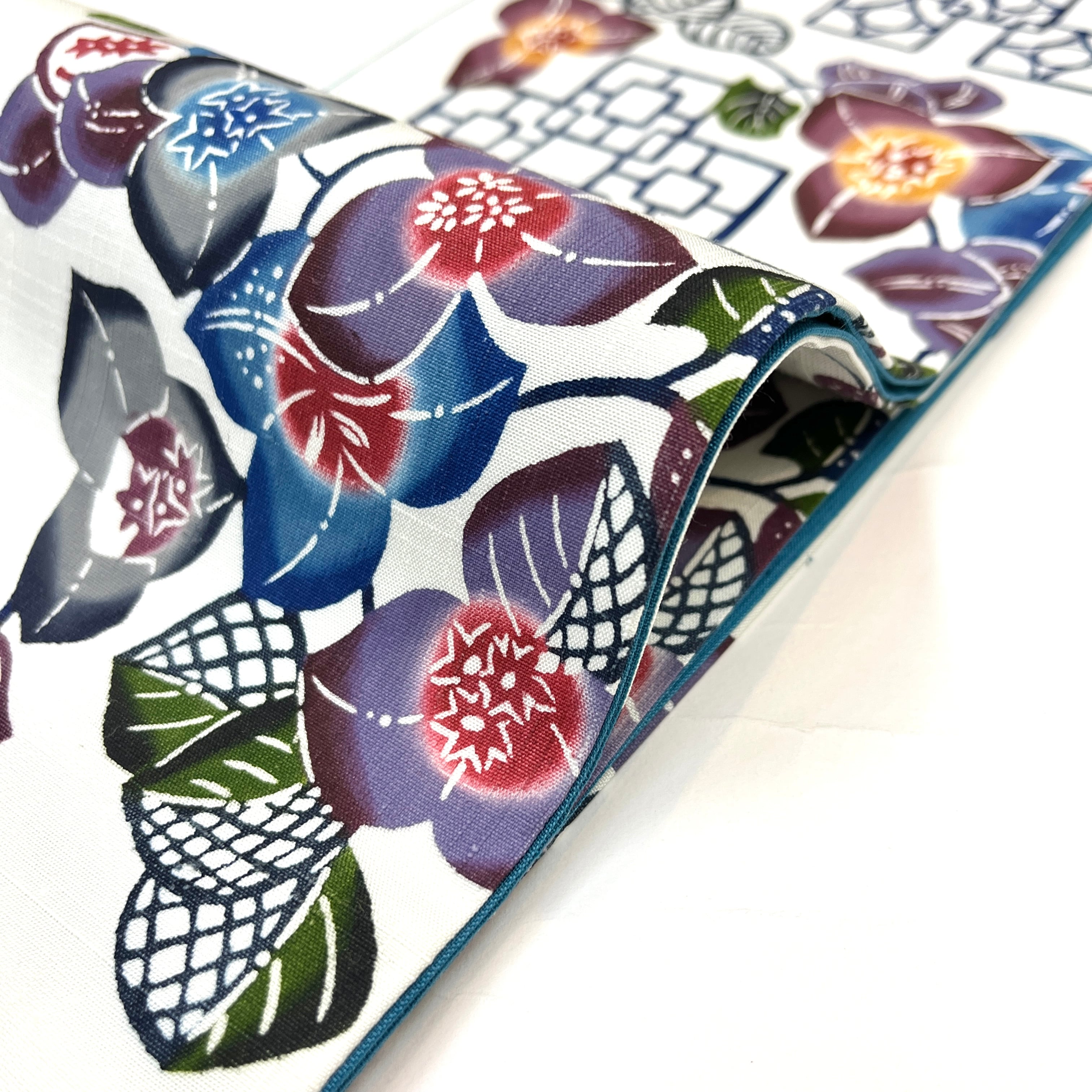 柄部は、生地の色(オフホワイト)に、本来ならピンク系の花ブーゲンビリアを藍、青、墨色、グレー、茶、黄土色、鳩羽色(灰みの紫色)、暗紅色(暗い赤紫系)、深緑といった色合いで表現し、花ブロックを濃紺の線で表現し、型染めしました。全通です。六通名古屋帯と同じくらいの作業量あります。