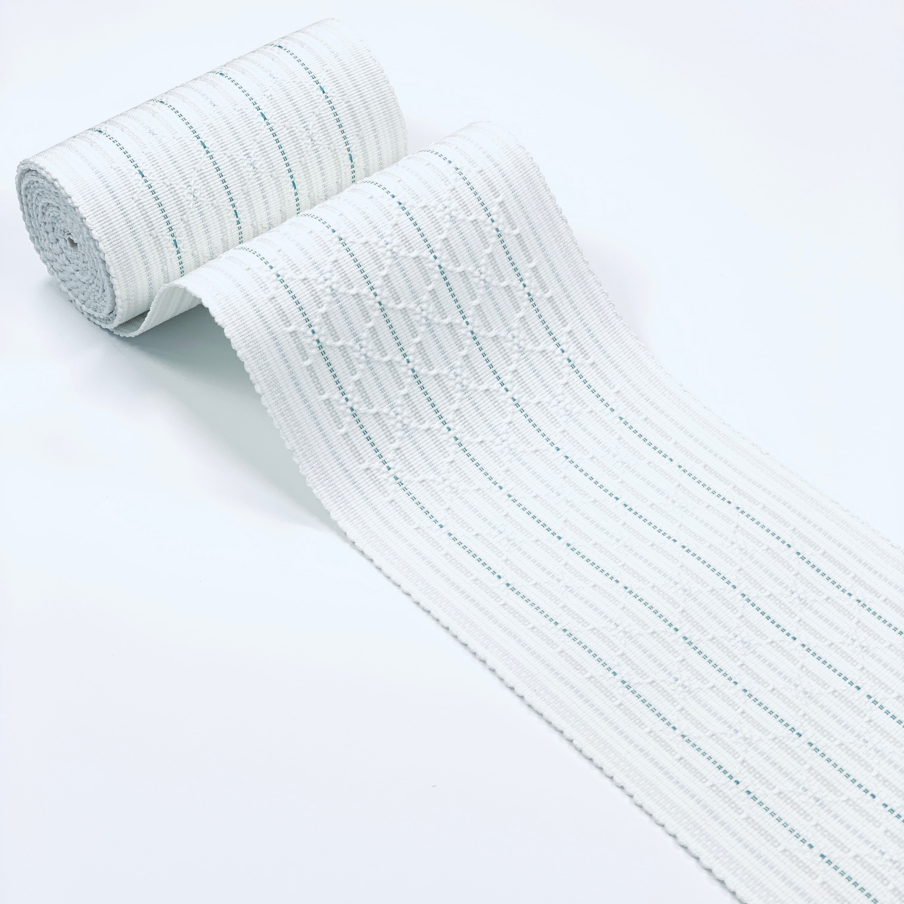 白地に、網目紋様のような丸い花織が全体的に浮き織りされ、ミントグリーンの細い線が素敵なアクセントになった、透明感があり清々しい『首里花織の半幅帯』です。