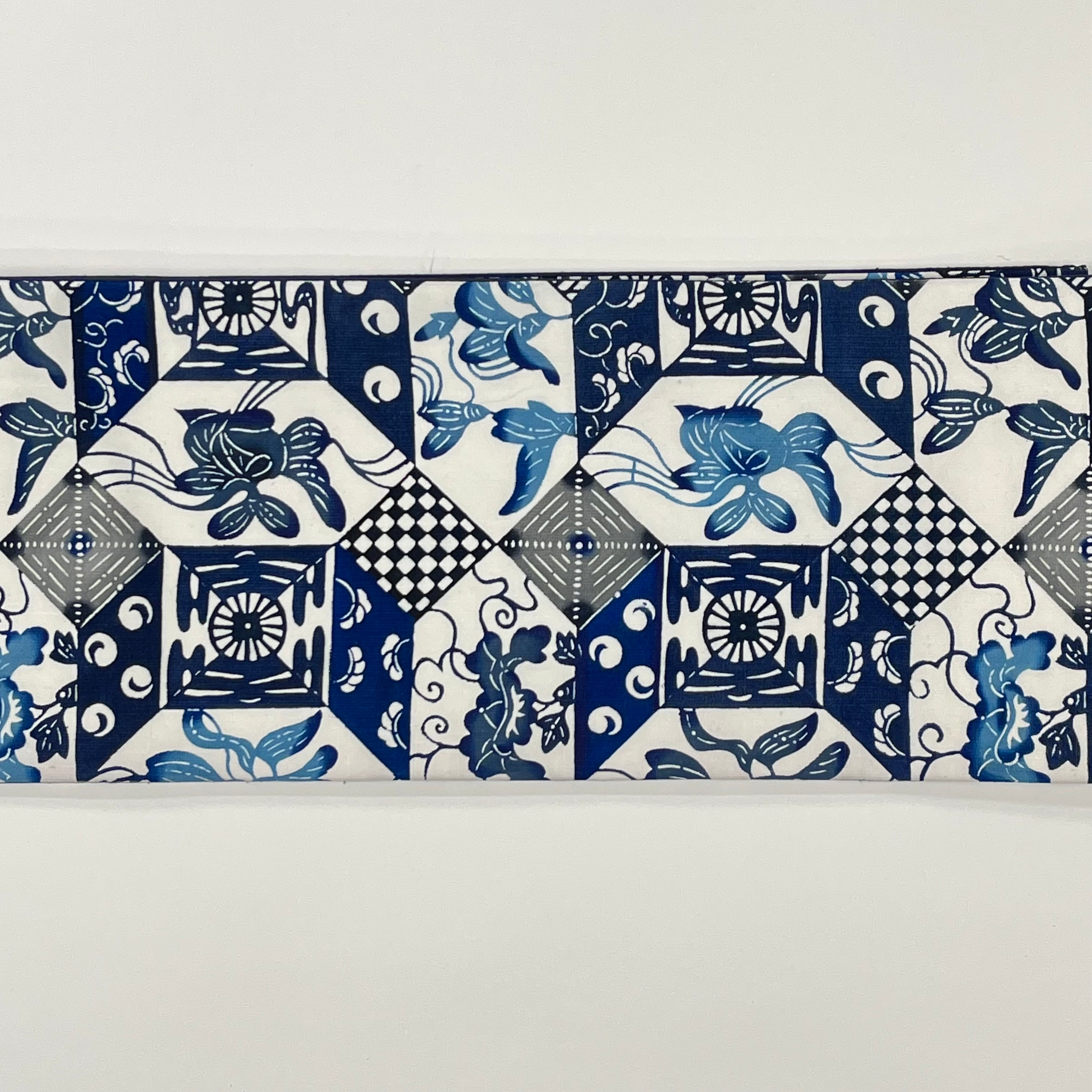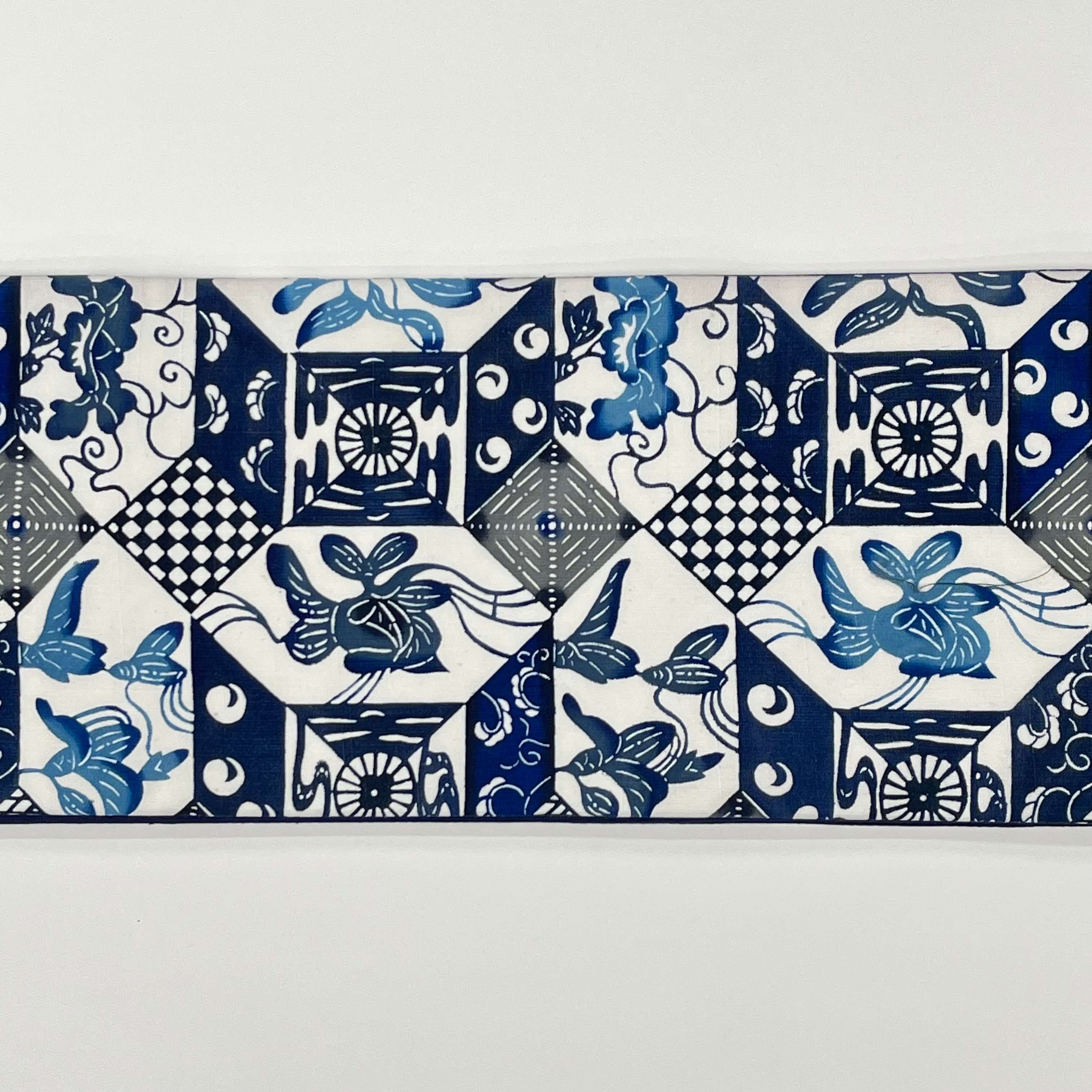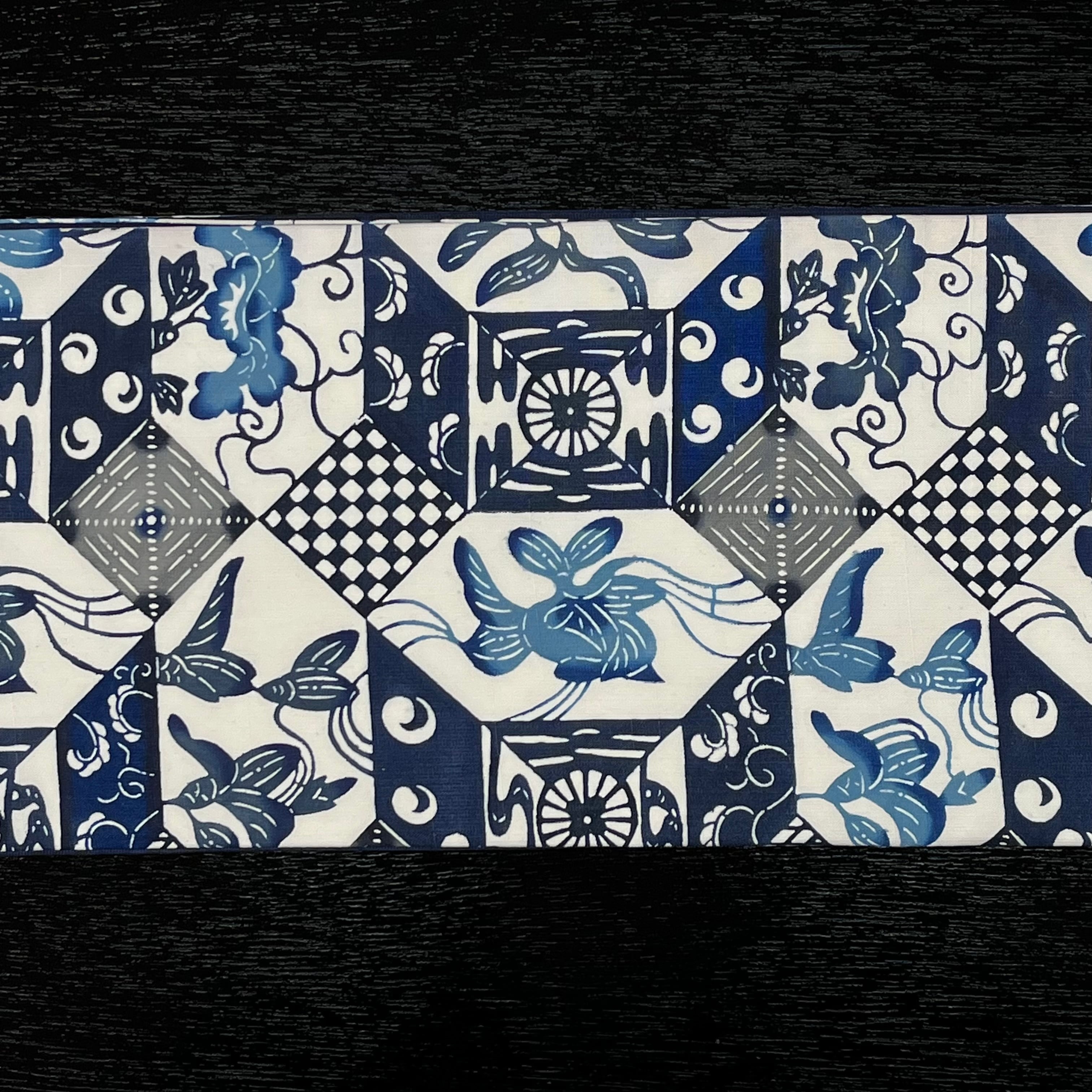 表側の柄部は、全通で、生地の色(オフホワイト)に、濃藍、墨色といった落ち着いた色合いで濃淡を出しながら型染めしました。全通です。六通名古屋帯と同じくらいの作業量あります。