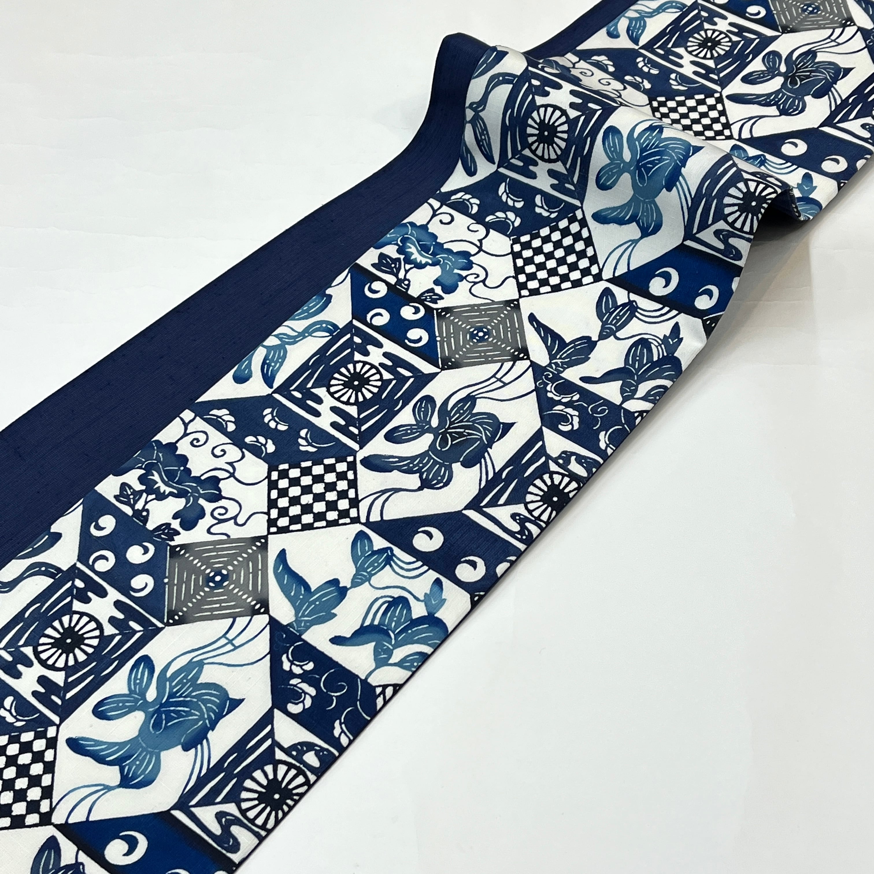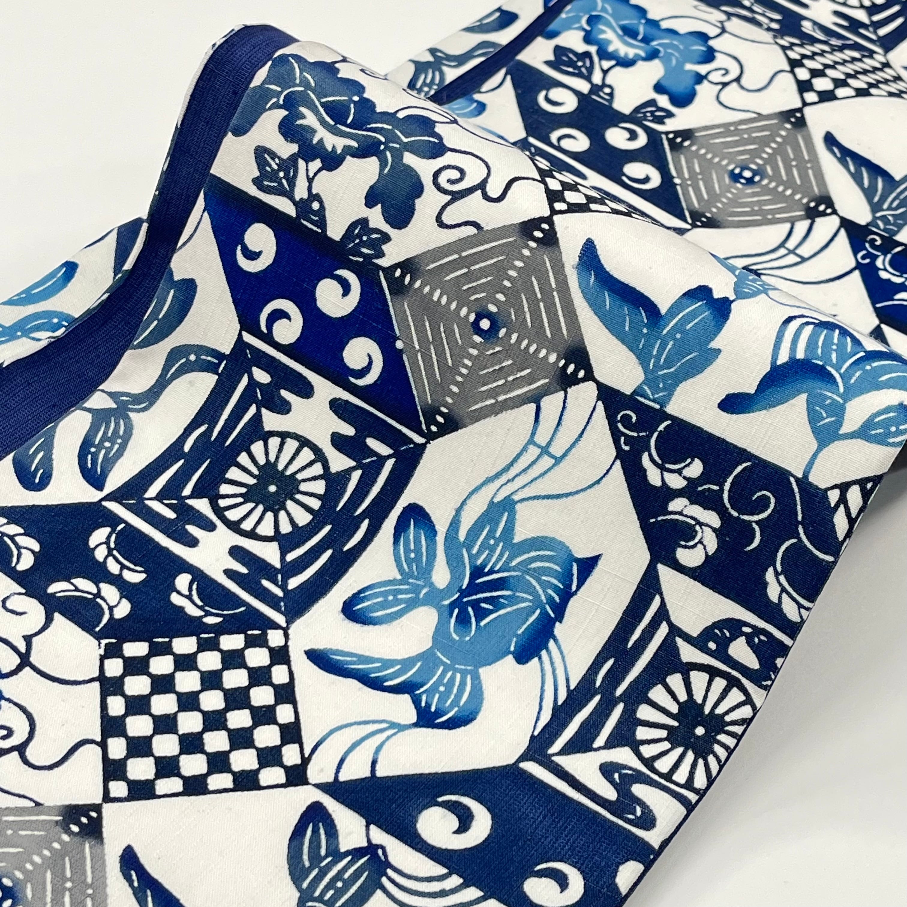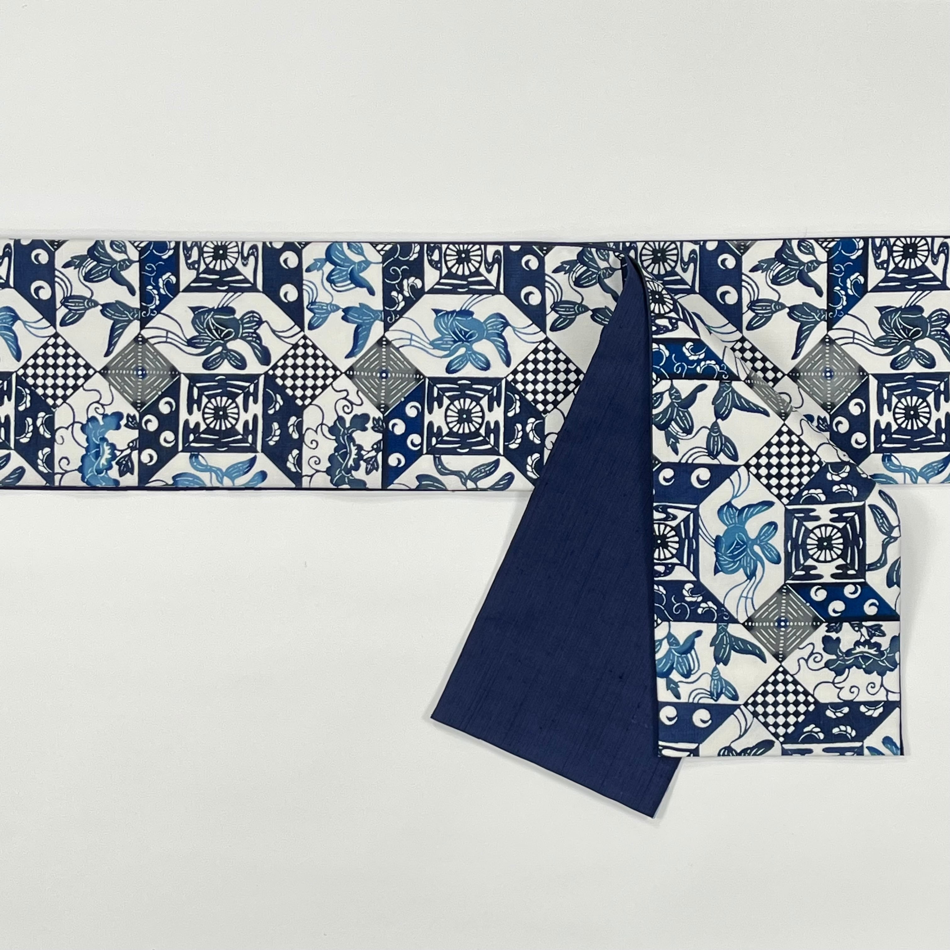 裏側の無地部は、濃藍で、帯結びの時に現れる対照的な雰囲気が楽しいと思います。